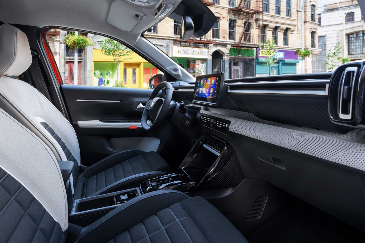 No interior também há novidades, onde podemos ver implementado o novo conceito “C-Zen Lounge” da marca, e a primeira coisa em que reparamos é a ausência de um painel de instrumentos convencional. O ë-C3 utiliza um pequeno head-up display, que é projetado num painel negro ao fundo do tabliê, e não no vidro do para-brisas como é habitual. Esta solução, segundo os responsáveis da Citroën, elimina não só a dificuldade de leitura contra superfícies brancas, mas também a duplicação desnecessária de informação, mostrando apenas aquela que é essencial durante a condução.