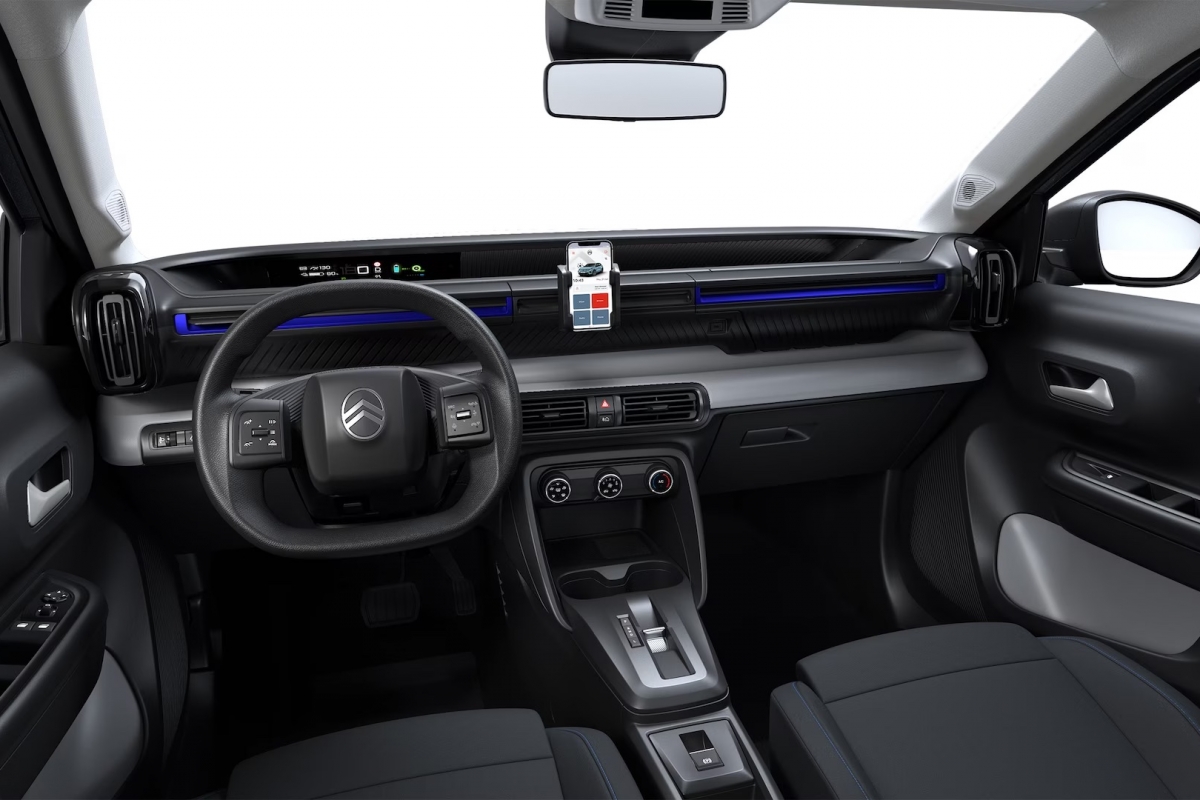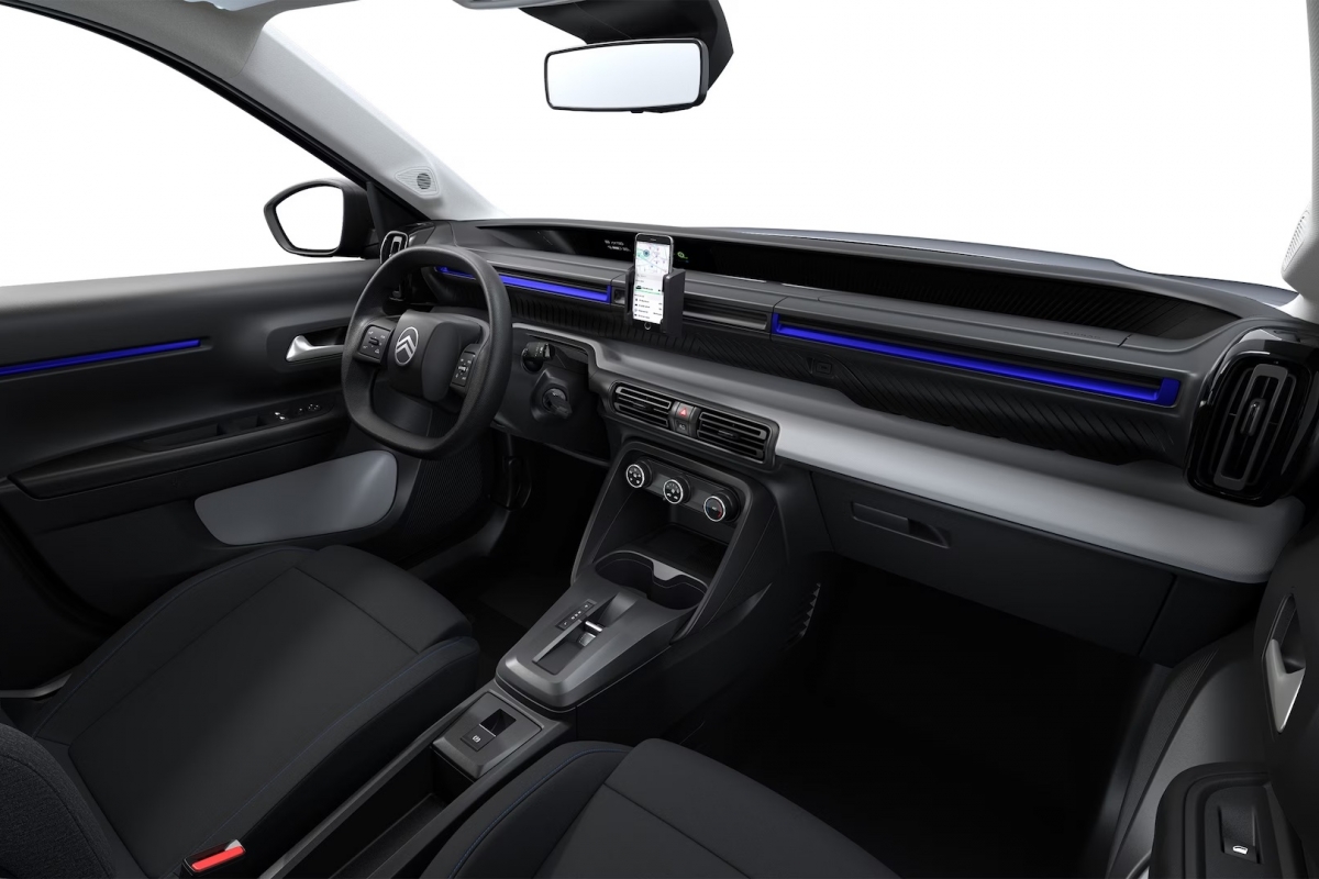 Ao centro do tabliê em baixo encontramos controlos físicos para a climatização, e mais acima está um ecrã tátil de 10,25 polegadas que serve exclusivamente para o infoentretenimento. Para além da compatibilidade com Android Auto e Apple Carplay tem a aplicação dedicada MyCitroën. Esta aplicação, permite não só pré-aquecer ou pré-arrefecer o veículo antes da partida, como gerir os horários de carregamento, monitorizar o estado da carga e mostrar a localização do veículo.