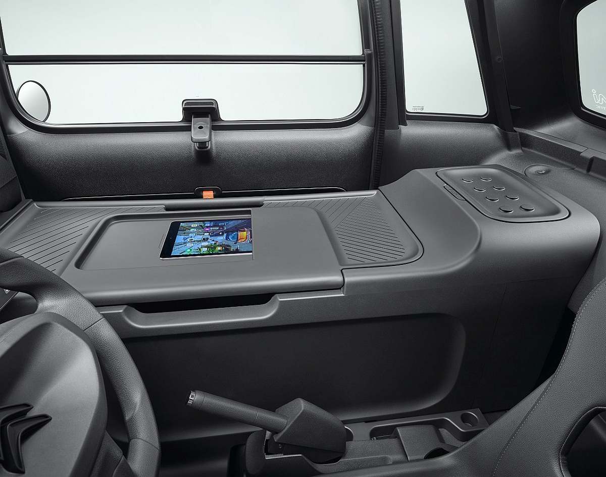 A divisória vertical separa a área destinada ao condutor da zona de carga, protegendo-o dos objetos transportados ao seu lado, ao mesmo tempo ficando abaixo da linha do corpo para uma visibilidade desimpedida a 360°. A prateleira modular que funciona, igualmente, como cobertura, suporta um peso máximo de 40 kg e transforma o habitáculo num verdadeiro escritório móvel, permitindo guardar documentos em formato A4, tais como notas de entrega, livros de encomendas, bem como um tablet. A prateleira pode, ainda, ser dobrada para que se possa armazenar artigos mais altos, colocados atrás do assento.