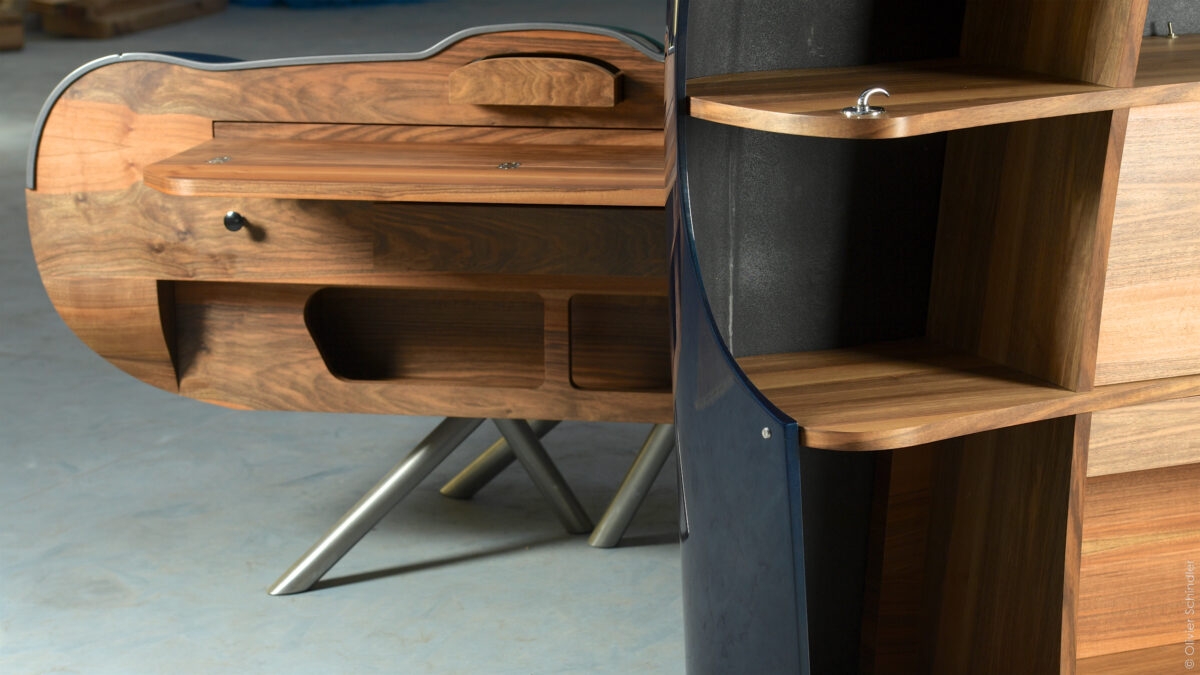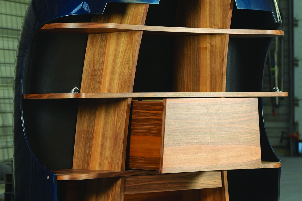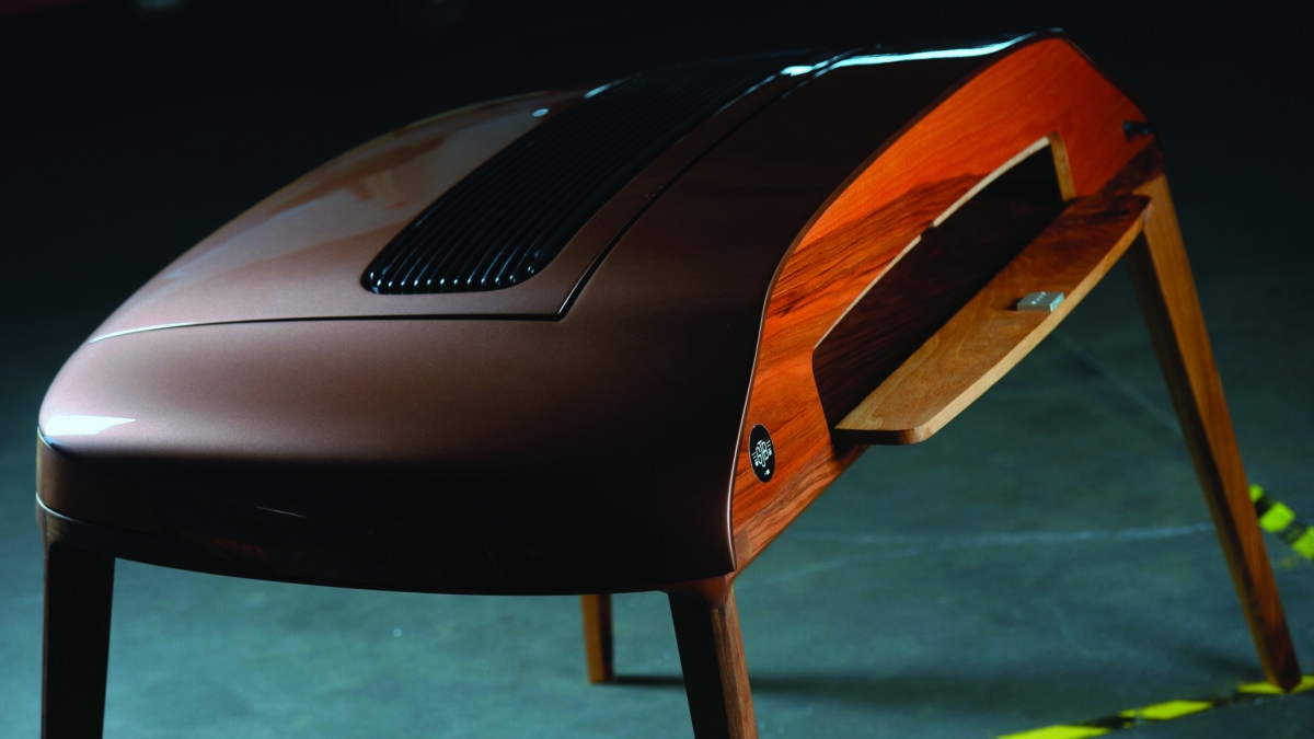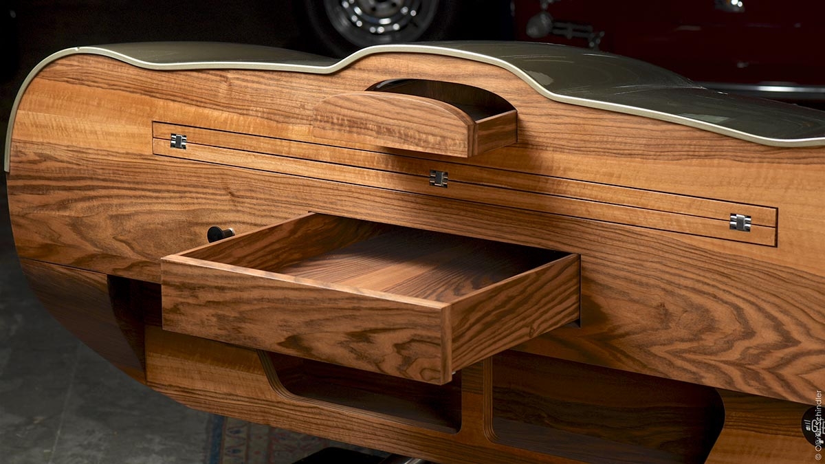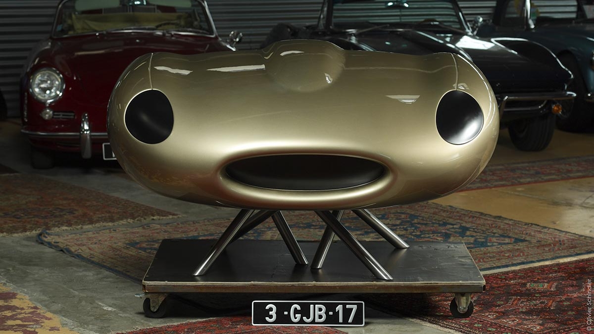 Uma secretária feita a partir do painel traseiro de um Porsche 911, em que não falta a chave igual à do carro para abrir o tampo, uma estante e um minibar que já foram a parte da frente de um Jaguar E-Type, são algumas das peças de mobiliário de luxo criadas pelos especialistas da 3 GJB 17.