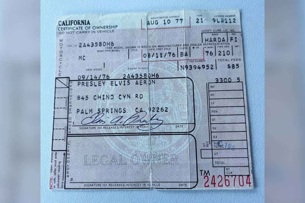 Elvis Presley, fã confesso das criações do fabricante de Milwaukee, foi dono de várias Harley-Davidson. A última que adquiriu foi a espetacular FLH Bicentennial do ano de 1976, que vai ser vendida em leilão acompanhada do título original da Califórnia, assinado pelo ícone da música.