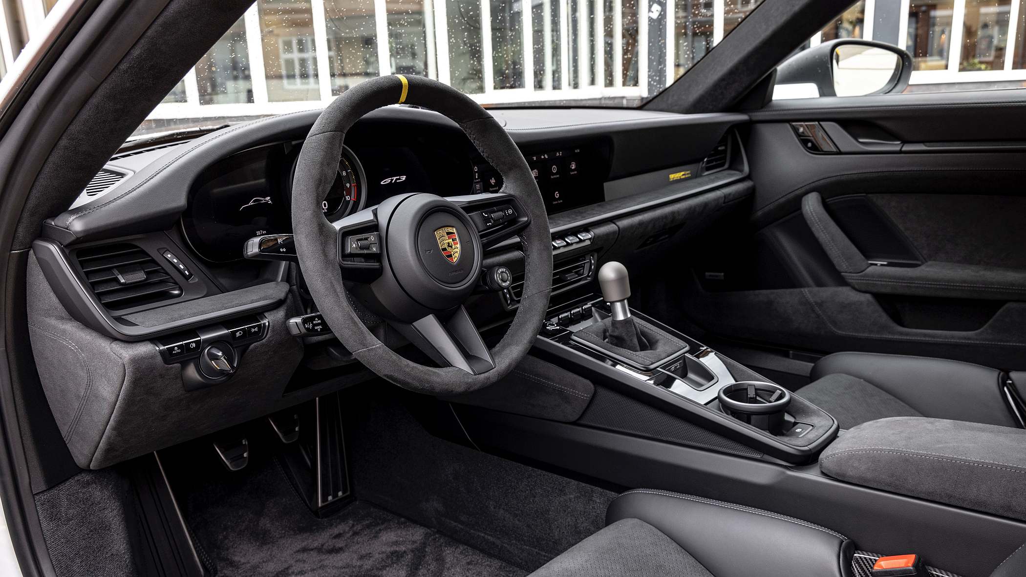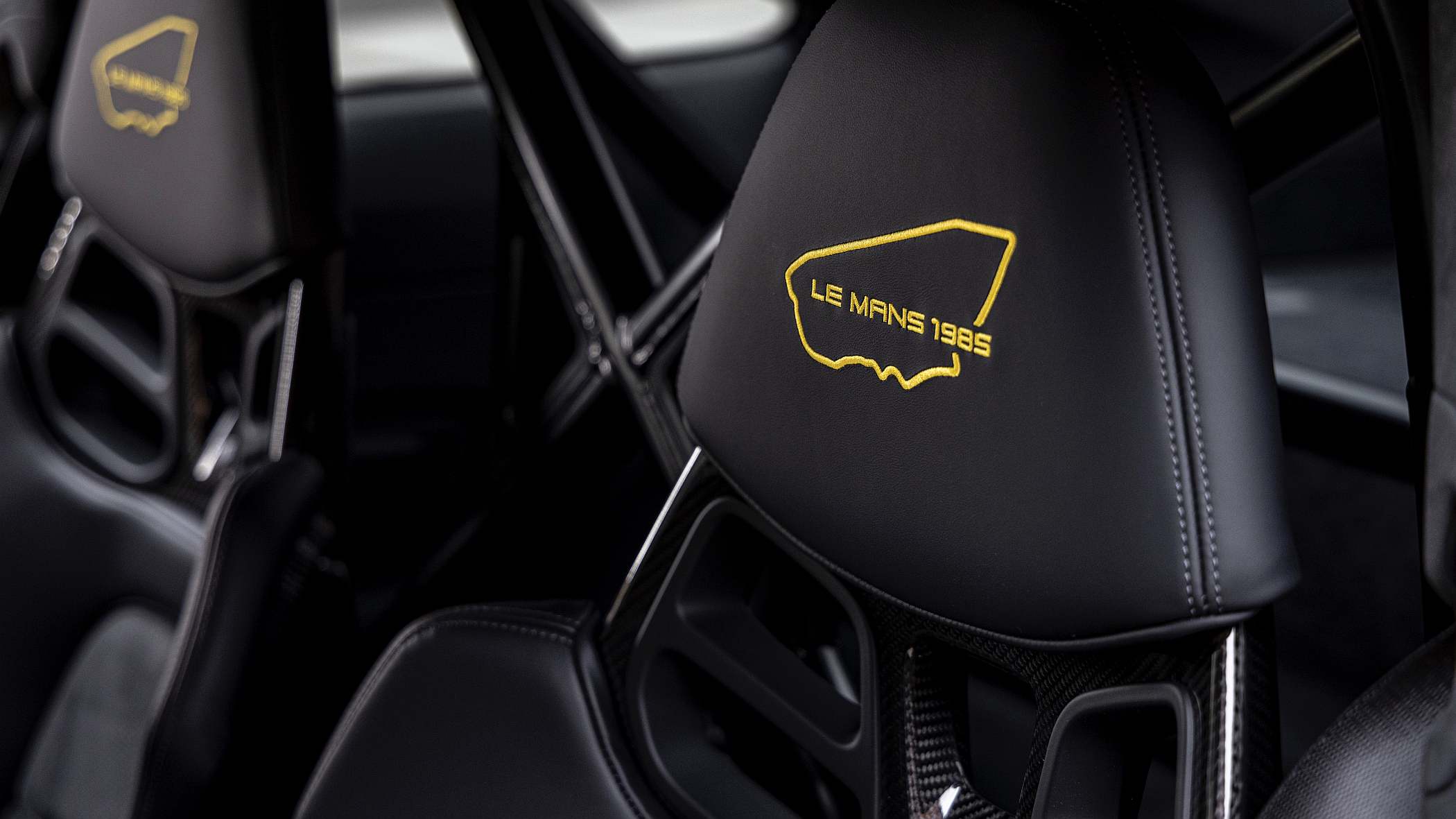 O habitáculo é dominado pela cor negra, a exemplo do que sucede nos carros de competição, destoando, no entanto, em detalhes como a soleira das portas com elemento decorativo ‘956 Le Mans 1985’ ou os encostos de cabeça com incrustação de representações gráficas do circuito de La Sarthe.