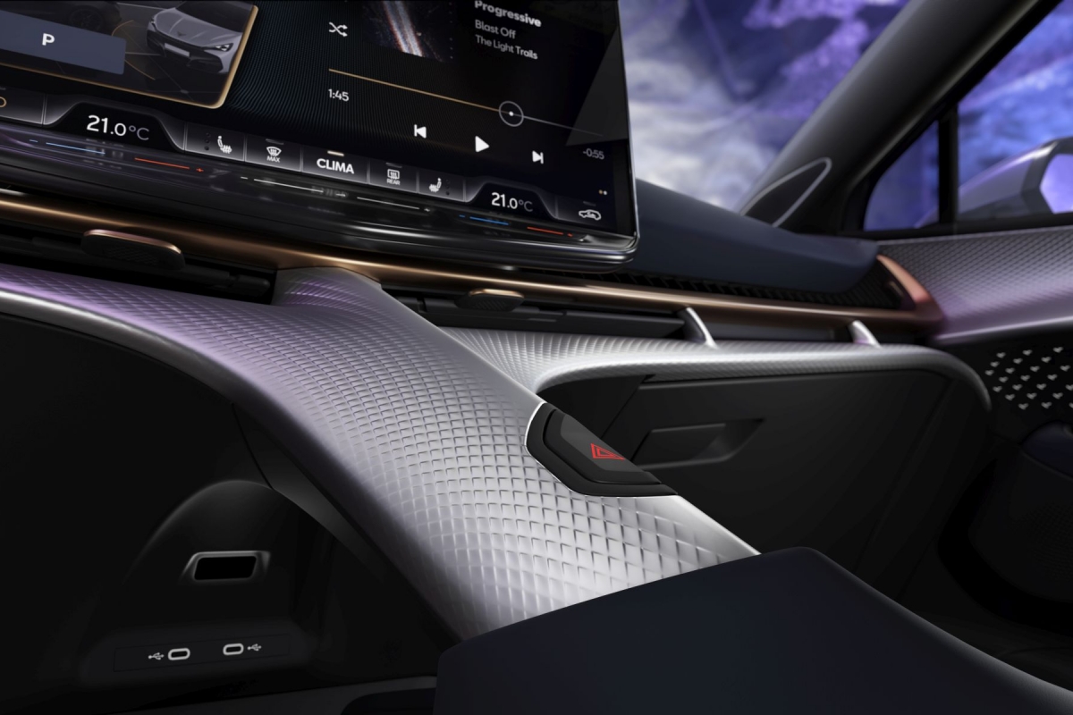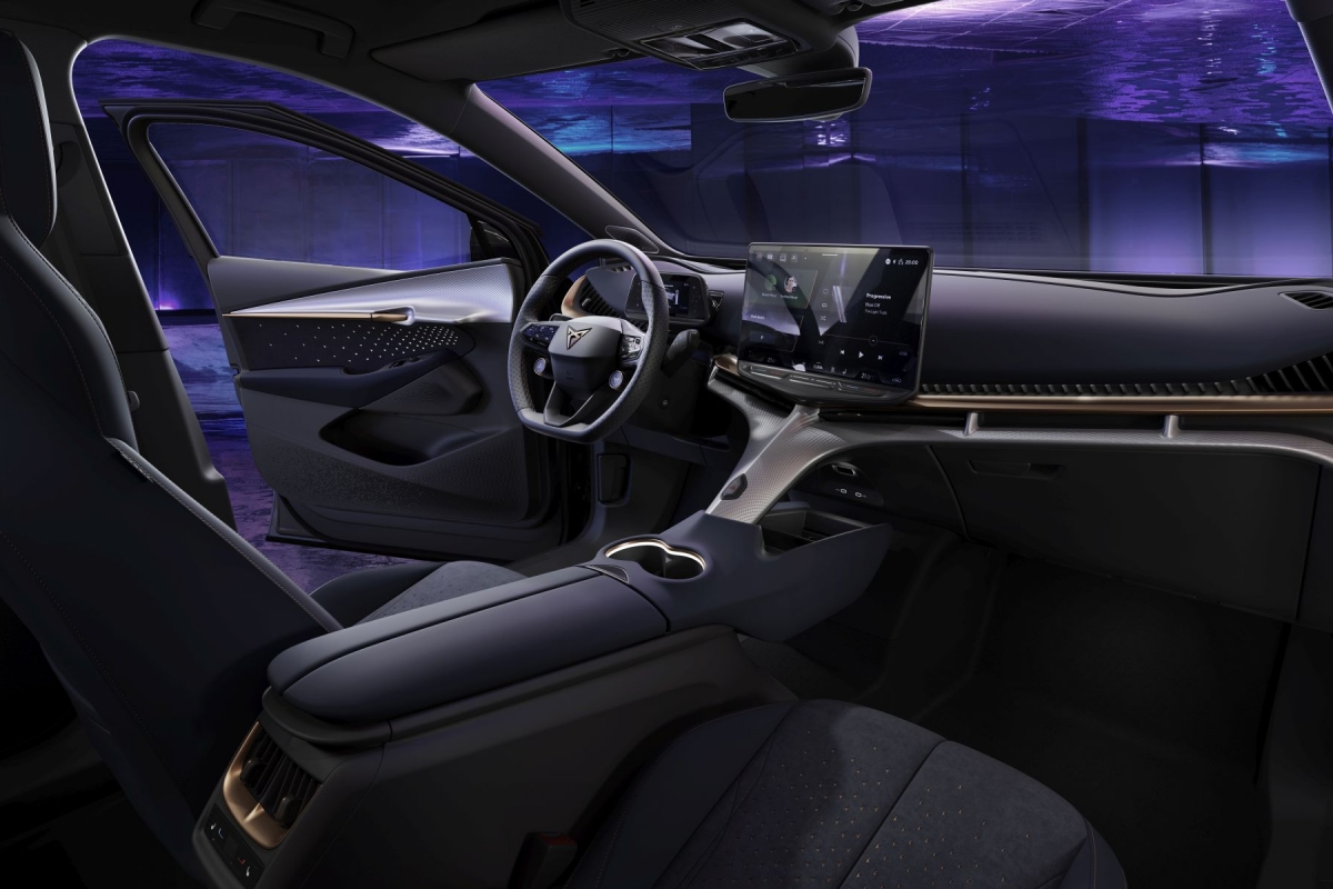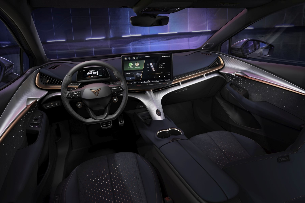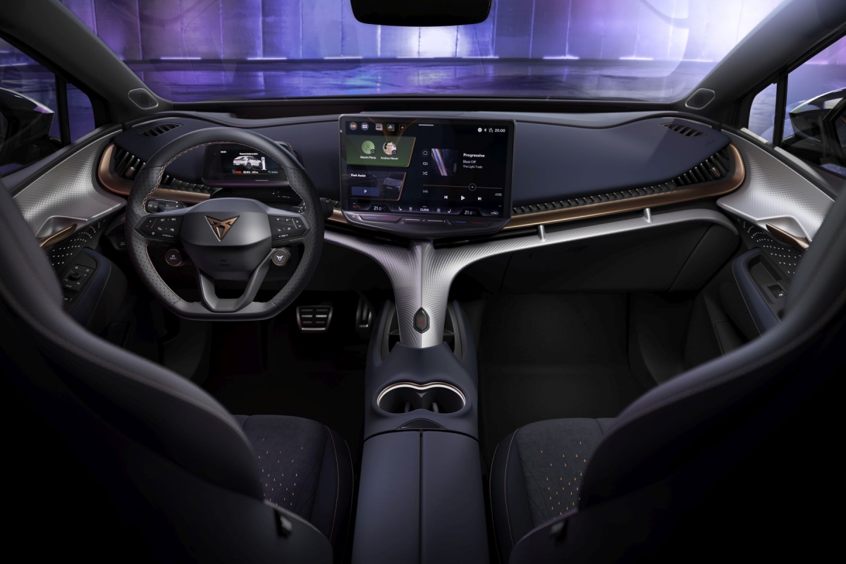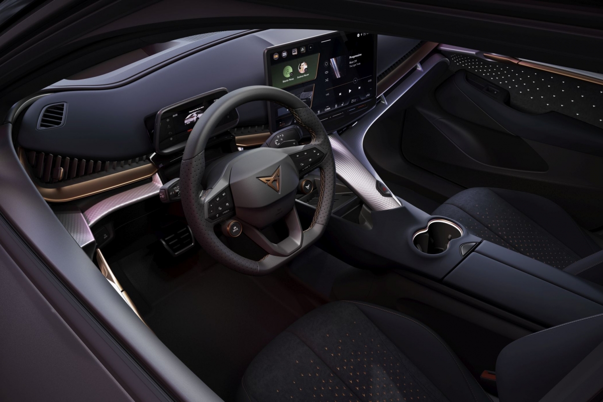 A irreverência do design Cupra continua no interior, onde a cor cobre é profusamente utilizada e encontramos inspiração das obras do arquiteto catalão Antoni Gaudí na forma de uma espinha dorsal que sobe desde a consola central e funciona como um esqueleto para suportar os restantes elementos do tablier, como o ecrã de infoentretenimento de 15”.