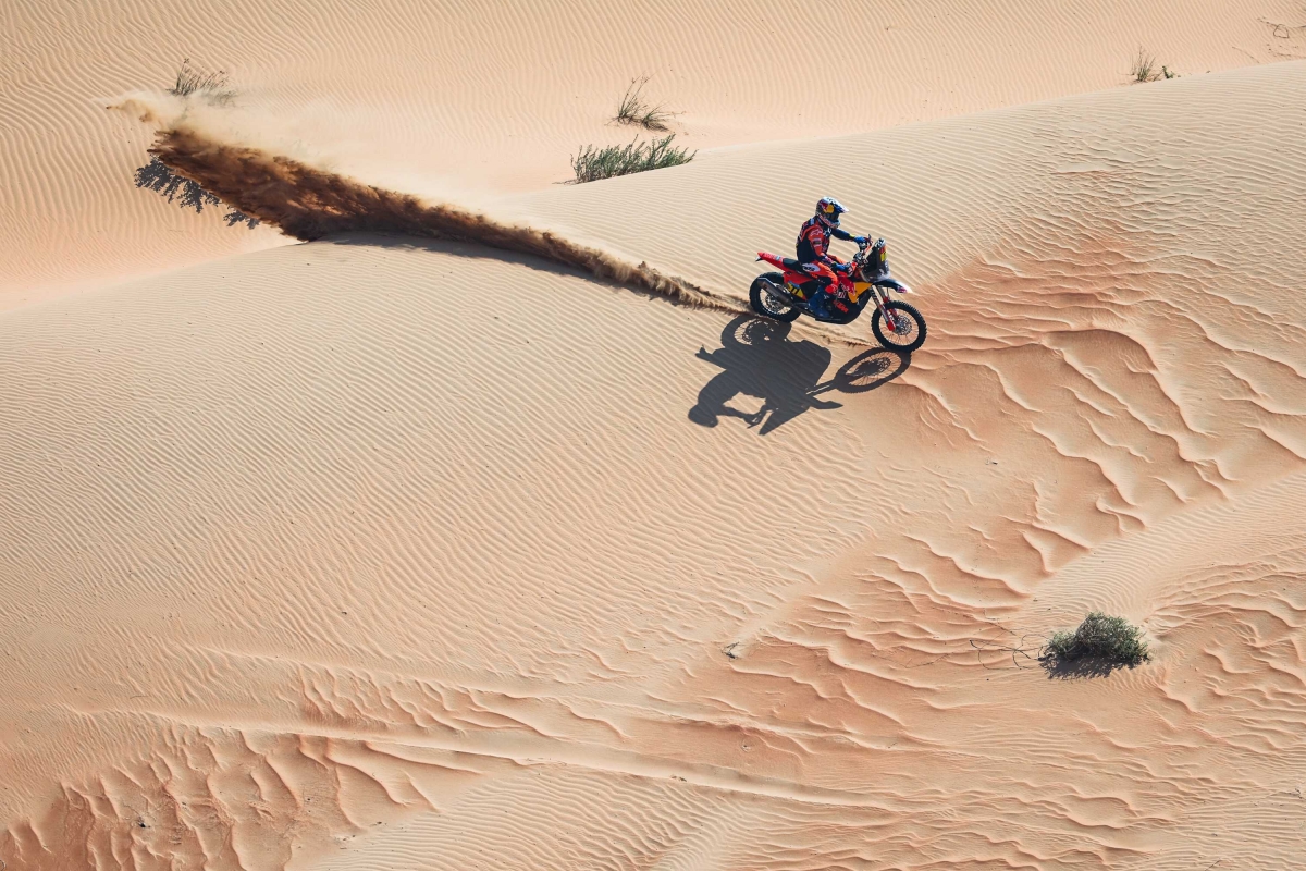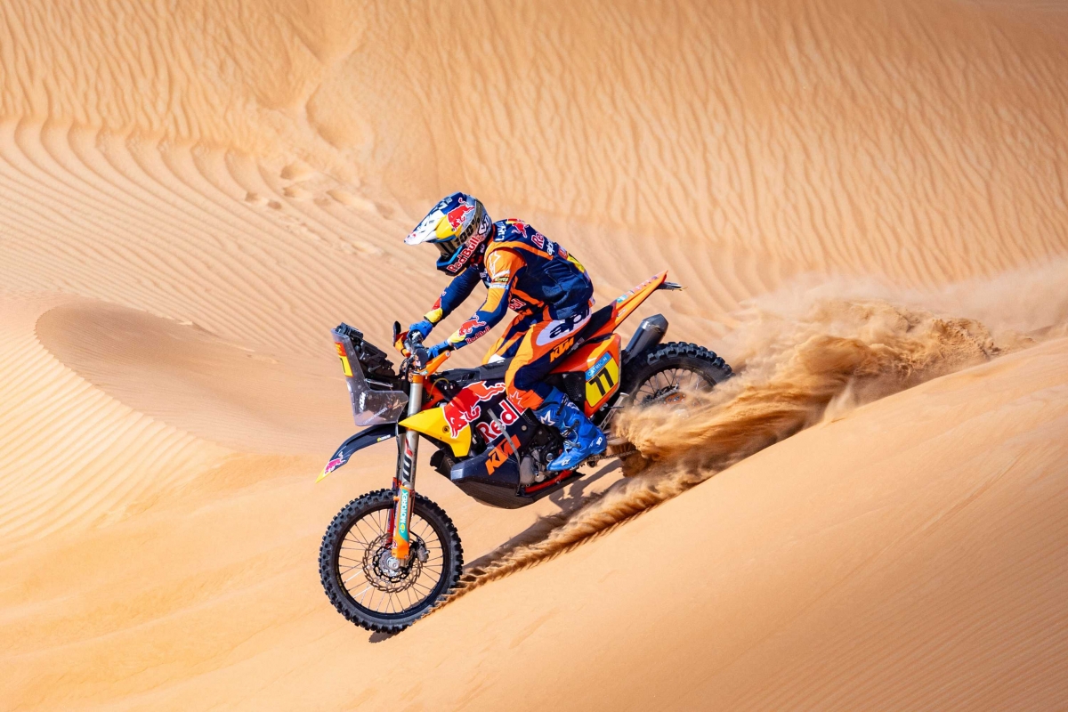 Dunas de areia imponentes, temperaturas extremas e uma distância de corrida de mais de 5.000 quilómetros aguardavam a caravana do Dakar e Sanders, de 30 anos, provou estar à altura na sua moto Red Bull KTM Factory Racing.