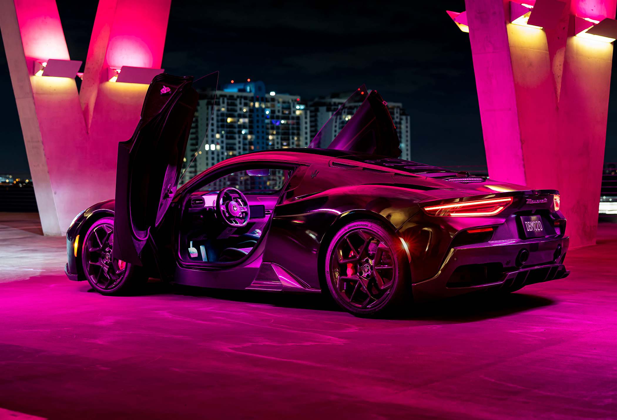 Partindo daqui como inspiração, a carroçaria exibe um tom preto brilhante que contrasta com os logótipos do Tridente na grelha e nos pilares C, em preto, mas com um acabamento opaco. O lettering da Maserati na traseira é, também, opaco, ao passo que o emblema MC20 na porta é em rosa pastel, tal como as pinças de travão Brembo.