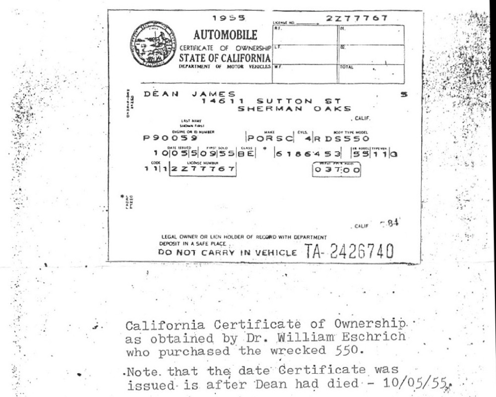 O Porsche 550 Spyder de 1955, ao volante do qual James Dean viria a sofrer o acidente fatal perto de Cholame, na Califórnia, desapareceu de forma misteriosa numa das paragens das campanhas itinerantes de segurança rodoviária, em que as autoridades americanas decidiram passar a exibir o automóvel sinistrado.