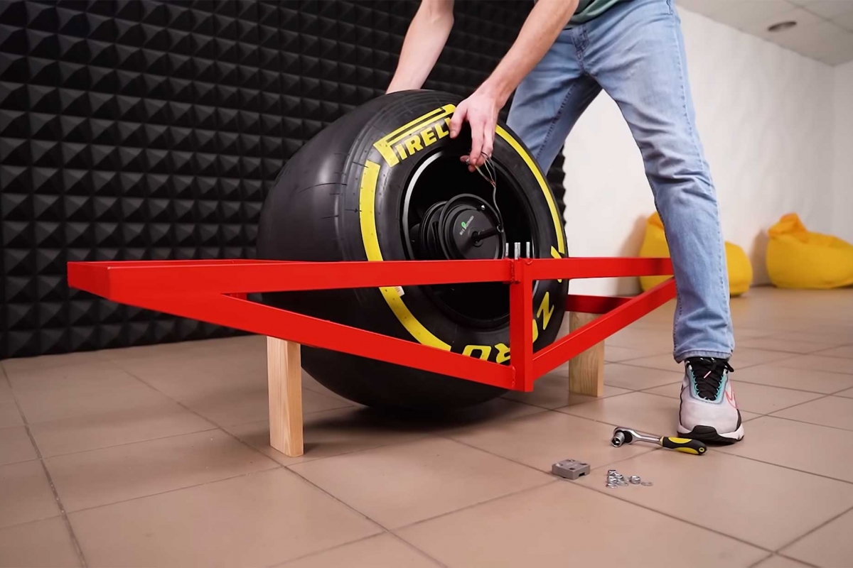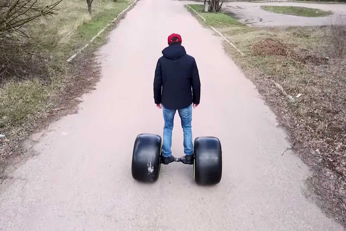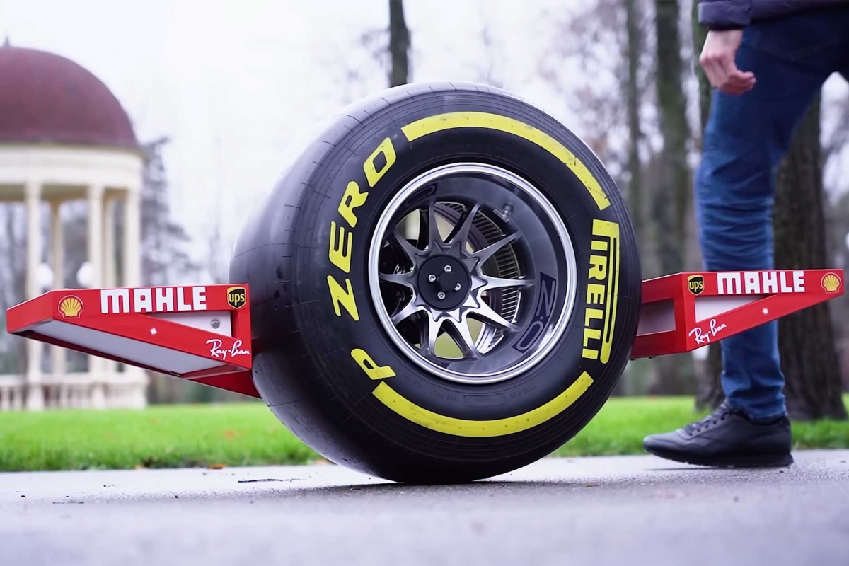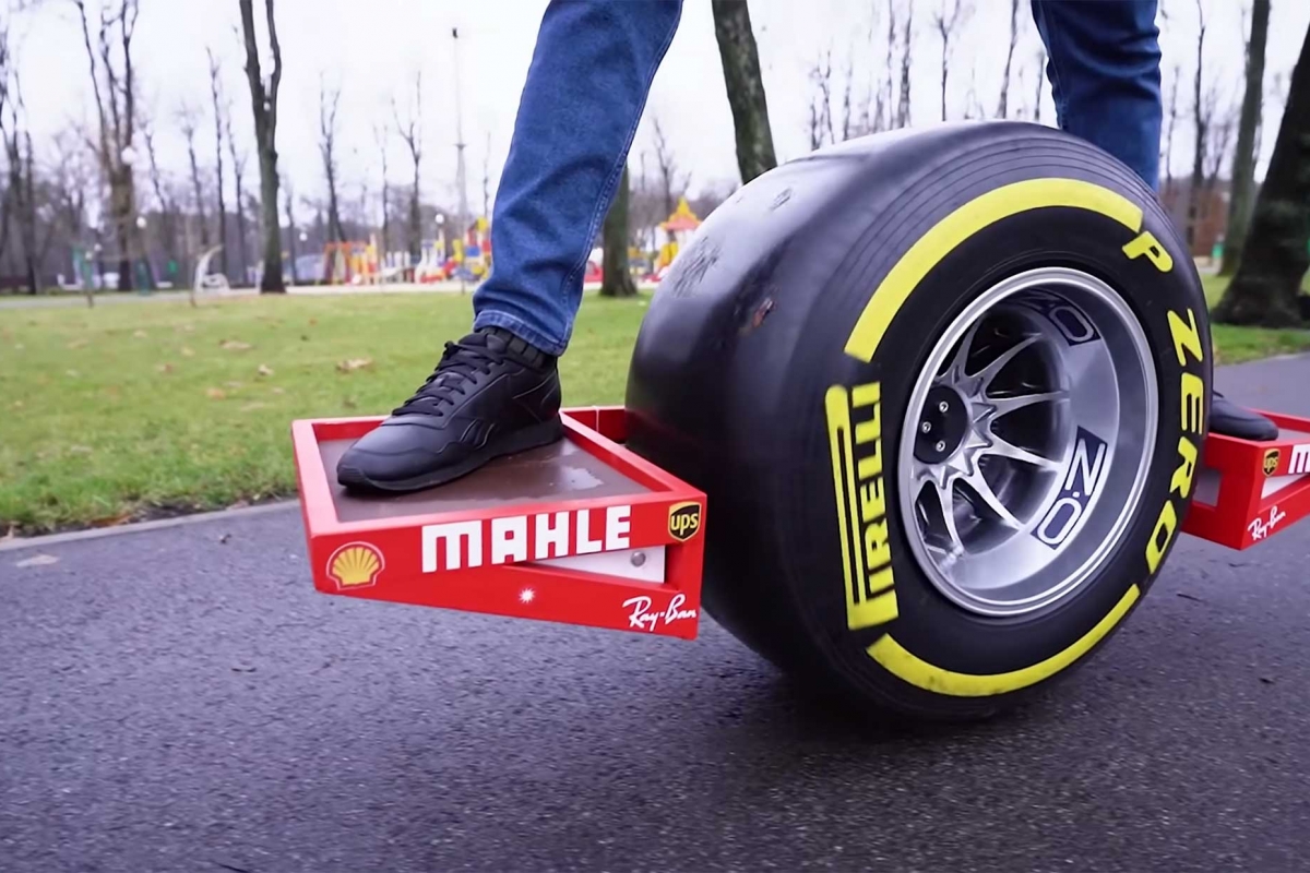 No entanto, ainda capaz de ir mais longe, decidiu elevar a fasquia ao construir uma hoverboard de raíz, mas desta vez apenas com uma roda, utilizando na mesma um pneu Pirelli P Zero de Fórmula 1.