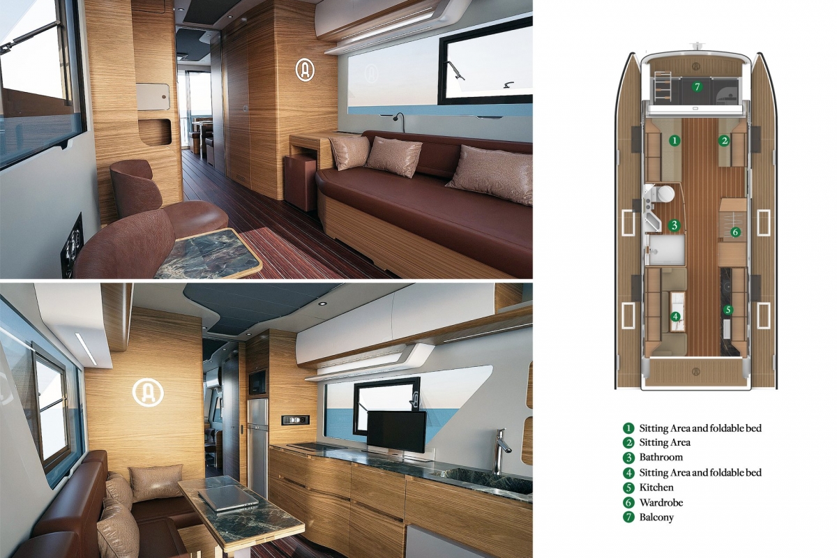 A autocaravana dos mares permite até seis pessoas a bordo, sobrando espaço para uma pequena varanda na proa e um deck na popa, onde pode desfrutar do pôr-do-sol no mar.