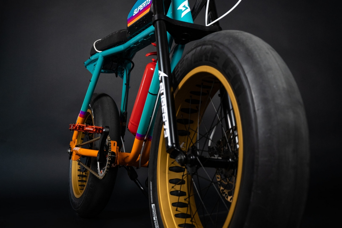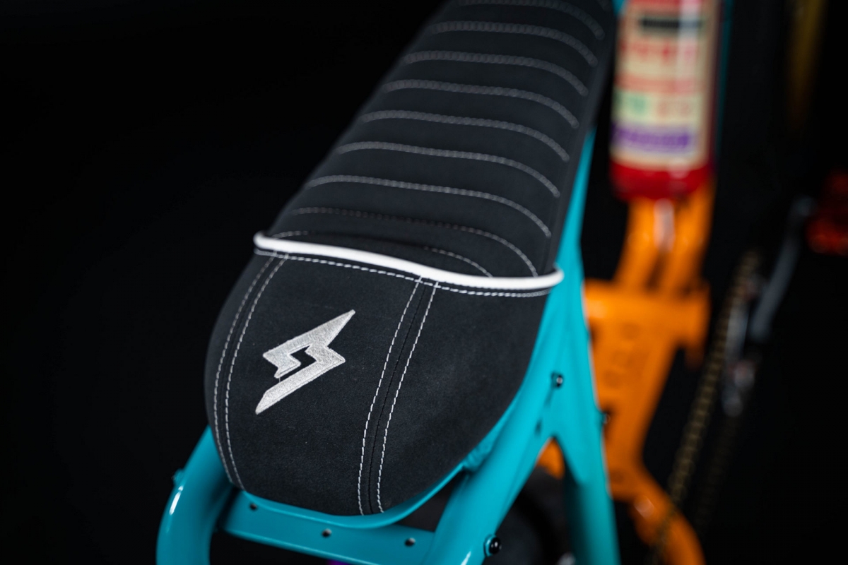 Além da original combinação de cores para o quadro e para todos os restantes componentes, a fabricante californiana de e-bikes também buscou inspiração nas bacquets de competição para desenhar o assento do veículo de duas rodas, que com revestimento em Alcantara. Outro apontamento de estilo de inspiração retro está nas rodas, com os aros a dourado e pneus especiais da Apache Fattyslick.