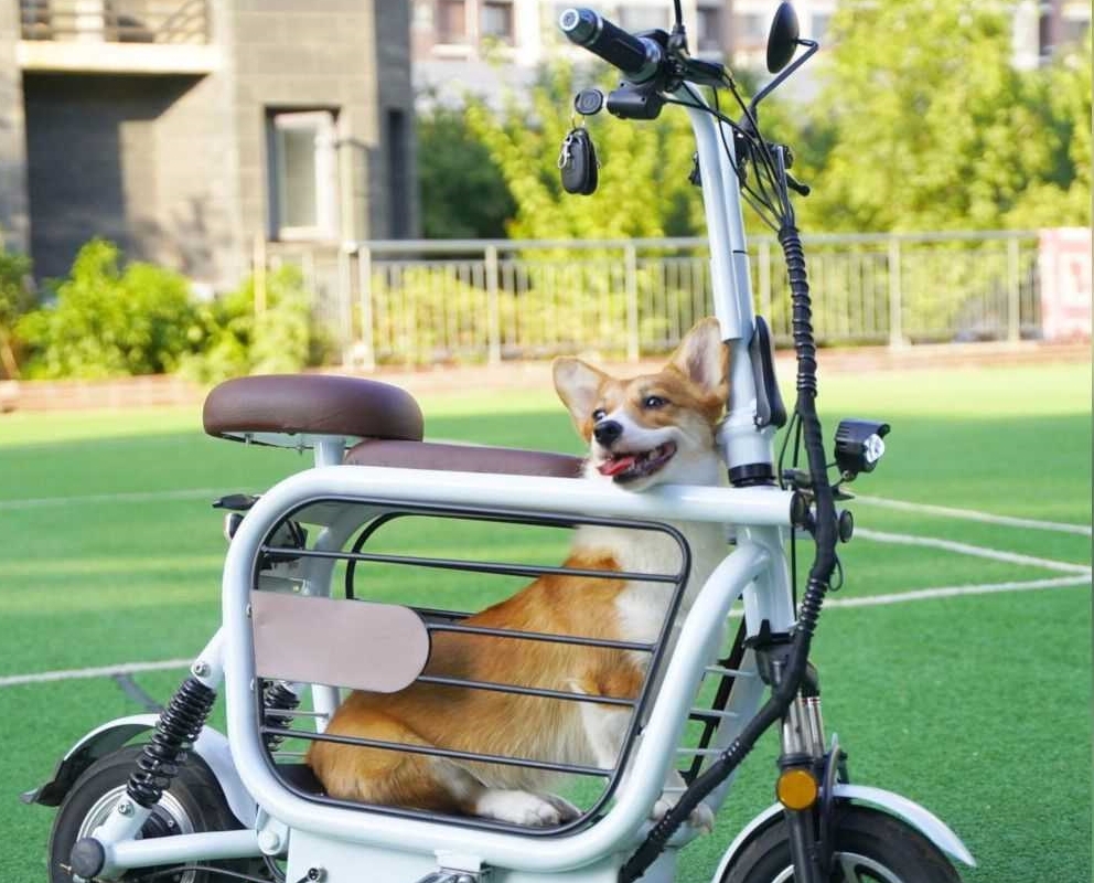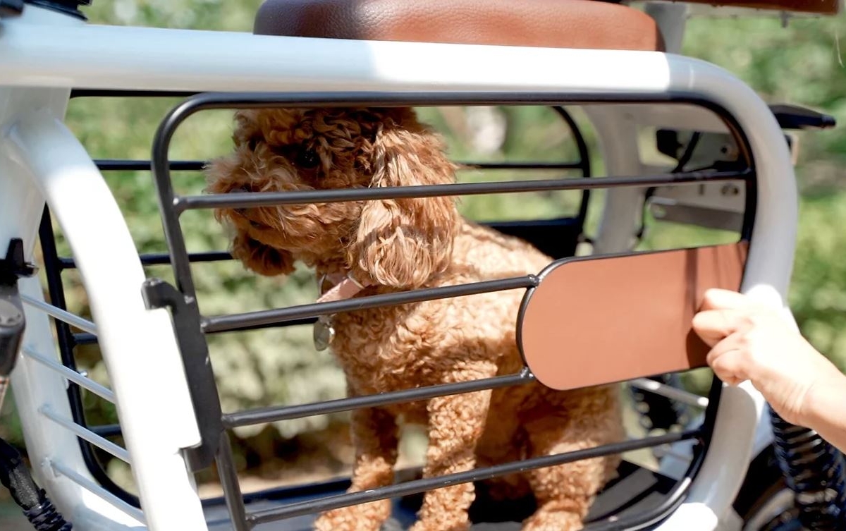 O companheiro de quatro patas viaja no compartimento ao centro da scooter elétrica, arejado e bem protegido pela própria estrutura do quadro, com uma porta lateral.