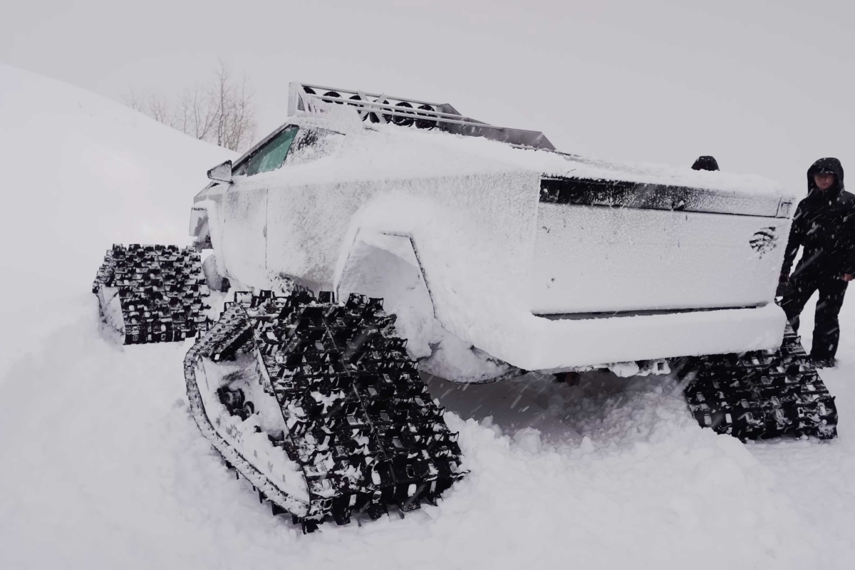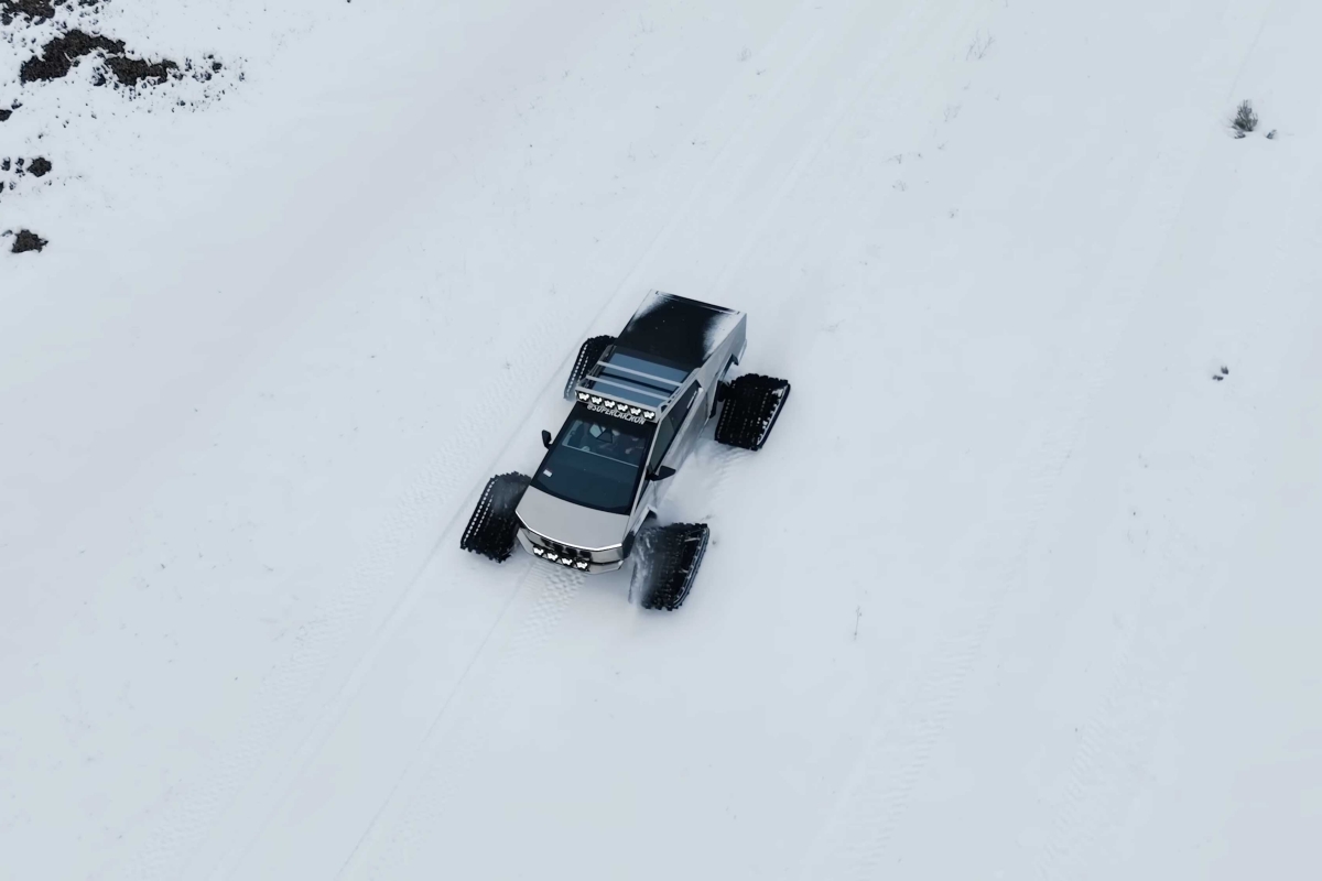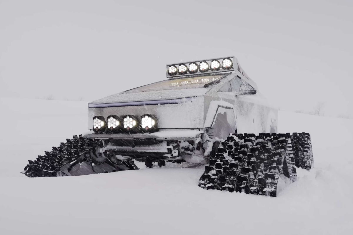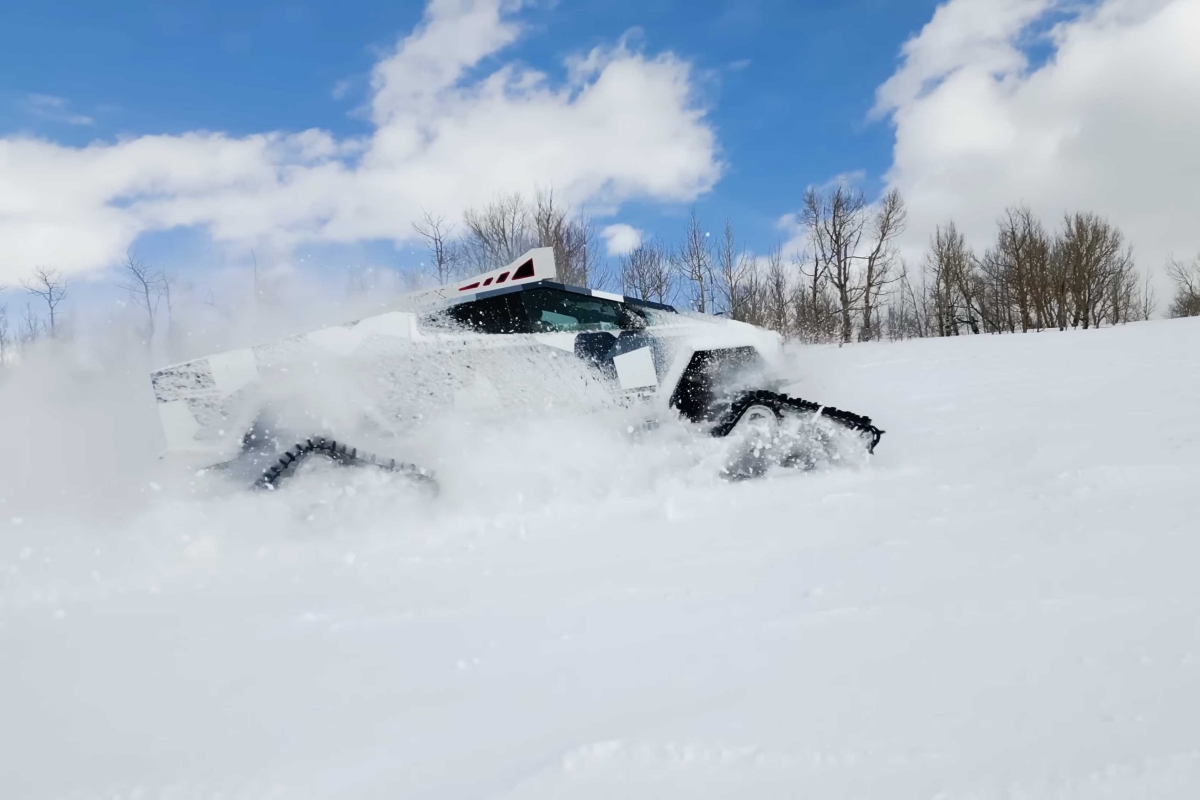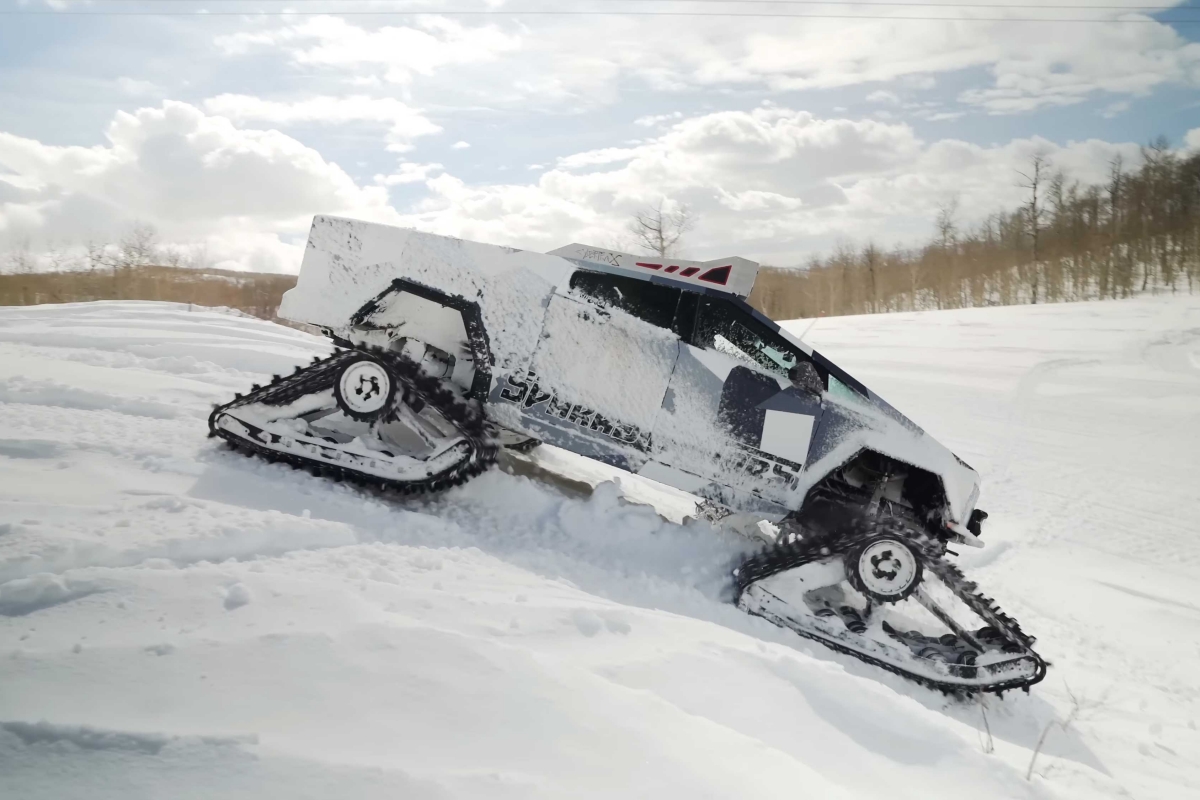 As lagarta utilizadas são as Helltraxx. Embora algumas conversões sejam boas para um aumento na tração na neve compacta, um veículo com Helltraxx está equipado para flutuar em cima de neve profunda. Esta receita de flutuação requer, entre outras coisas, alguns ingredientes principais: potência e superfície de contato alargada. À Cybertruck não falta potência ou torque com mais de 600 cv e três motores. Cada lagarta tem cerca de 76 cm de largura, criando uma enorme área de contato, suficiente para que o veículo possa permanecer em cima da neve em vez de afundar nela.