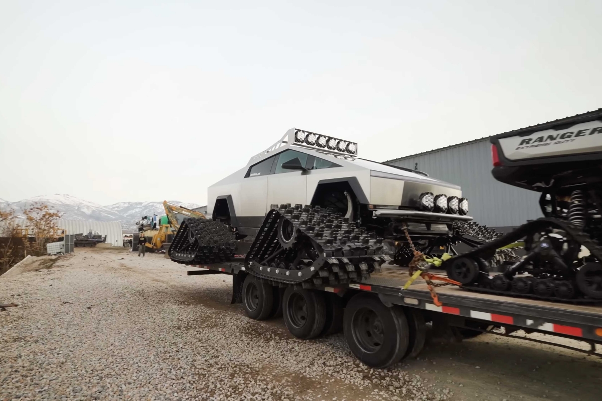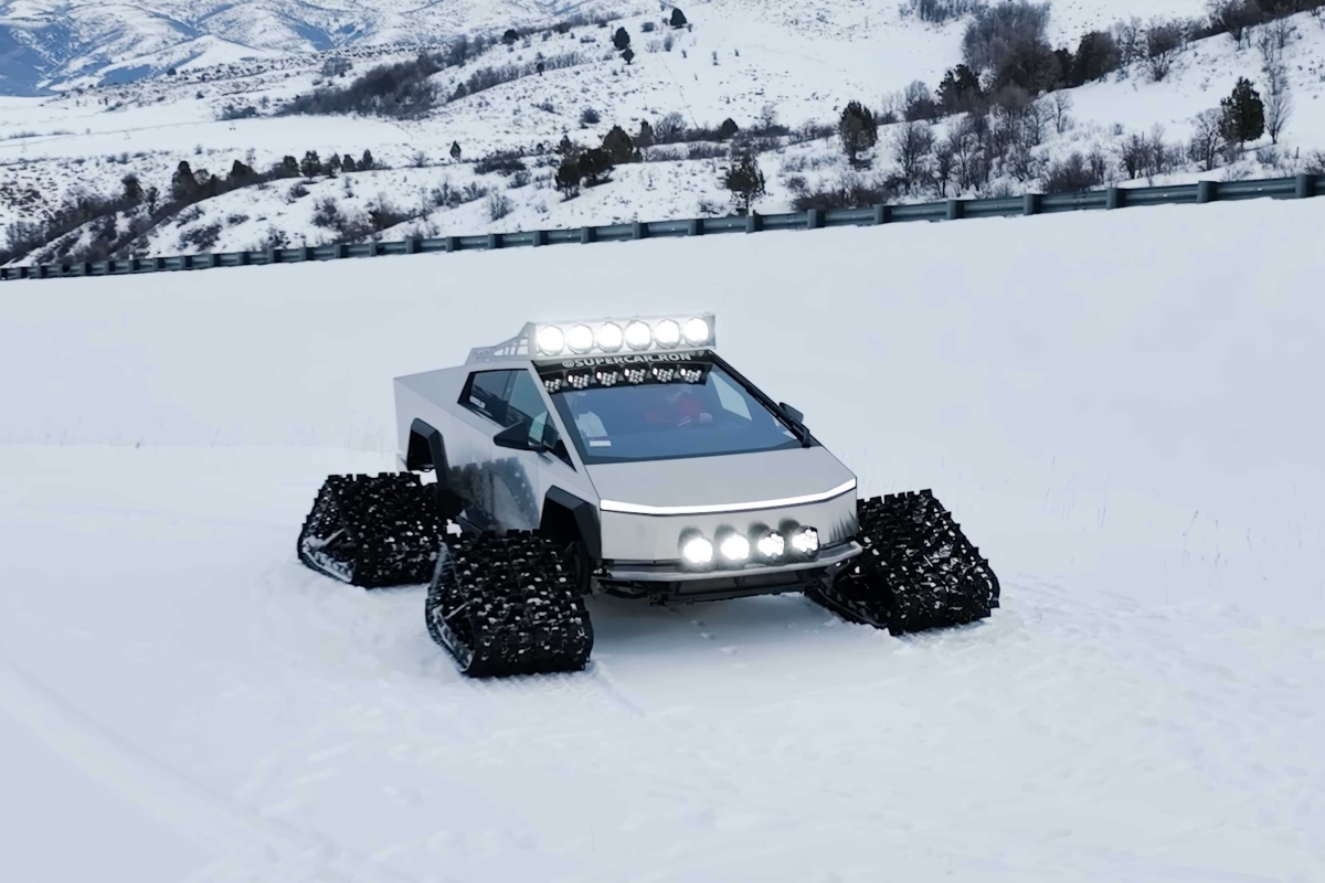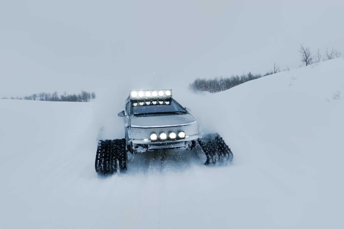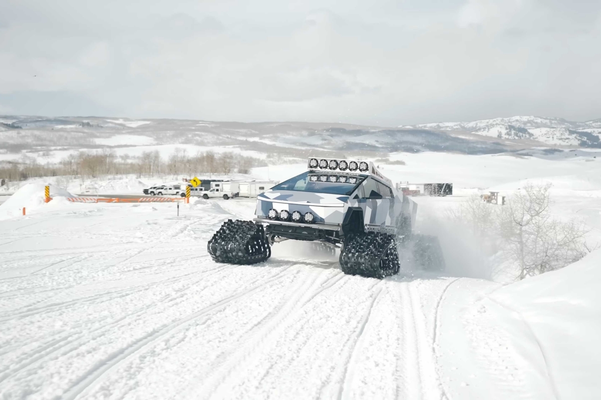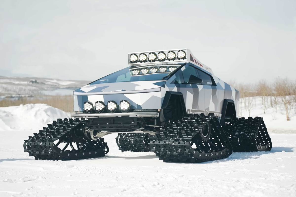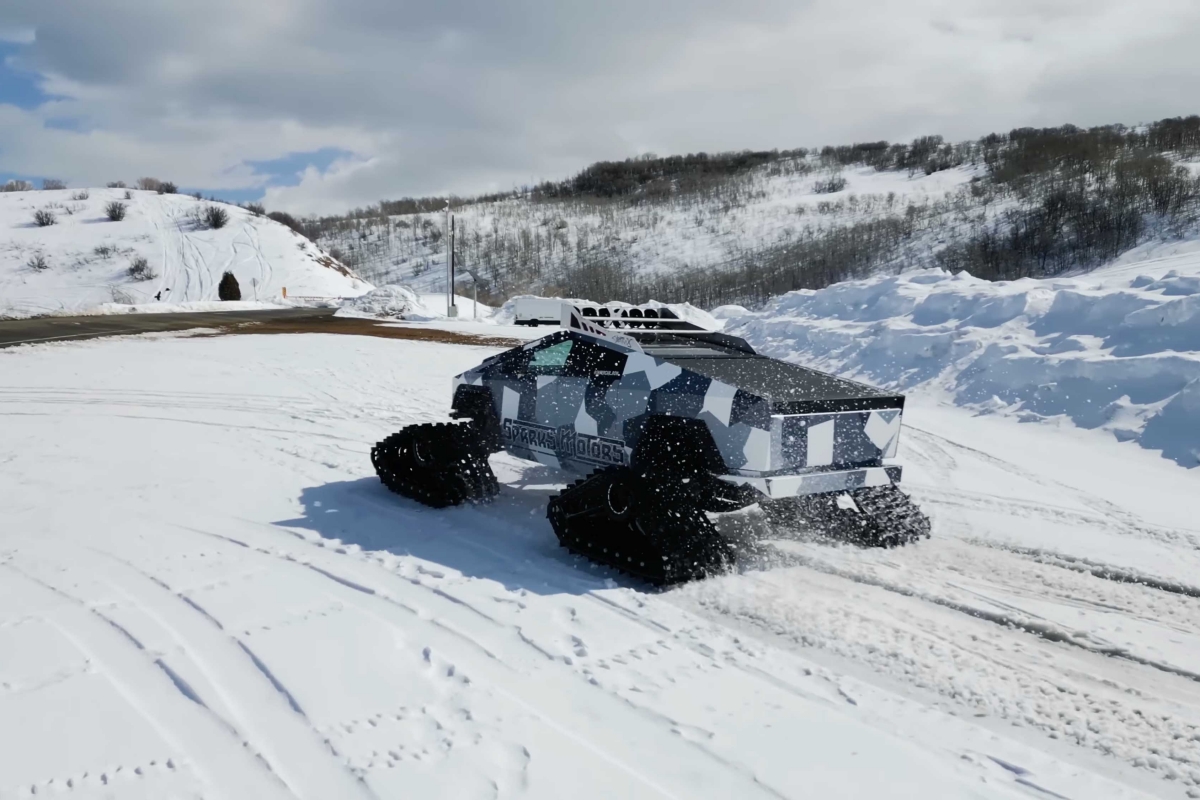 As lagarta utilizadas são as Helltraxx. Embora algumas conversões sejam boas para um aumento na tração na neve compacta, um veículo com Helltraxx está equipado para flutuar em cima de neve profunda. Esta receita de flutuação requer, entre outras coisas, alguns ingredientes principais: potência e superfície de contato alargada. À Cybertruck não falta potência ou torque com mais de 600 cv e três motores. Cada lagarta tem cerca de 76 cm de largura, criando uma enorme área de contato, suficiente para que o veículo possa permanecer em cima da neve em vez de afundar nela.