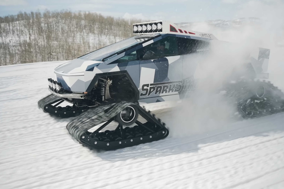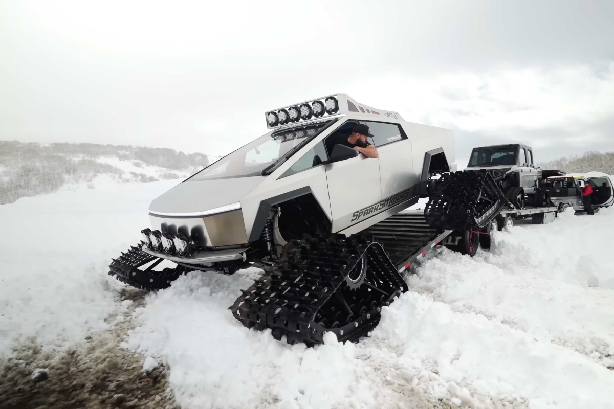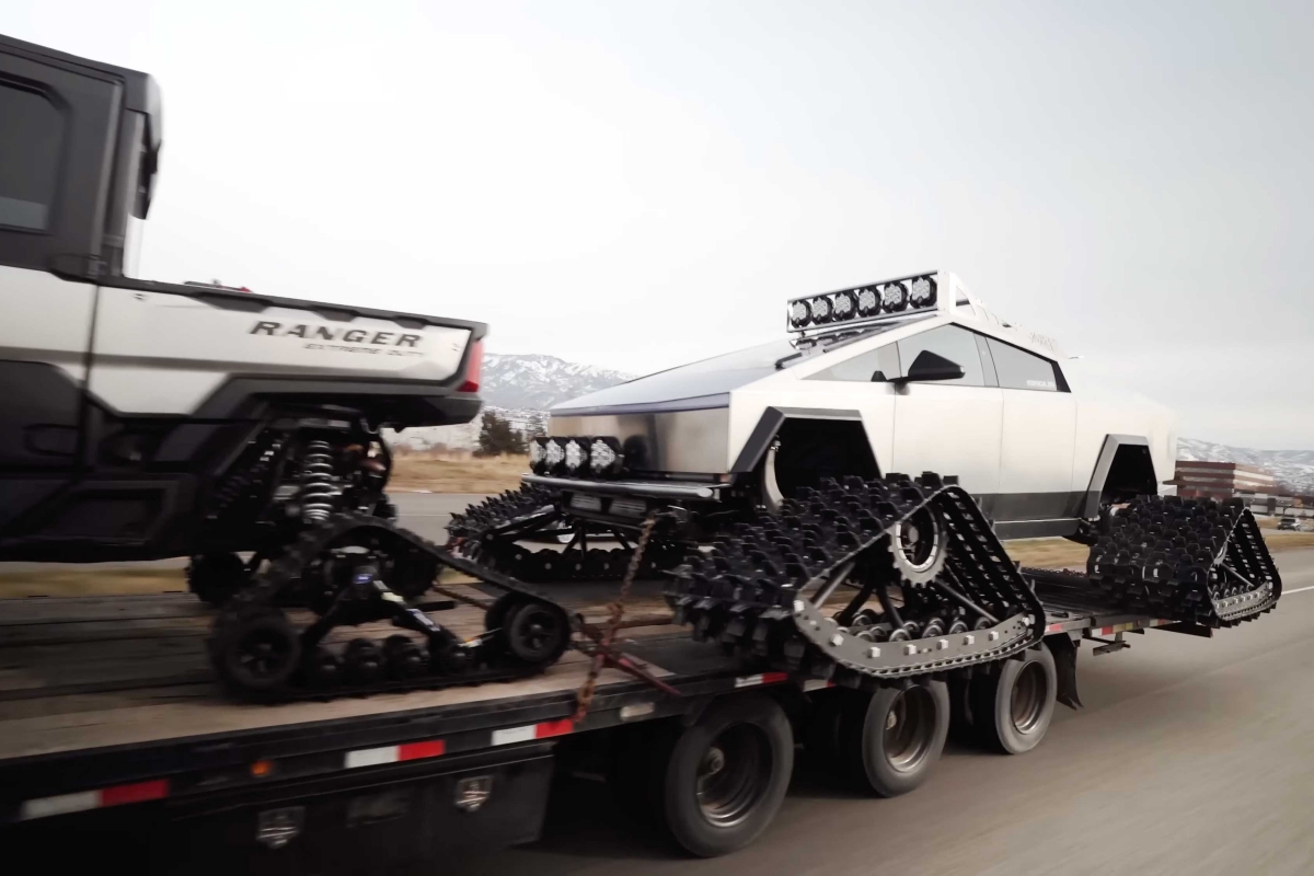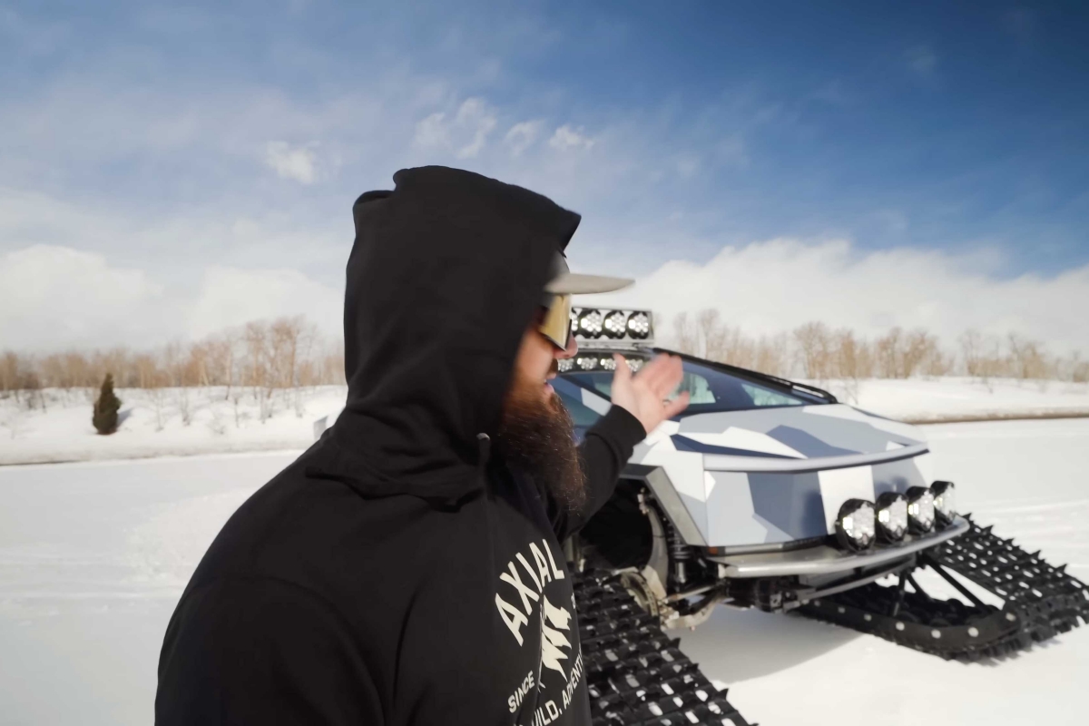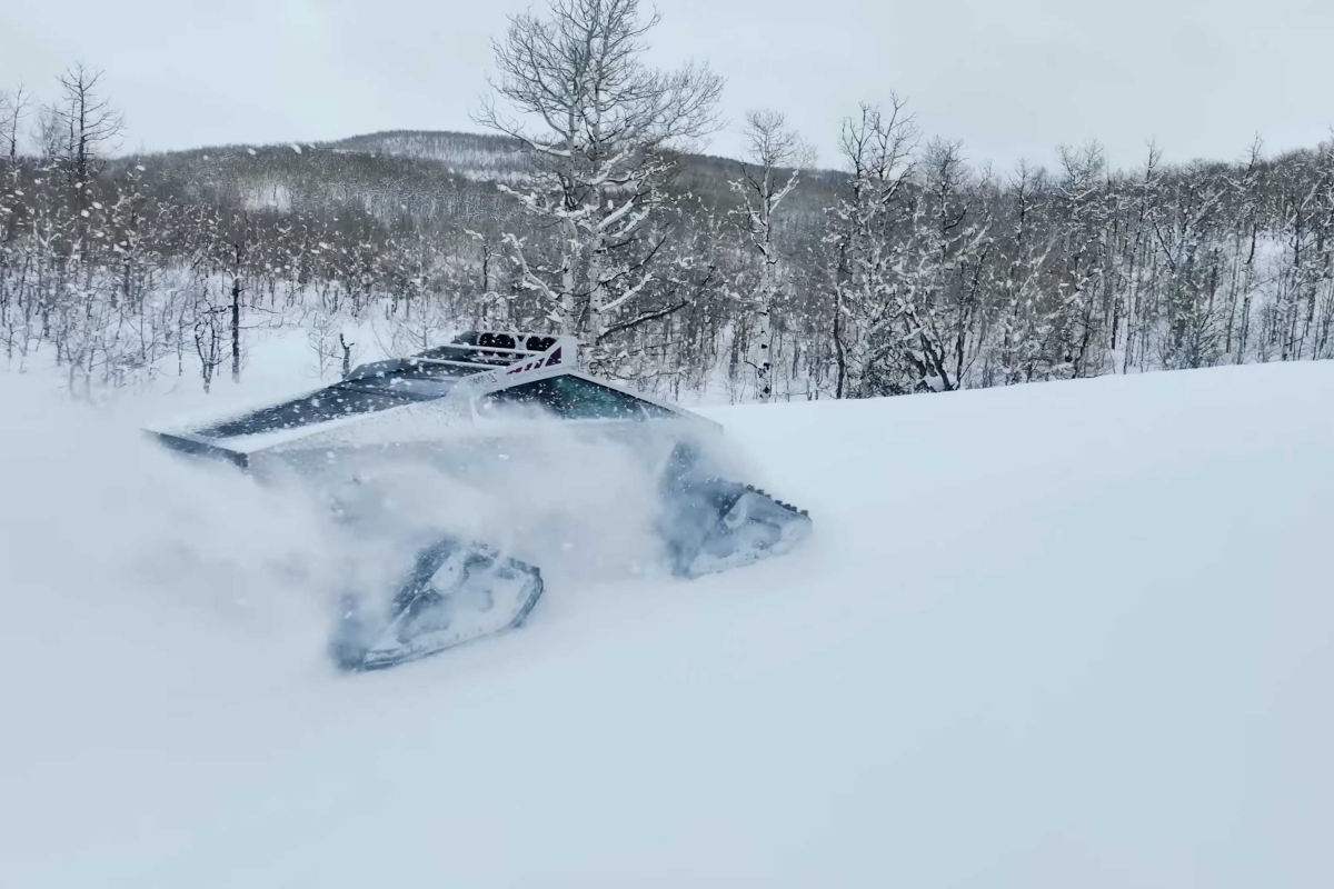 As lagarta utilizadas são as Helltraxx. Embora algumas conversões sejam boas para um aumento na tração na neve compacta, um veículo com Helltraxx está equipado para flutuar em cima de neve profunda. Esta receita de flutuação requer, entre outras coisas, alguns ingredientes principais: potência e superfície de contato alargada. À Cybertruck não falta potência ou torque com mais de 600 cv e três motores. Cada lagarta tem cerca de 76 cm de largura, criando uma enorme área de contato, suficiente para que o veículo possa permanecer em cima da neve em vez de afundar nela.
