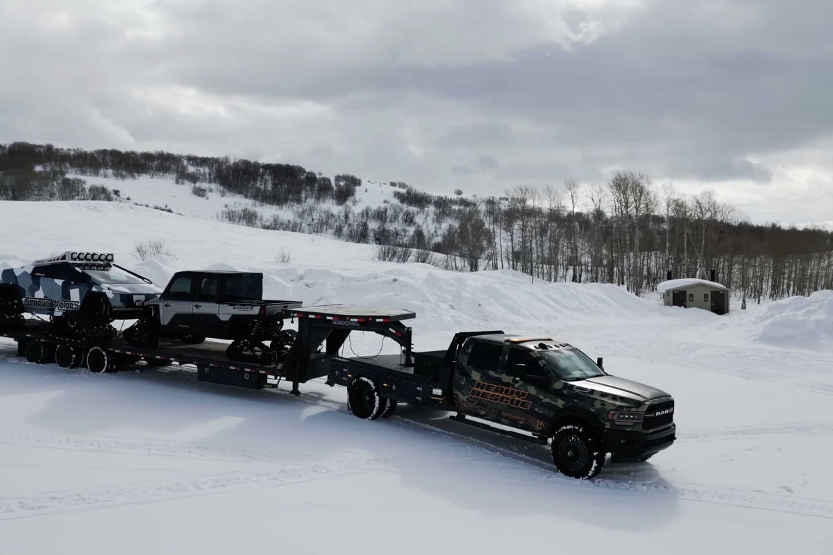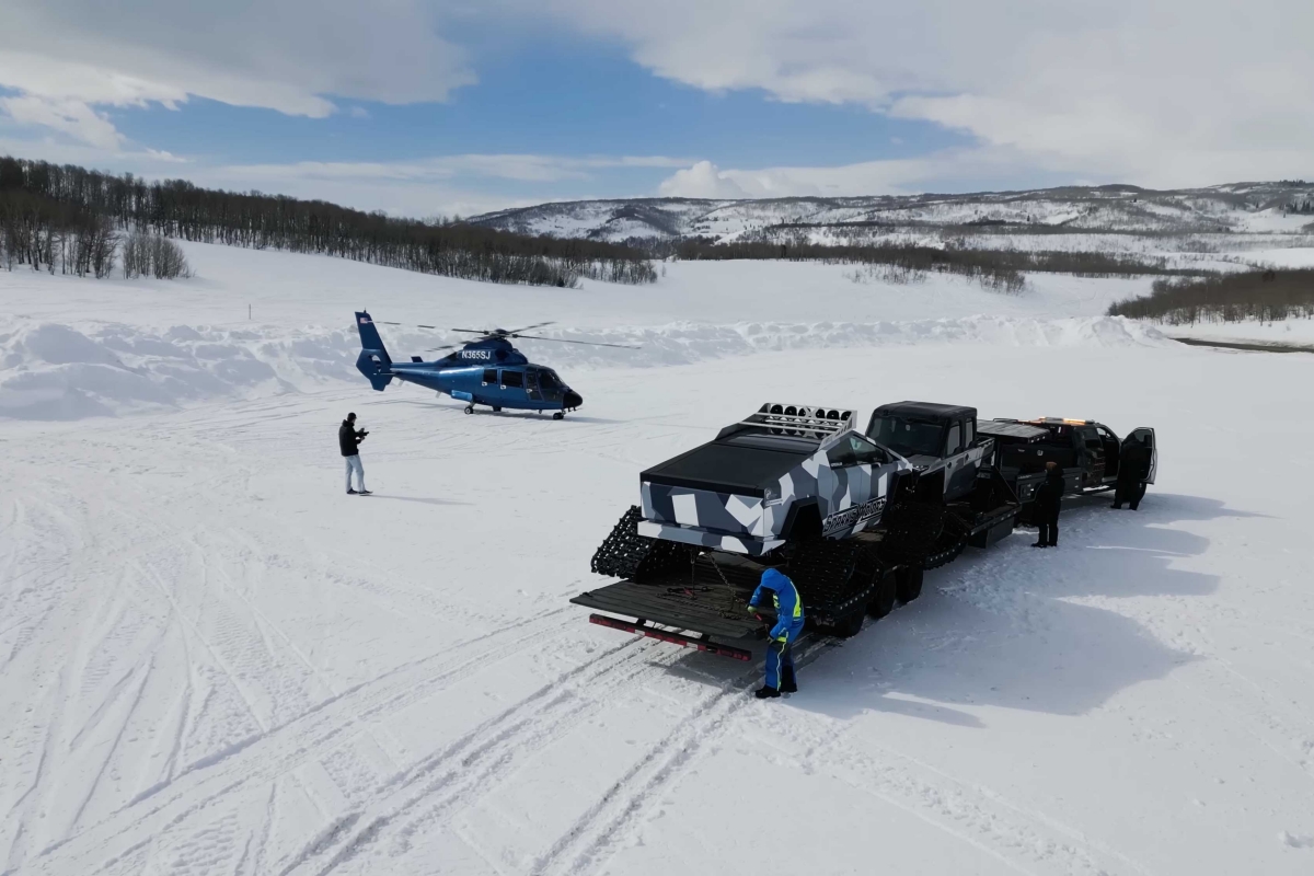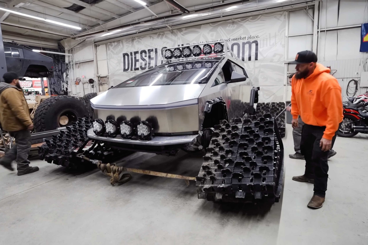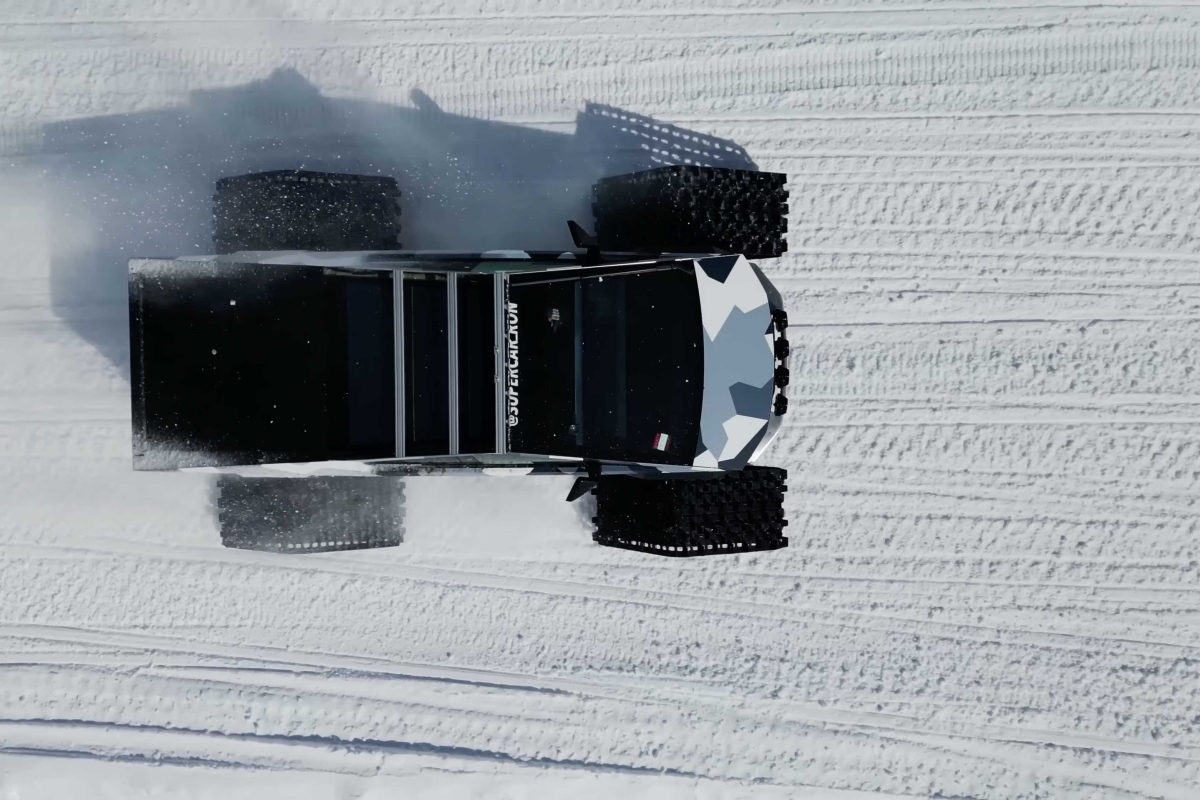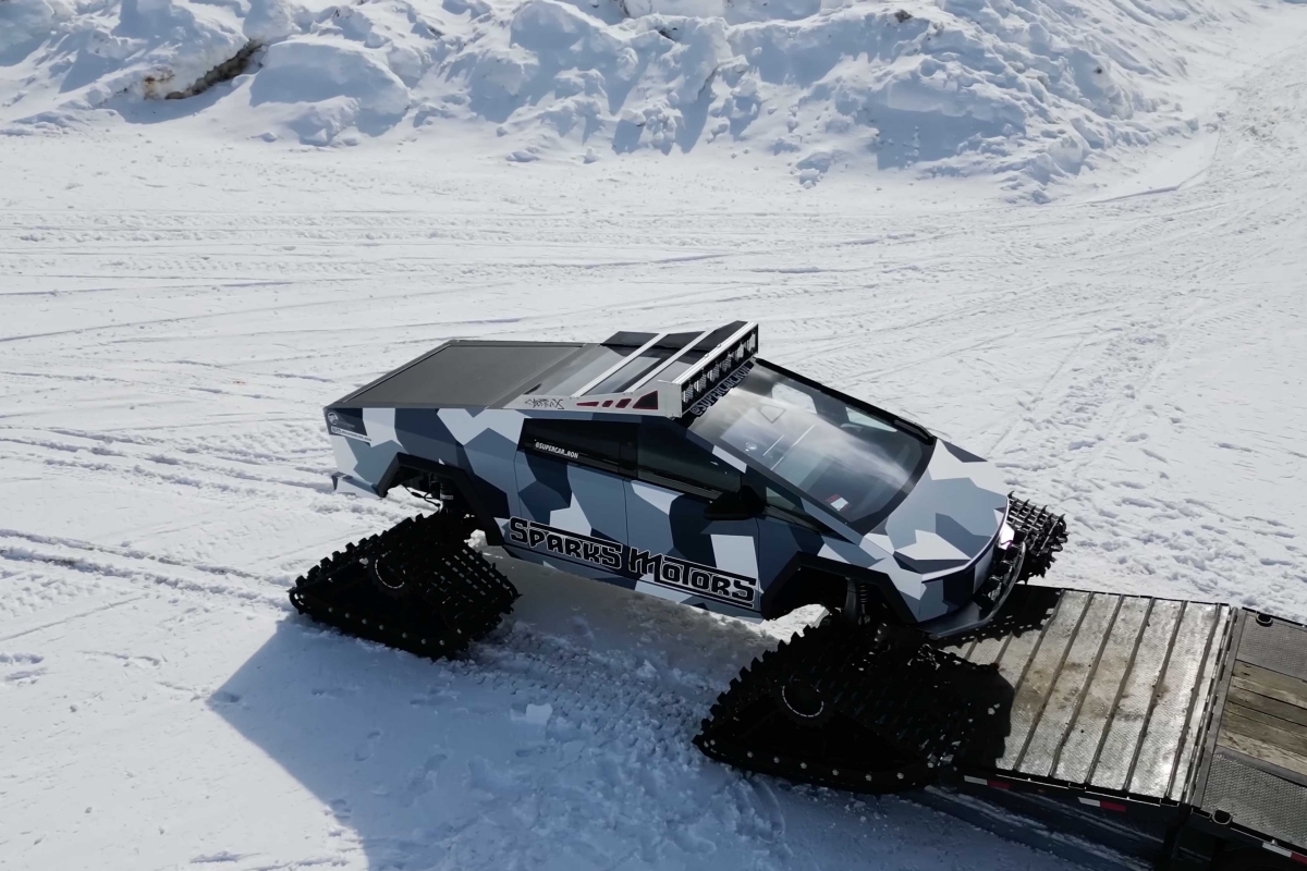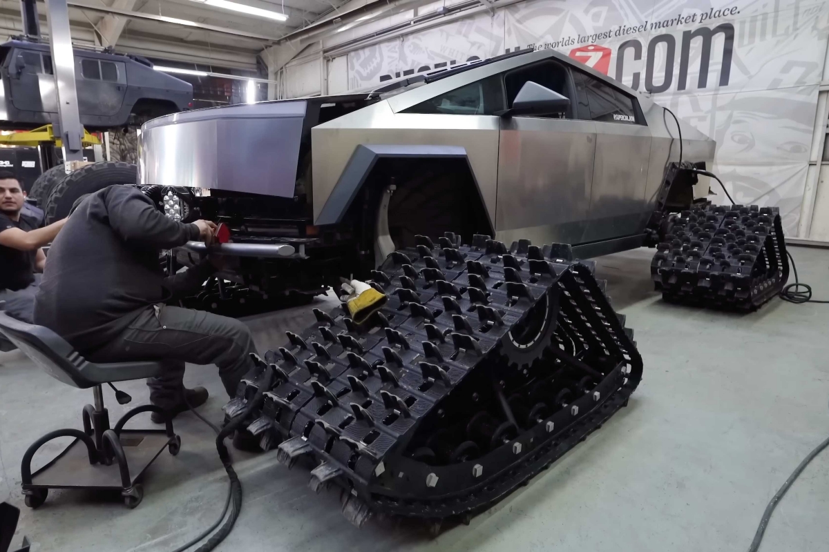 As lagarta utilizadas são as Helltraxx. Embora algumas conversões sejam boas para um aumento na tração na neve compacta, um veículo com Helltraxx está equipado para flutuar em cima de neve profunda. Esta receita de flutuação requer, entre outras coisas, alguns ingredientes principais: potência e superfície de contato alargada. À Cybertruck não falta potência ou torque com mais de 600 cv e três motores. Cada lagarta tem cerca de 76 cm de largura, criando uma enorme área de contato, suficiente para que o veículo possa permanecer em cima da neve em vez de afundar nela.