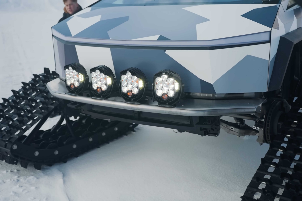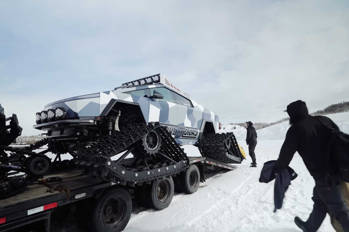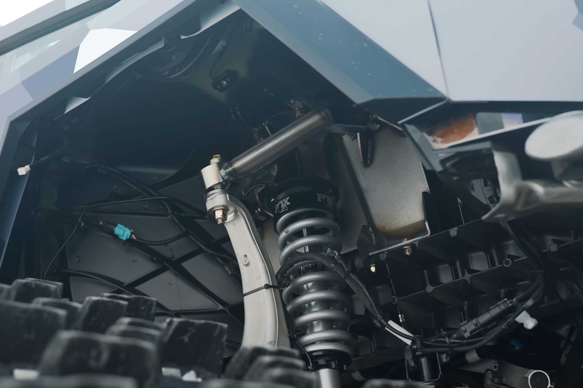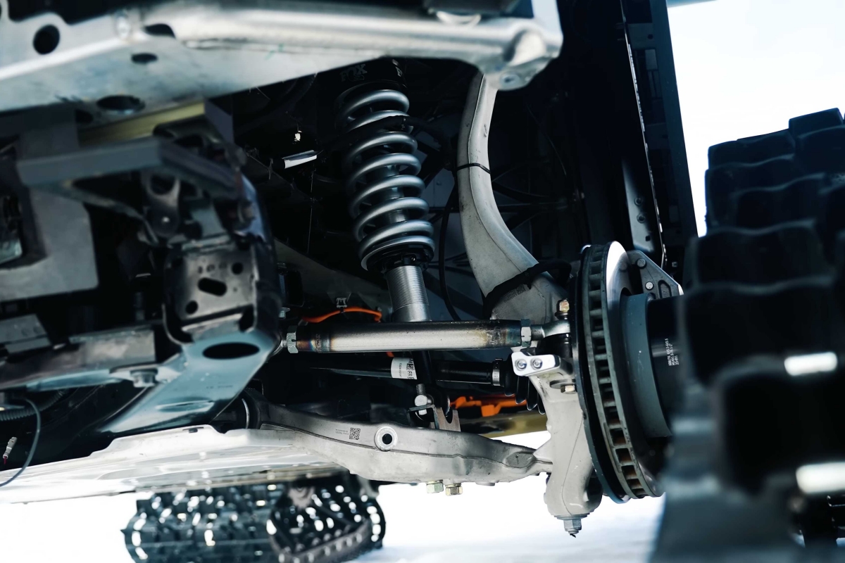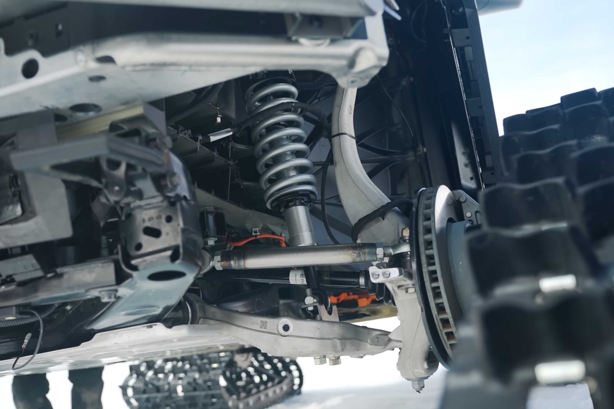 Curiosamente, os braços superiores da Cybertruck não foram projetados para lidar com a tensão adicional que as lagartas de neve podem exercer sobre os componentes da suspensão. O teste inicial danificou rapidamente o braço superior do lado do condutor e a Cybertruck voltou para a garagem. Em substituição foi colocado um braço feito sob medida, reforçado para lidar com as lagartas. Os amortecedores Fox substituíram os de fábrica e a carrocaria foi reforçada.