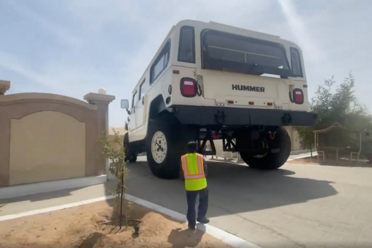Trata-se do xeque Hamad Bin Hamdan Al Nahyan, membro da família real dos Emiratos Árabes Unidos – o mesmo que mandou escrever o seu nome no deserto em letras tão grandes que podem ser lidas do espaço –, e que decidiu homenagear o icónico 4×4 americano mandando fabricar uma réplica do tamanho de uma casa, dando origem aquele que é provavelmente o maior Hummer que se pode conduzir!