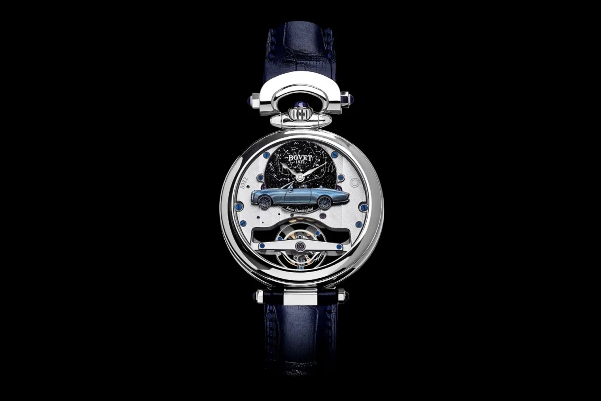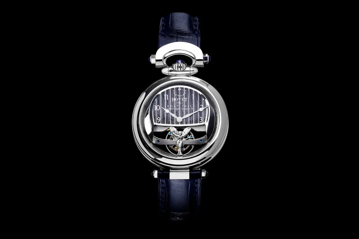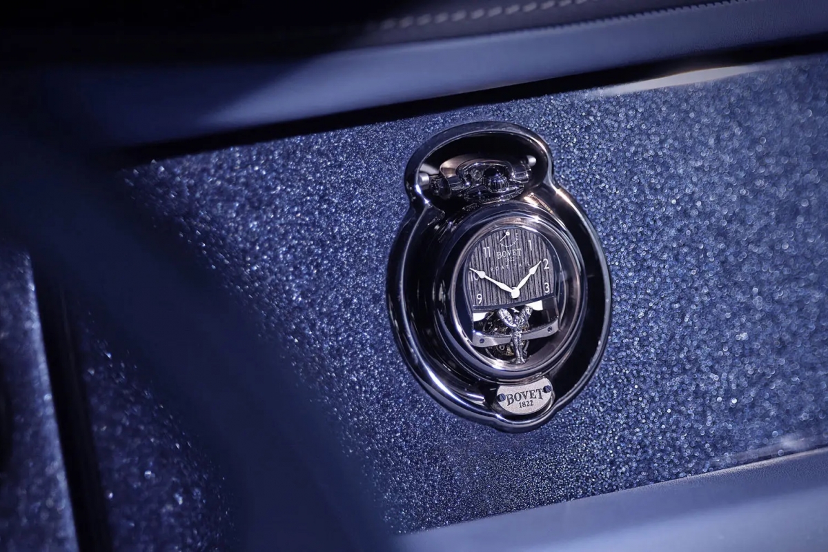 Os relógios construídos especialmente para este Rolls-Royce Boat Tail pela Bovet têm uma caixa em ouro branco de 18 quilates, 44 mm de diâmetro, e 14 mm de espessura. Têm mostrador dos dois lados, em que num deles está a grelha estilizada da Rolls-Royce e a estatueta Spirit of Ecstasy. No outro está a imagem do modelo Boat Tail pintado à mão na mesma cor azul do carro.