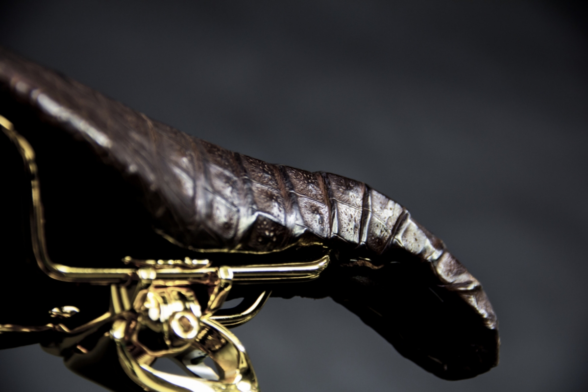Mas não é só; o modelo que está catalogado como uma bicicleta de montanha capaz de enfrentar trilhos e caminhos exigentes em fora de estrada, e não como peça de exposição, também está decorado com 600 diamantes negros e mais de 500 safiras douradas apenas no emblema, enquanto o banco e outros apontamentos estão revestidos em pele de crocodilo.