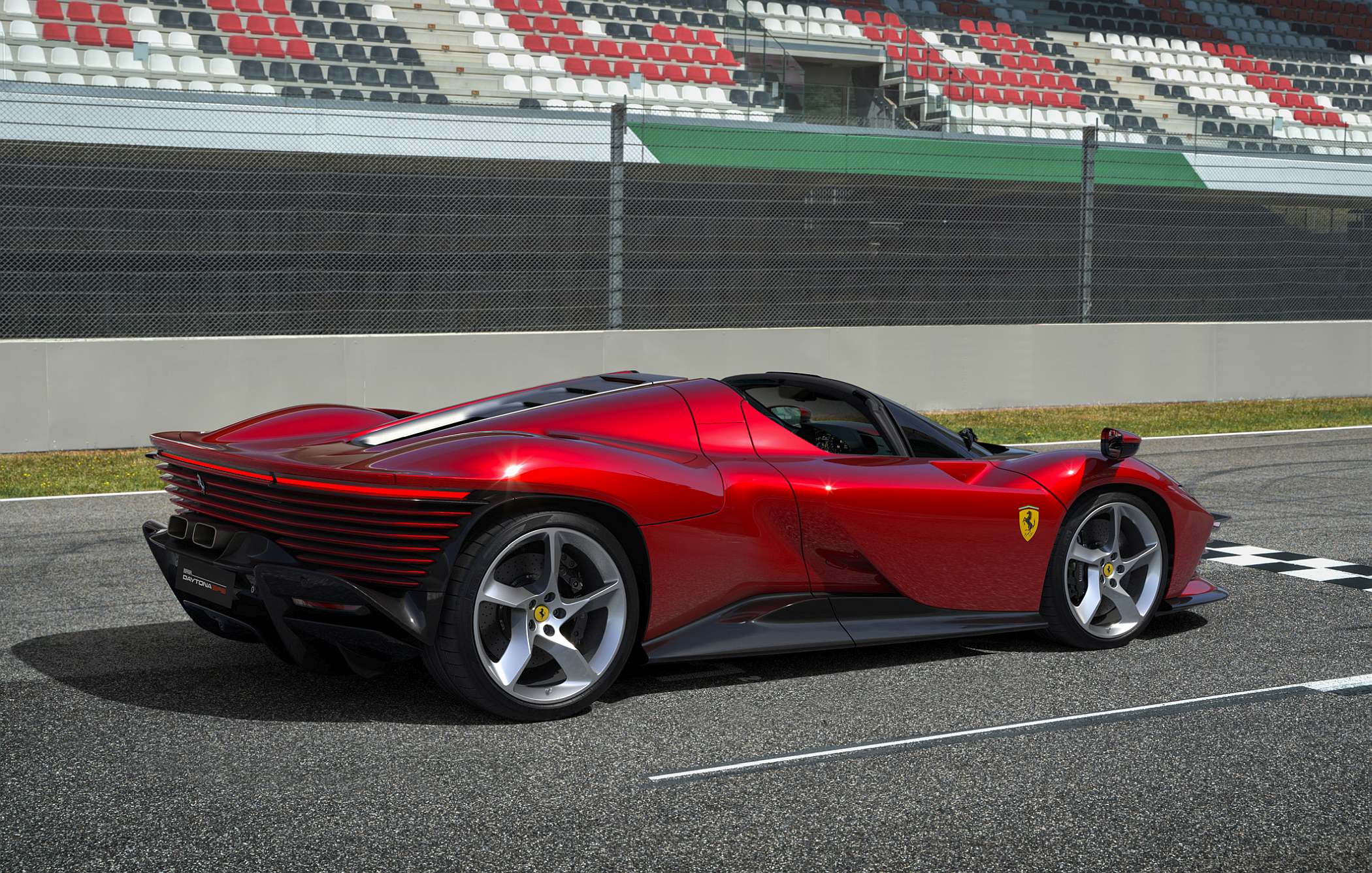 Por seu turno, a secção traseira é bastante imponente, com um formato tridimensional, inspirado no 330 P4, demarcando-se pelo conjunto de lâminas verticais que ‘alargam’ a secção posterior, mostrando na parte superior uma estreita faixa luminosa logo abaixo do spoiler superior. Ao centro, os dois escapes ganham relevância, aliando-se ao difusor de grandes dimensões. O peso total deste Daytona SP3 é de apenas 1485 kg.