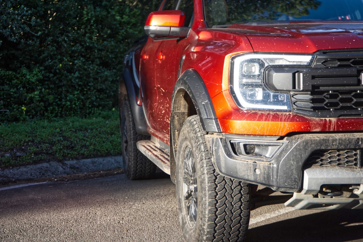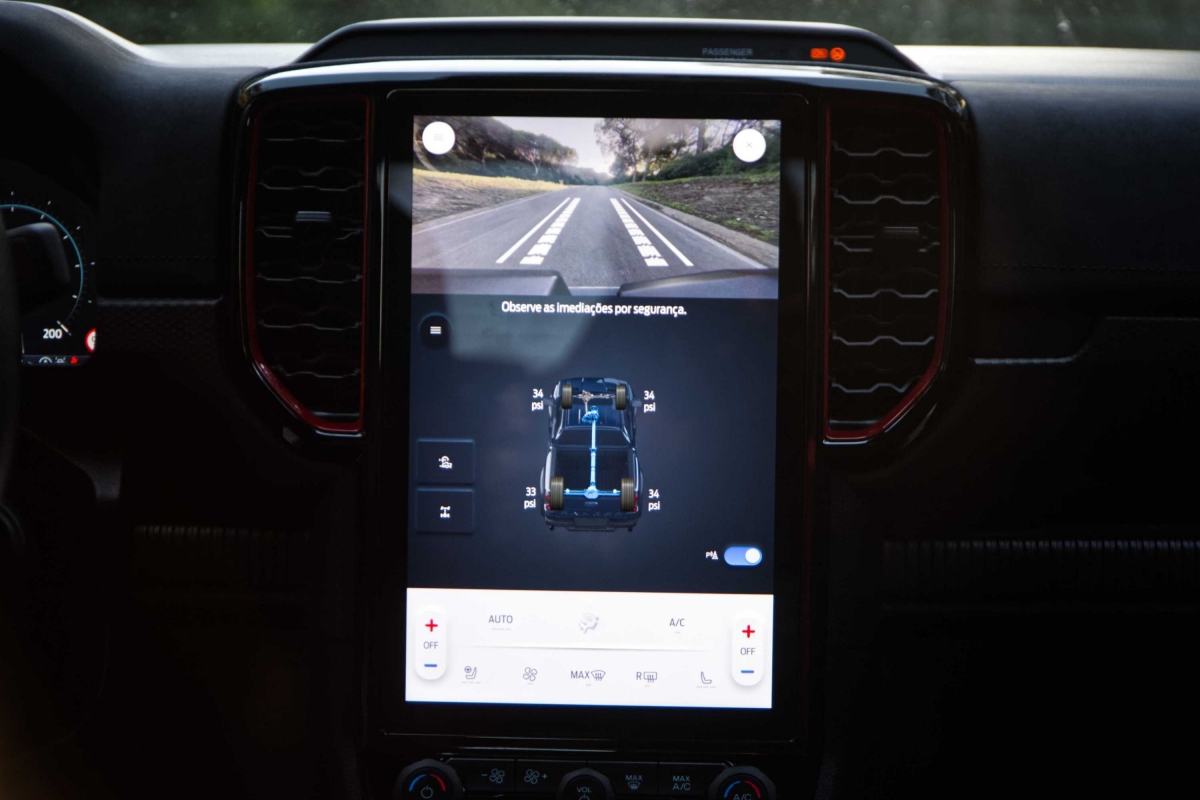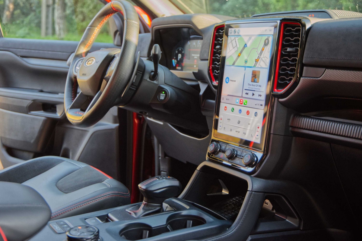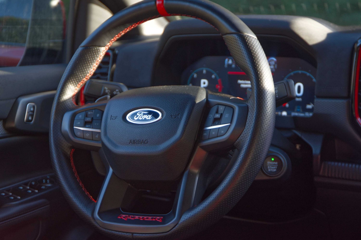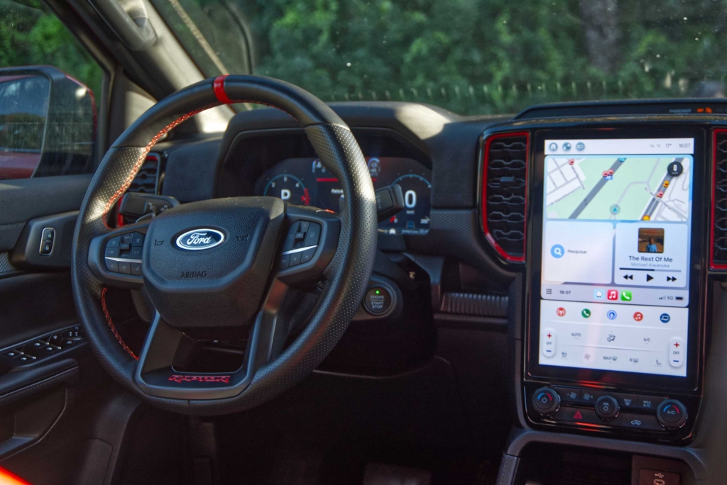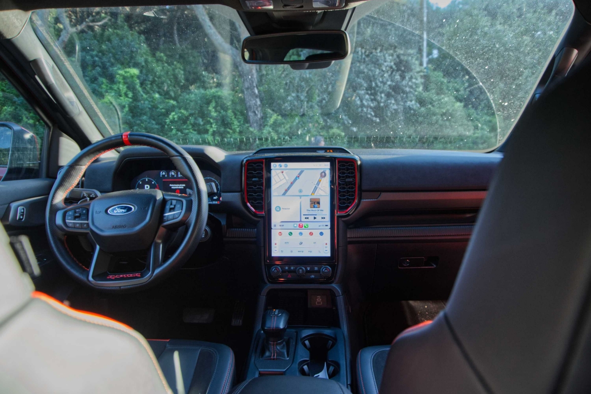 Seria de esperar que uma pick-up com suspensão alta e equipamento específico para todo-o-terreno, como a Ranger Raptor, fosse difícil de conduzir durante as tarefas mundanas do dia a dia, mas não é esse o caso. Apesar de ter sido construída para utilização fora de estrada, a Ranger Raptor é surpreendentemente refinada em estradas pavimentadas. A caixa automática de 10 velocidades tem um funcionamento suave, tanto em autoestrada como em cidade. O controlo de velocidade de cruzeiro adaptativo e o assistente de manutenção na faixa de rodagem funcionaram bastante bem. Os botões montados no volante exigiram apenas um simples olhar para acionar os sistemas. Já a resposta do ecrã de infoentretenimento aos nossos comandos, foi por vezes lenta e não ficámos fãs dos controlos da climatização, divididos entre o ecrã tátil e botões físicos.