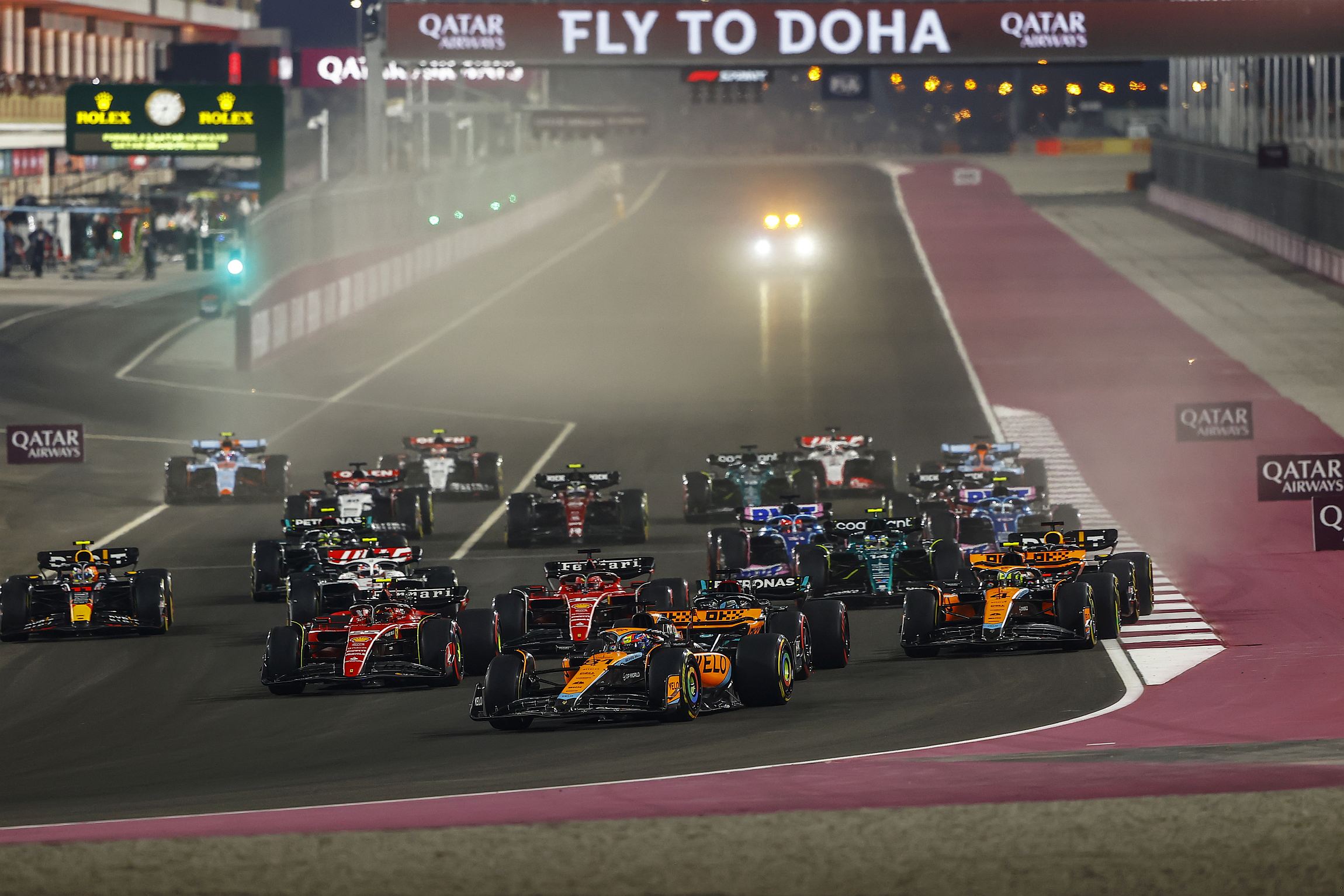 Na partida, Russell depressa saltou para segundo, ameaçando Piastri, enquanto os dois Ferrari subiam também para as posições seguintes, em terceiro e quarto, ao passo que Verstappen e Norris se atrasavam com arranques menos bons.