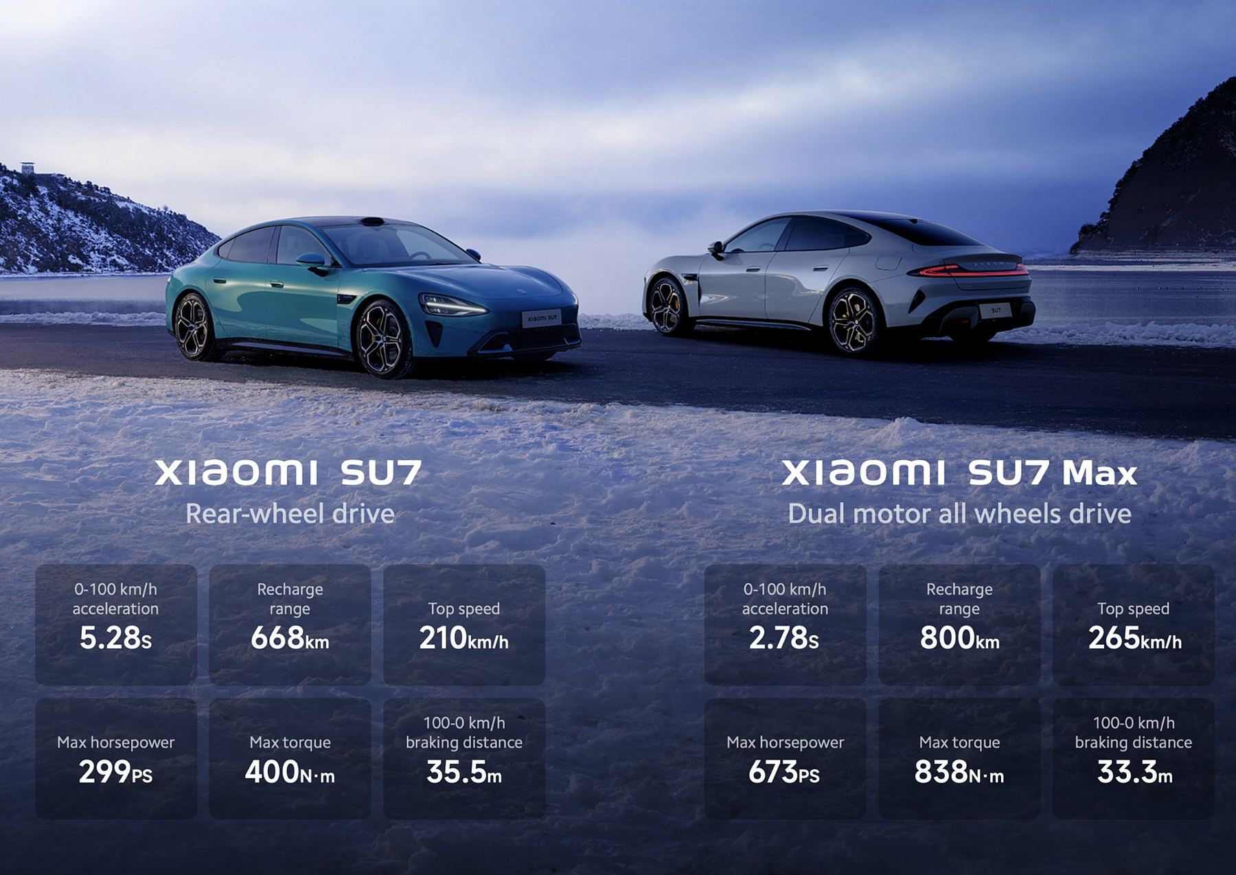 Tecnicamente, a Xiaomi recorre a uma plataforma de nome Modena, compatível com sistemas elétricos de 400 V e de 800 V, sendo este último capaz de carregamentos mais rápidos ao aceitar postos de carga mais potentes. O modelo de entrada, denominado V6 (de forma confusa), tem apenas um motor elétrico atrás para uma potência de 299 CV e 400 Nm de binário, estando associado a uma bateria de 73.6 kWh para uma autonomia de 668 quilómetros (ciclo de homologação chinês). Este modelo apenas tem arquitetura elétrica de 400 V, logo não carrega de forma mais rápida.