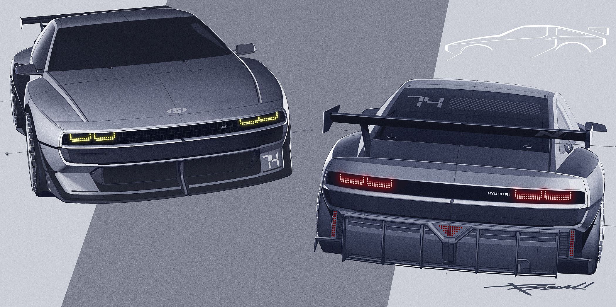 Em termos de design, o N Vision 74 presta uma homenagem ao concept do Hyundai Pony Coupe de 1974, que foi desenvolvido pelo lendário designer automóvel Giorgetto Giugiaro. O concept foi então incorporado em protótipos para o primeiro carro desportivo de produção da Hyundai. Embora acabasse por não chegar à fase de produção, a atitude ousada deu o mote para toda a empresa, com este concept a herdar o perfil dinâmico e o pilar B único do concept Pony Coupe de 1974. O N Vision 74 é também inspirado pelo protótipo Hyundai N 2025 Vision Gran Turismo, que foi revelado em 2015 com o lançamento da marca N para antecipar o futuro da alta performance baseada no hidrogénio.