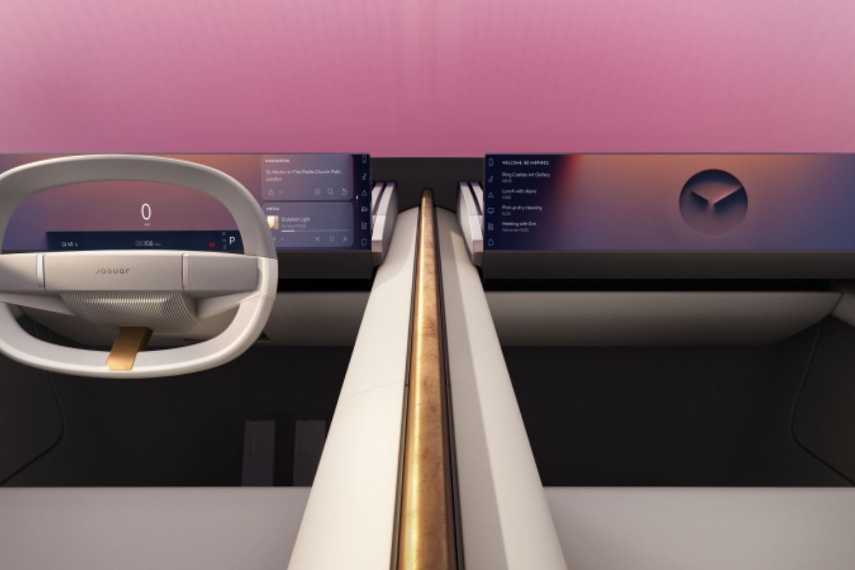 O interior está repleto de tecnologias acionáveis. O diretor de design de interiores da Jaguar, Tom Holden, explica que “os ecrãs deslizam silenciosa e teatralmente a partir do painel de instrumentos, enquanto as áreas de arrumação motorizadas deslizam suavemente quando solicitadas, revelando salpicos ocultos de cores exuberantes. Acreditamos que a tecnologia deve melhorar a experiência de luxo moderna, não dominar a arquitetura, e o ecrã digital no centro do painel de instrumentos é um exemplo desta filosofia. O ecrã Clearsight substitui o espelho retrovisor tradicional, melhorando a visibilidade geral”.