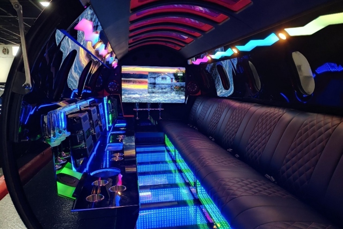 E se por fora o Jet Limo já é um dos mais excêntricos automóveis que pode guiar, no interior encontrará uma decoração digna de um casino, onde não faltam luzes de todas as cores, superfícies vidradas, acabamentos em couro e um sistema de som da Showtime Audio com 17.000 watts. Também há uma televisão com ecrã de 42 polegadas e, no posto de pilotagem, um banco de competição.