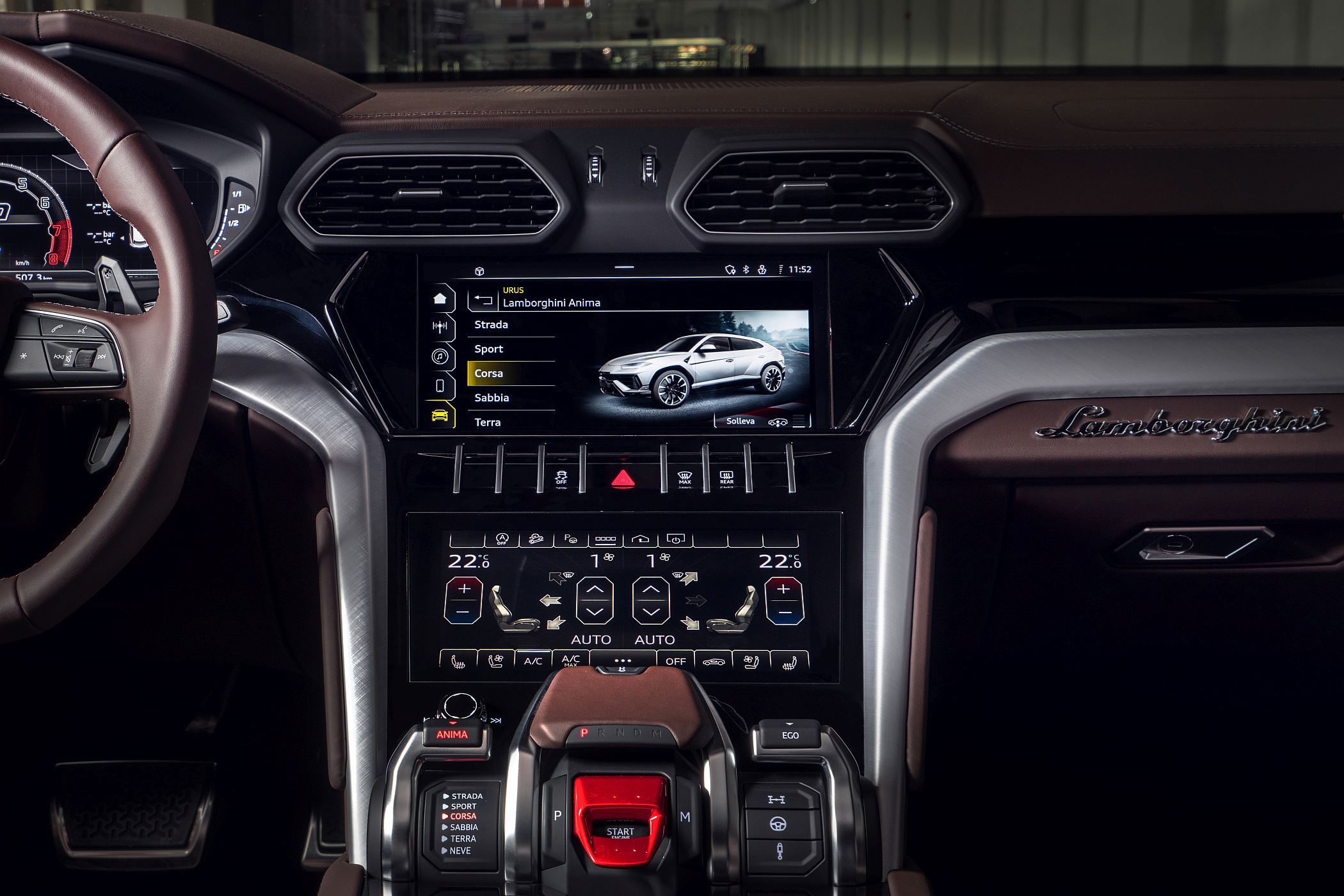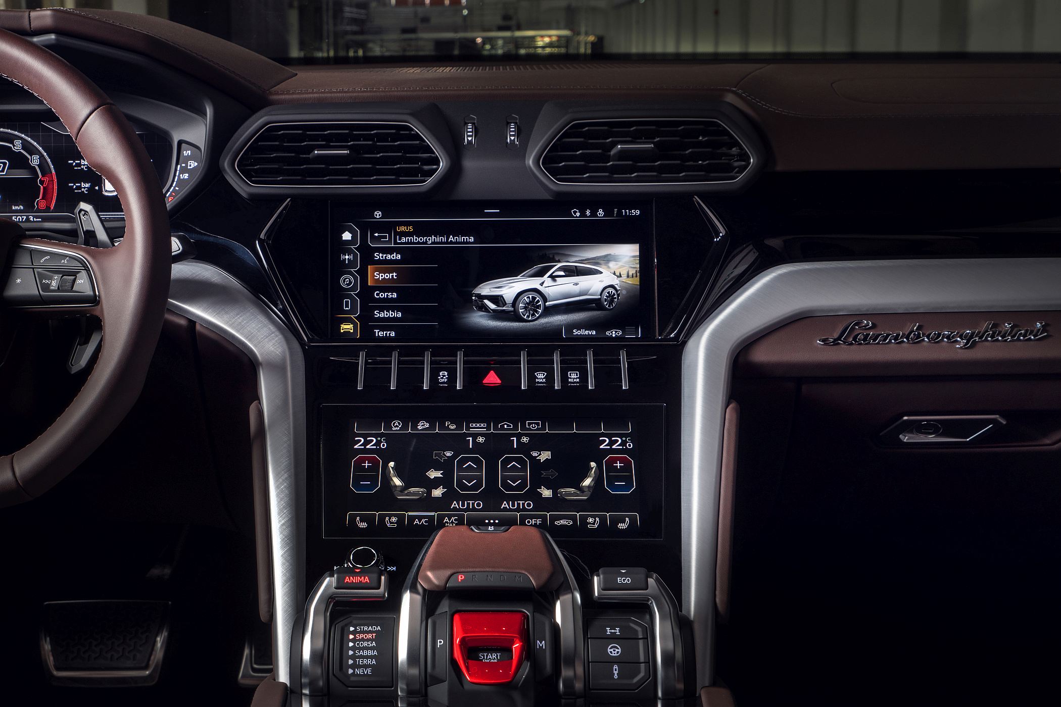 O chassis do Urus, com suspensão pneumática adaptativa, permite variar entre a condução em asfalto nos modos de condução ‘Strada’, ‘Sport’, ‘Corsa’ e ‘Ego’ e nos pisos de terra, neve e areia nos modos de condução… ‘Terra’, ‘Neve’ e ‘Sabbia’ (areia).