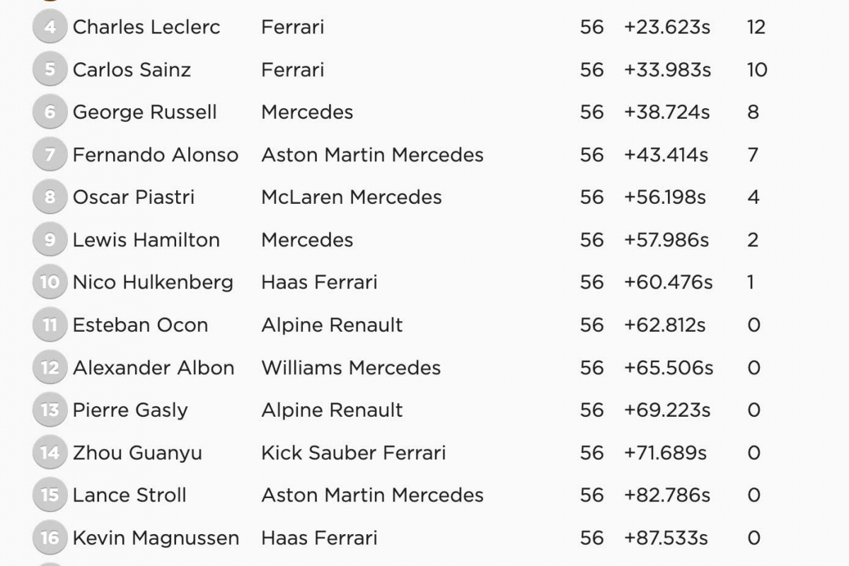 O tricampeão mundial, que no sábado já vencera a corrida sprint e este domingo largou do primeiro lugar da grelha, gastou 1:40.52,554 horas para cumprir as 56 voltas previstas, batendo o britânico Lando Norris (McLaren), segundo, por 13,773 segundos e o mexicano Sérgio Pérez (Red Bull), que foi terceiro, por 19,160.