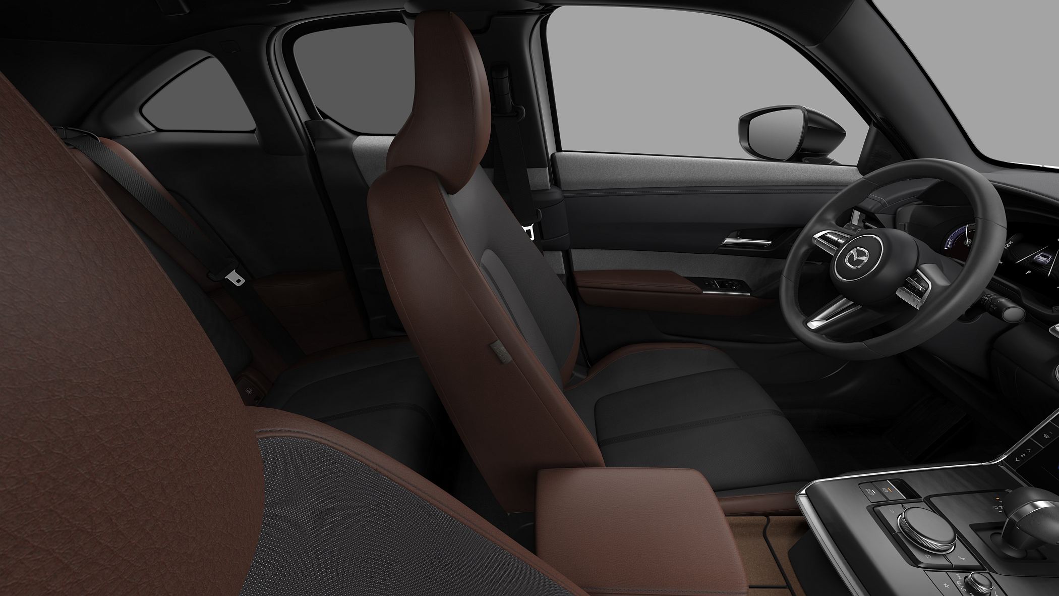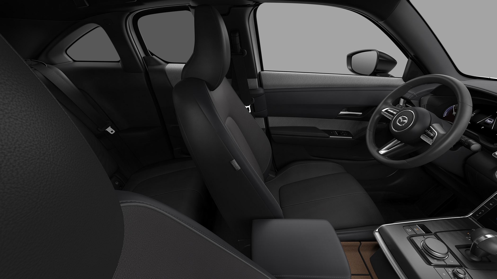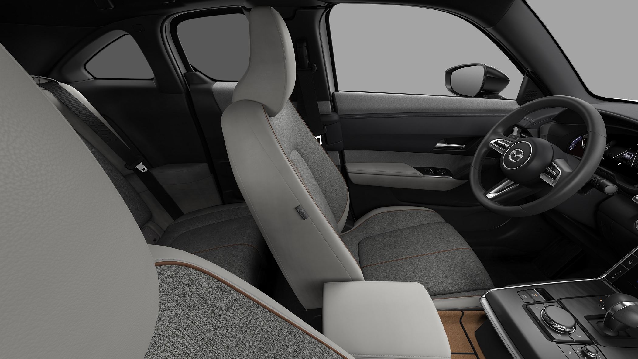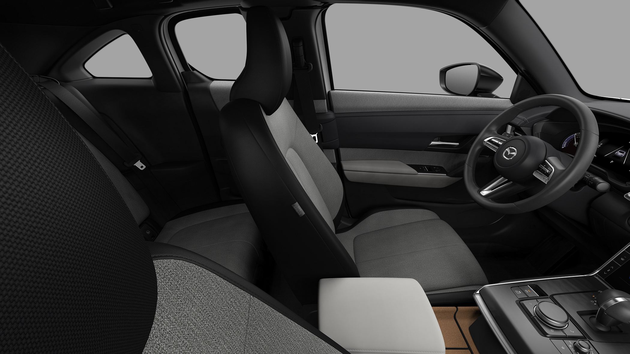 Em complemento aos esquemas de cores interiores Modern Confidence (de base branca) e Industrial Vintage (castanha) disponíveis até à data, o MX-30 de 2022 introduz uma nova especificação Urban Expression, de base preta. Esse novo interior integralmente preto é pontuado por detalhes em cinzento e em branco nos estofos em tecido, do tipo ganga, bem como pela adoção de cortiça castanho-escura na consola e nas pegas e guarnições das portas.