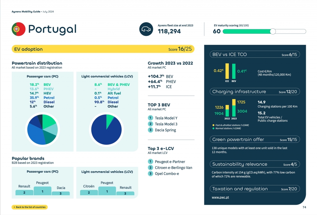 Portugal continua a liderar no caminho da sustentabilidade e mobilidade elétrica, alcançando a pontuação máxima de 15/15 na “Oferta de Motorizações Ecológicas”, com 138 modelos únicos vendidos nos últimos 12 meses. Além disso, o país destaca-se com uma pontuação de 4/5, na “Relevância da Sustentabilidade”, com uma intensidade carbónica de 154 g (gCO.eq/kWh) e 77% de emissões de baixo carbono, dos quais 72% são renováveis.