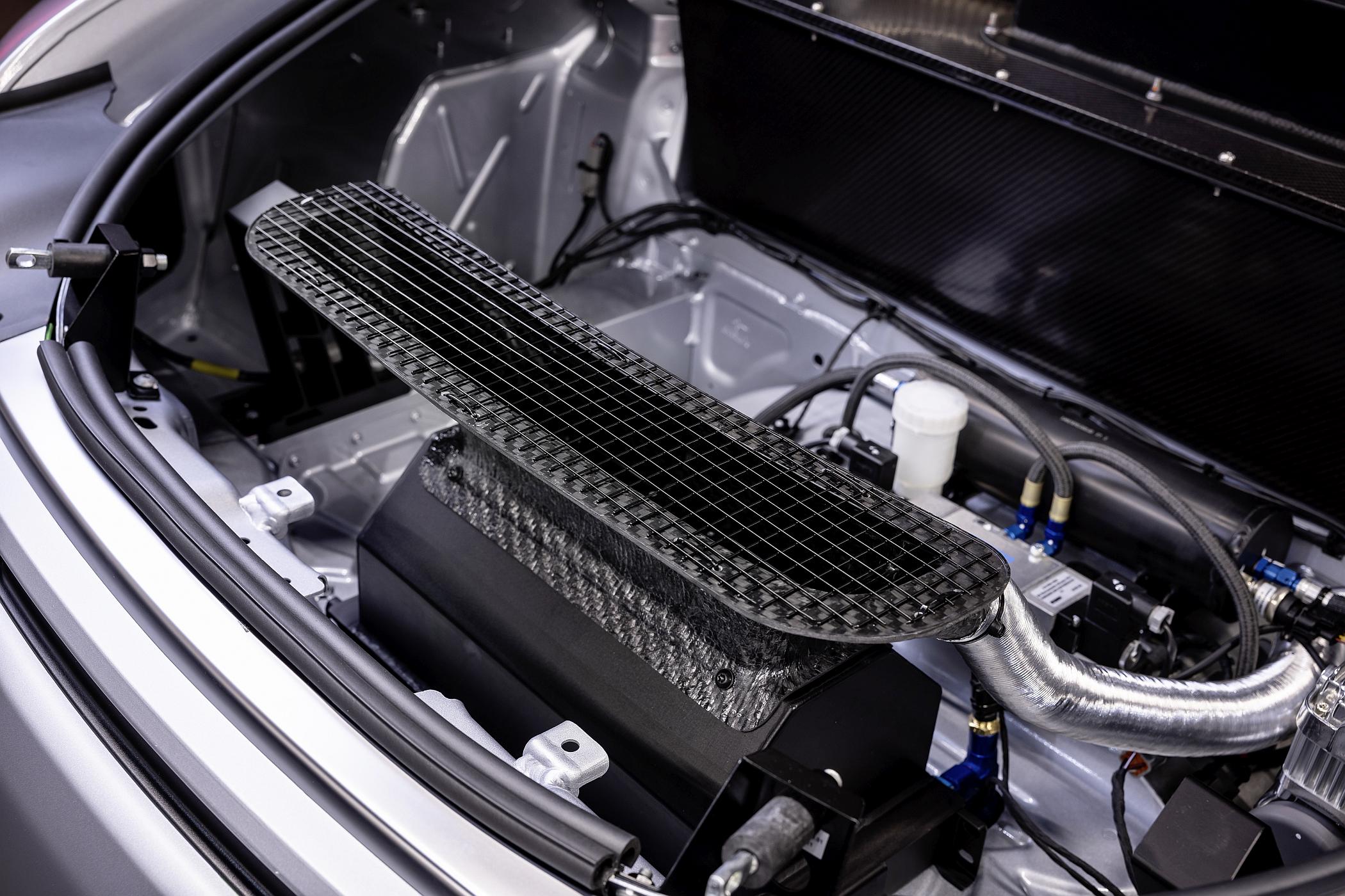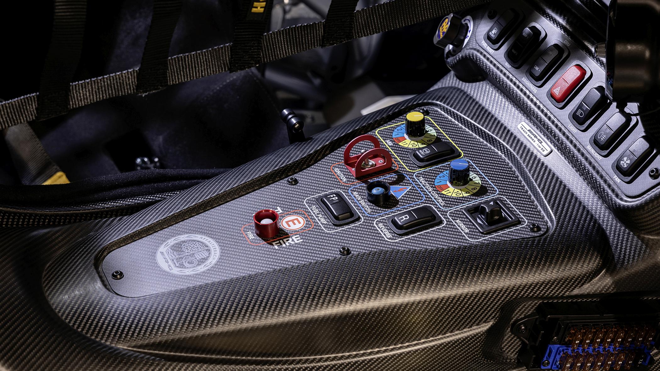 De resto, à bacquet de competição com cinco de cinco pontos juntam-se outros elementos especiais que o afastam decisivamente da versão de estrada, como a ‘jaula de segurança’ em aço de alta resistência que surge aparafusada à estrutura em alumínio do veículo, até à ‘porta’ de extração rápida situada no tejadilho. A célula de segurança do condutor está feita em fibra de carbono, permitindo também facilidade de movimentos aos condutores mais altos. A marca aponta que esta estrutura de segurança cumpre os requisitos da FIA. Não falta também um extintor de alta capacidade próprio da competição.