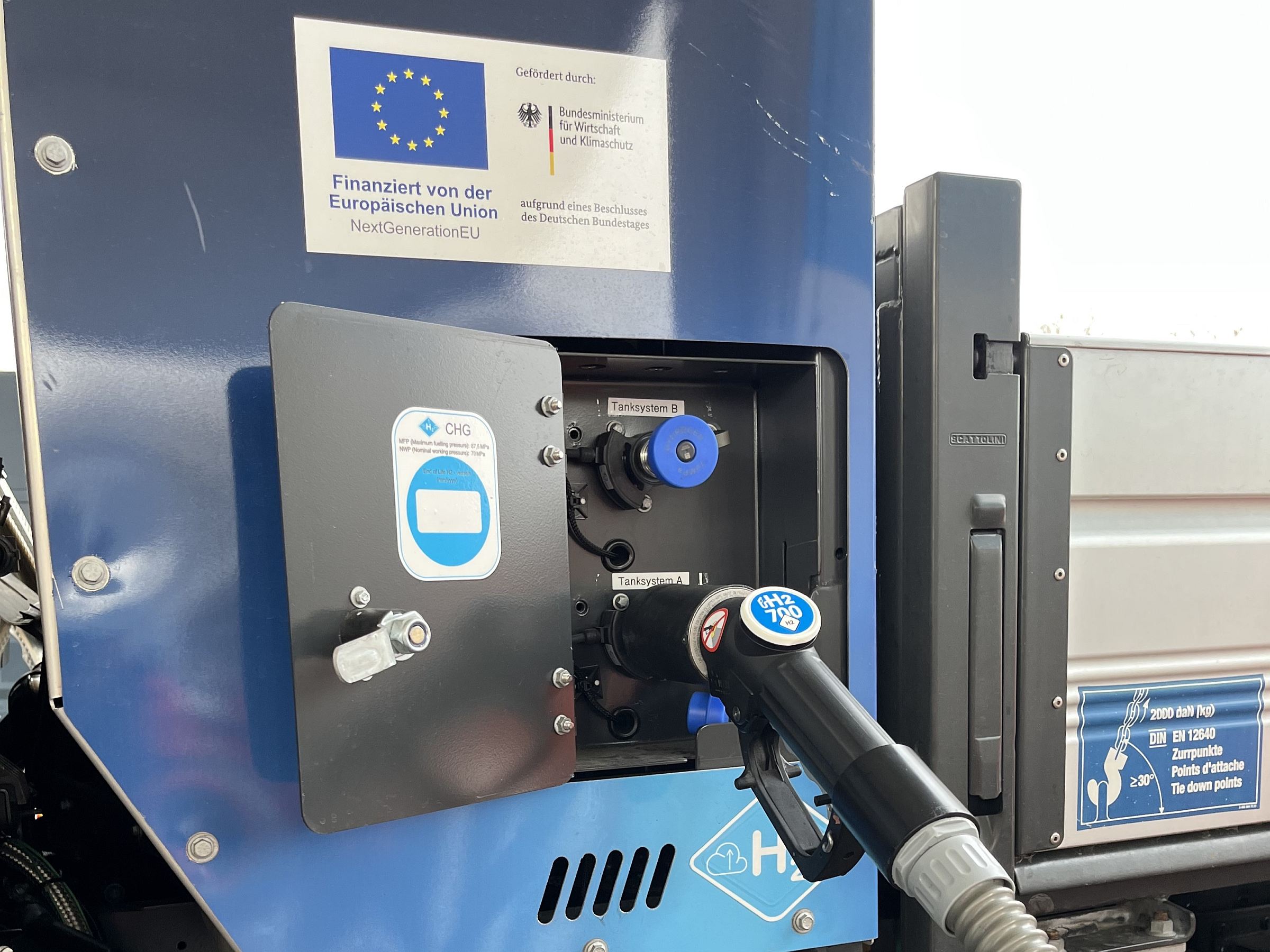 O processo de combustão do hidrogénio gera apenas água, que sai do veículo como vapor através do sistema de escape. A distância entre eixos e o comprimento da plataforma permitem a instalação dos tanques de hidrogénio atrás da cabina do condutor. Os quatro tanques de alta pressão de 700 bar acumulam um total de 14 kg de hidrogénio gasoso, estando combinados em dois tanques duplos, cada um operado de forma independente através de uma unidade de controlo dedicada.