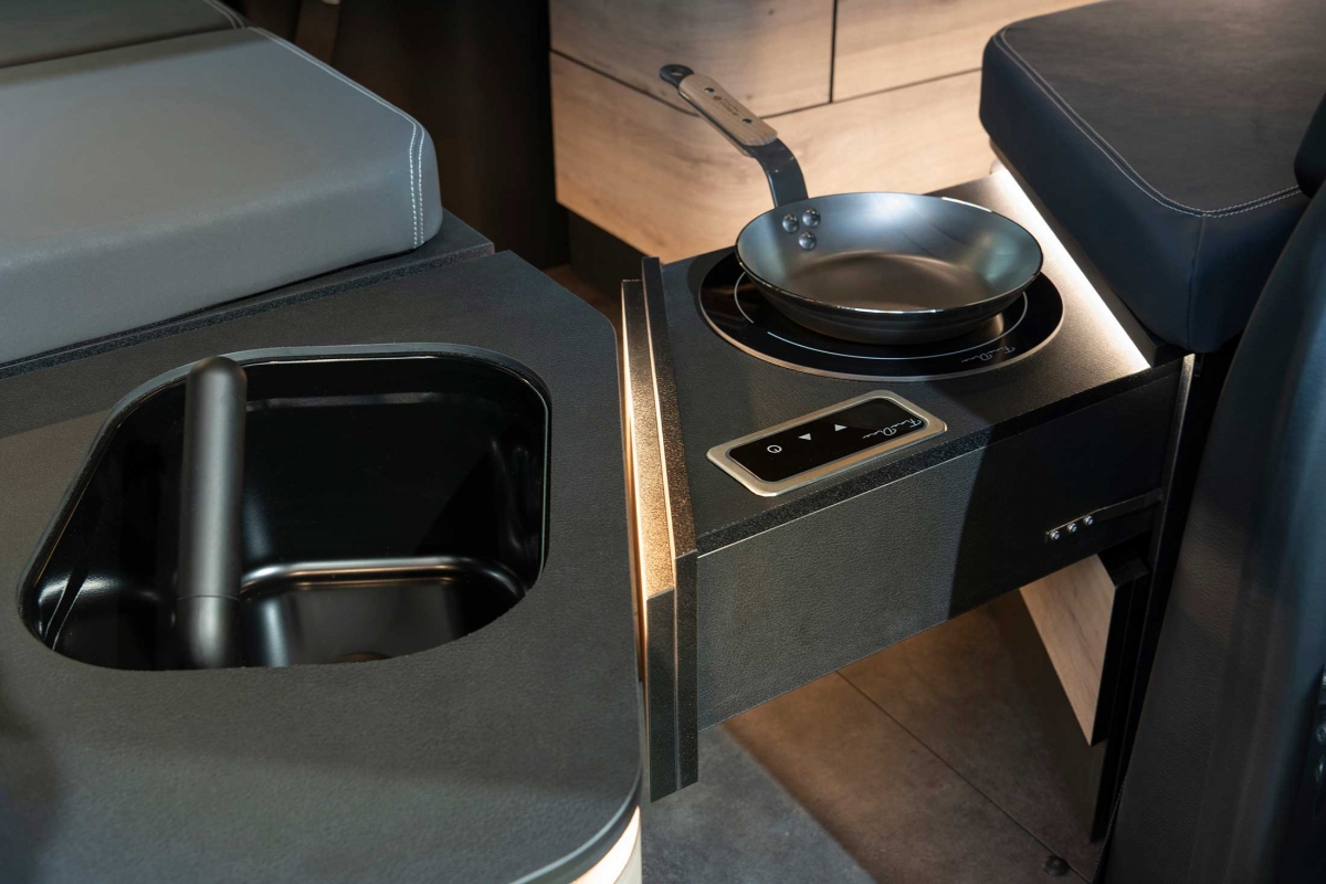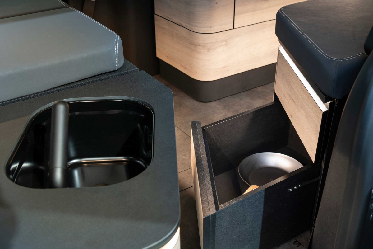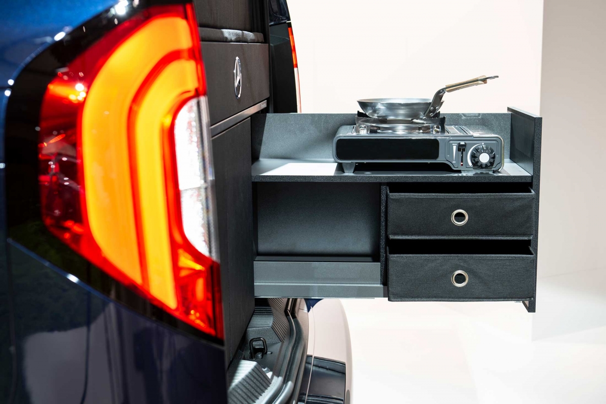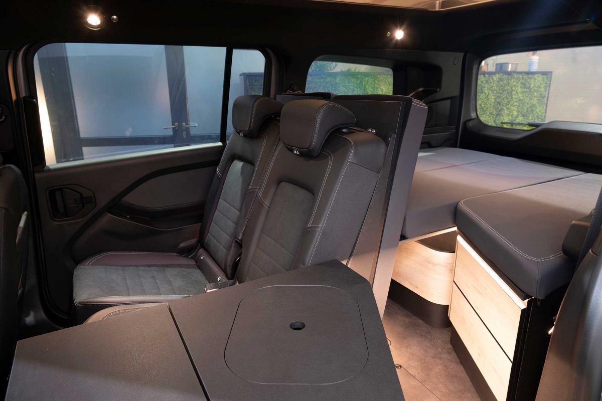 Na parte traseira existe outra opção para dormir, com um colchão dobrável, de 2 metros por 1,15 metros. Na fila de bancos traseiros, atrás do banco do condutor, existe um lava-loiça e uma caixa frigorífica de 16 litros com compressor. Há ainda uma placa de aquecimento por indução e uma gaveta com fogão a gás, que pode ser puxada do interior do veículo, permitindo assim a opção de cozinhar no exterior. As peças de mobiliário do interior podem ser facilmente removidas por duas pessoas em menos de 5 minutos.