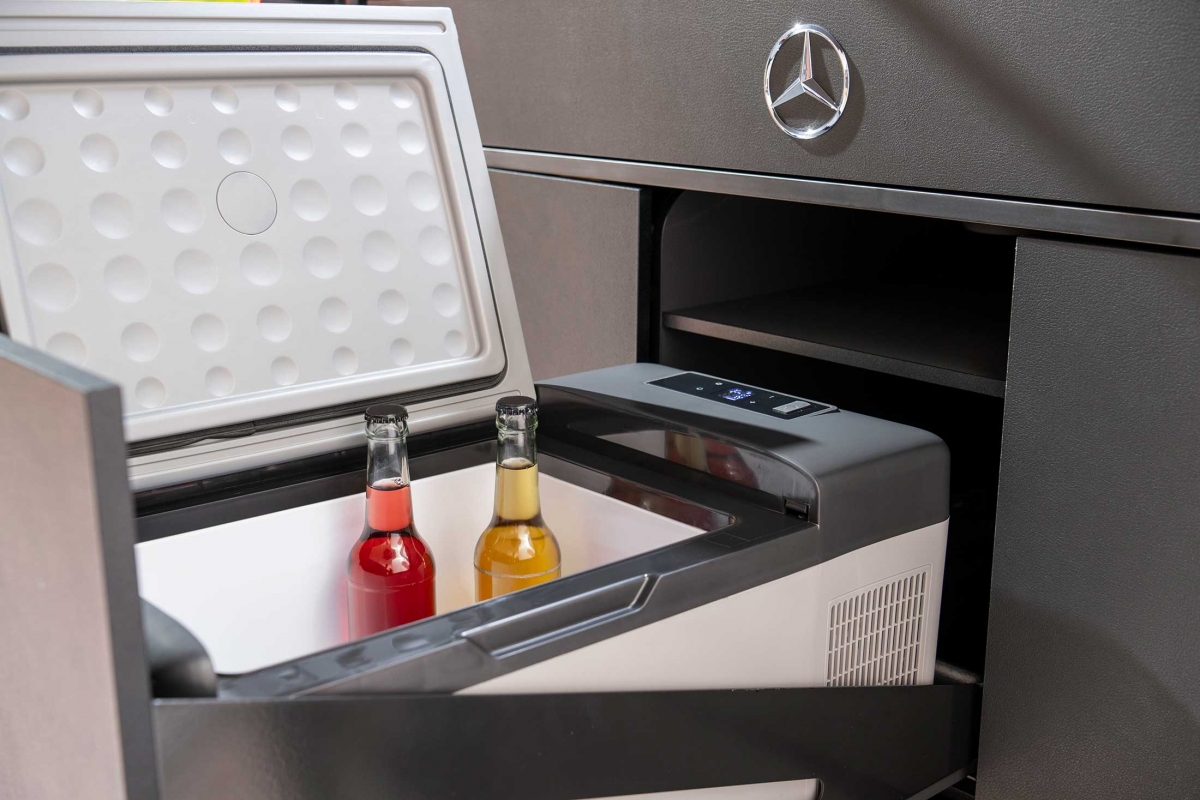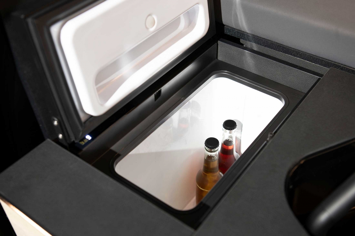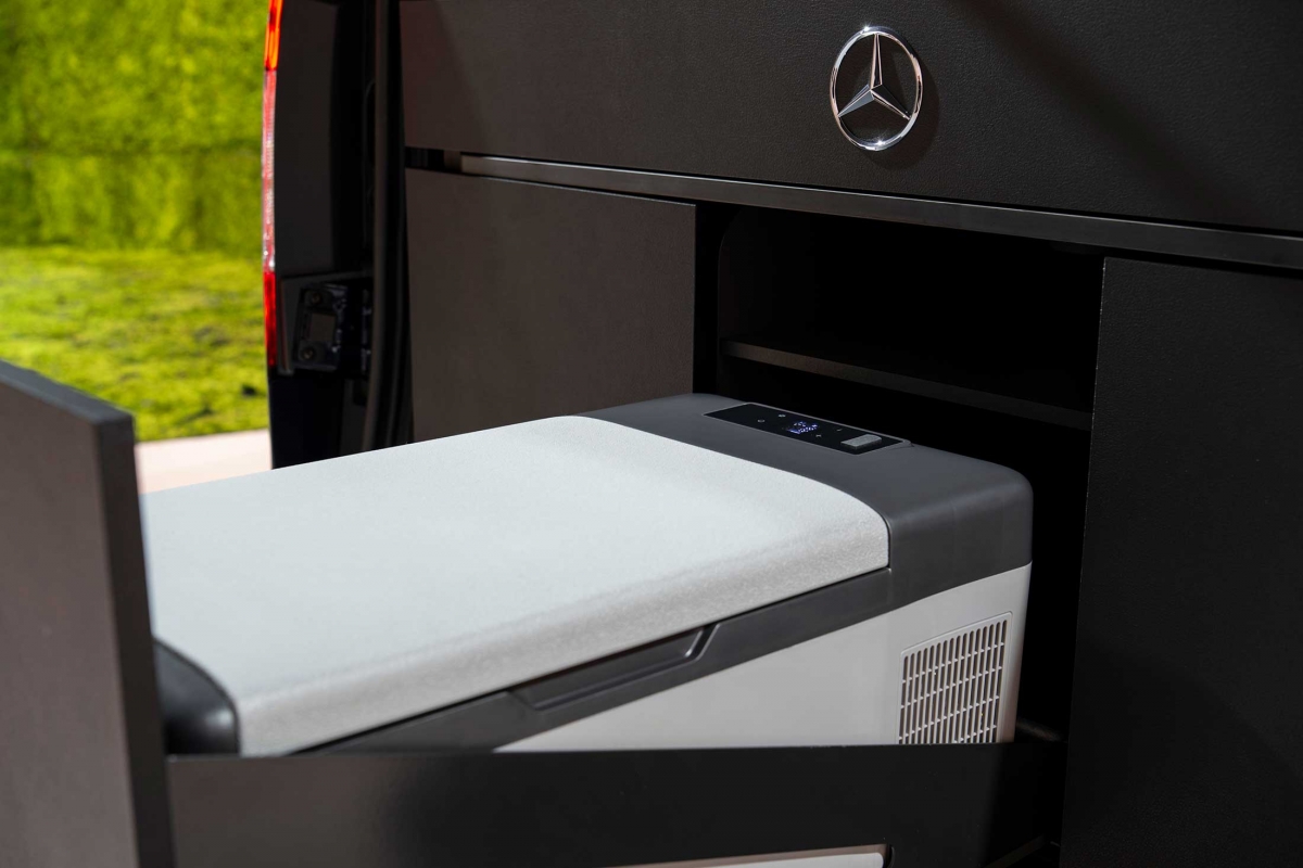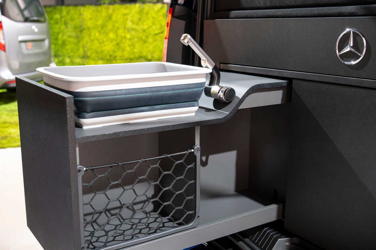 Na parte traseira existe outra opção para dormir, com um colchão dobrável, de 2 metros por 1,15 metros. Na fila de bancos traseiros, atrás do banco do condutor, existe um lava-loiça e uma caixa frigorífica de 16 litros com compressor. Há ainda uma placa de aquecimento por indução e uma gaveta com fogão a gás, que pode ser puxada do interior do veículo, permitindo assim a opção de cozinhar no exterior. As peças de mobiliário do interior podem ser facilmente removidas por duas pessoas em menos de 5 minutos.