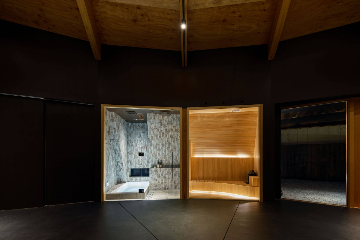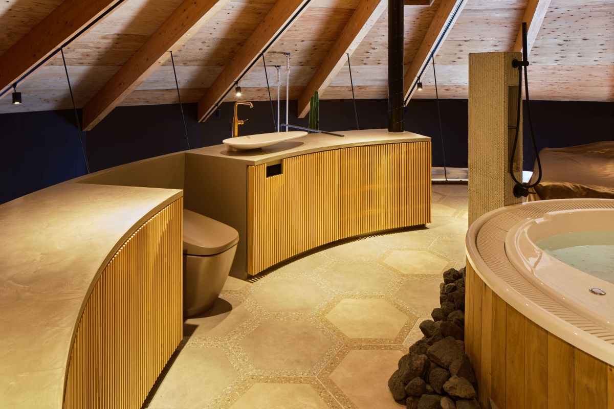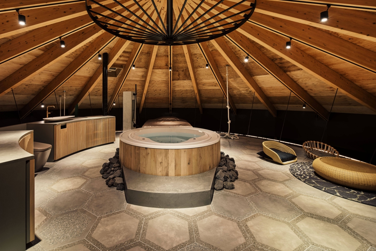 Toda a estrutura repousa sobre um eixo central e sobre as 24 paredes inclinadas do lado de fora, deixando um espaço aberto. No primeiro andar, em forma de terraço circular, encontramos uma zona de convívio, com uma casa de banho com jacuzzi central, um quarto e um escritório. Toda a zona inferior está reservada para a cozinha e para a sala de estar, o espaço que é partilhado com os automóveis de luxo do proprietário. Esta área ampla, sem colunas ou reforços, em que pessoas e carros podem circular livremente, pode variar e adaptar-se às necessidades de cada momento.
