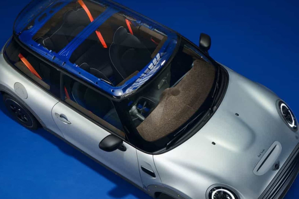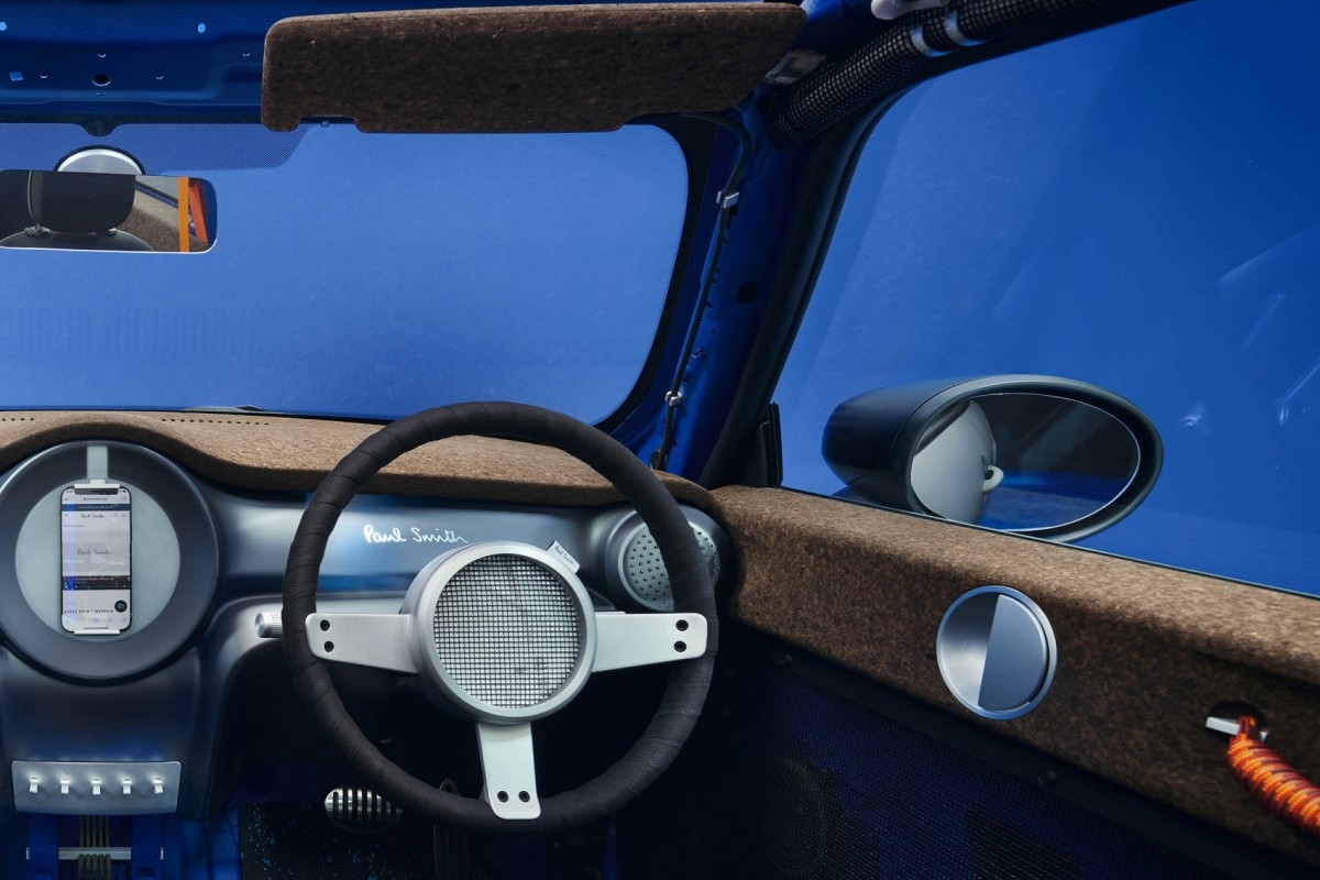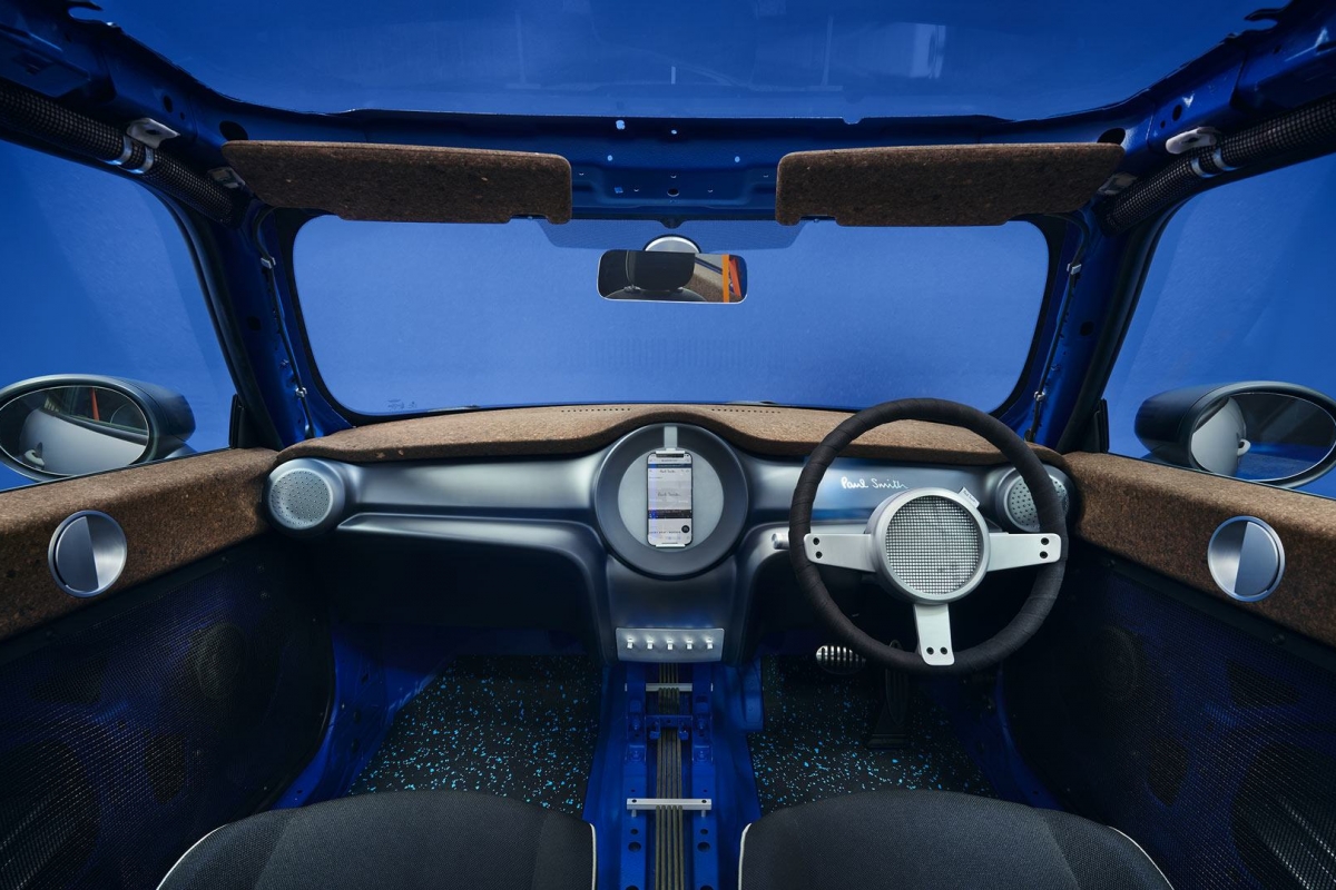 O estilista Paul Smith aceitou o desafio de reduzir o Mini Cooper SE ao essencial, substituindo decoração e equipamentos por materiais reciclados e ecológicos.