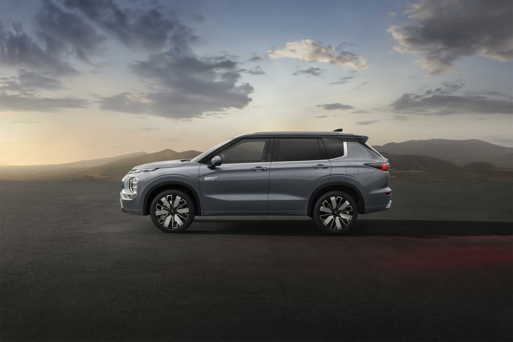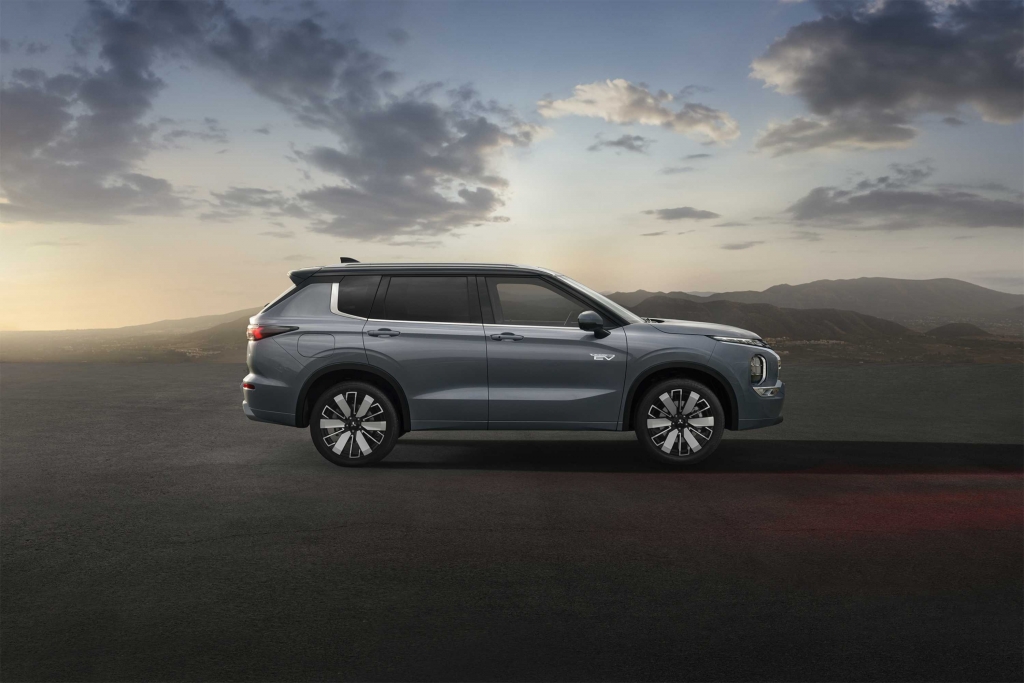De perfil, o Outlander PHEV revela a sua construção sólida, com linhas musculadas e o proeminente pilar traseiro Jet Tail Fin, que adiciona dinamismo ao visual e dá uma aparência flutuante à linha do tejadilho.