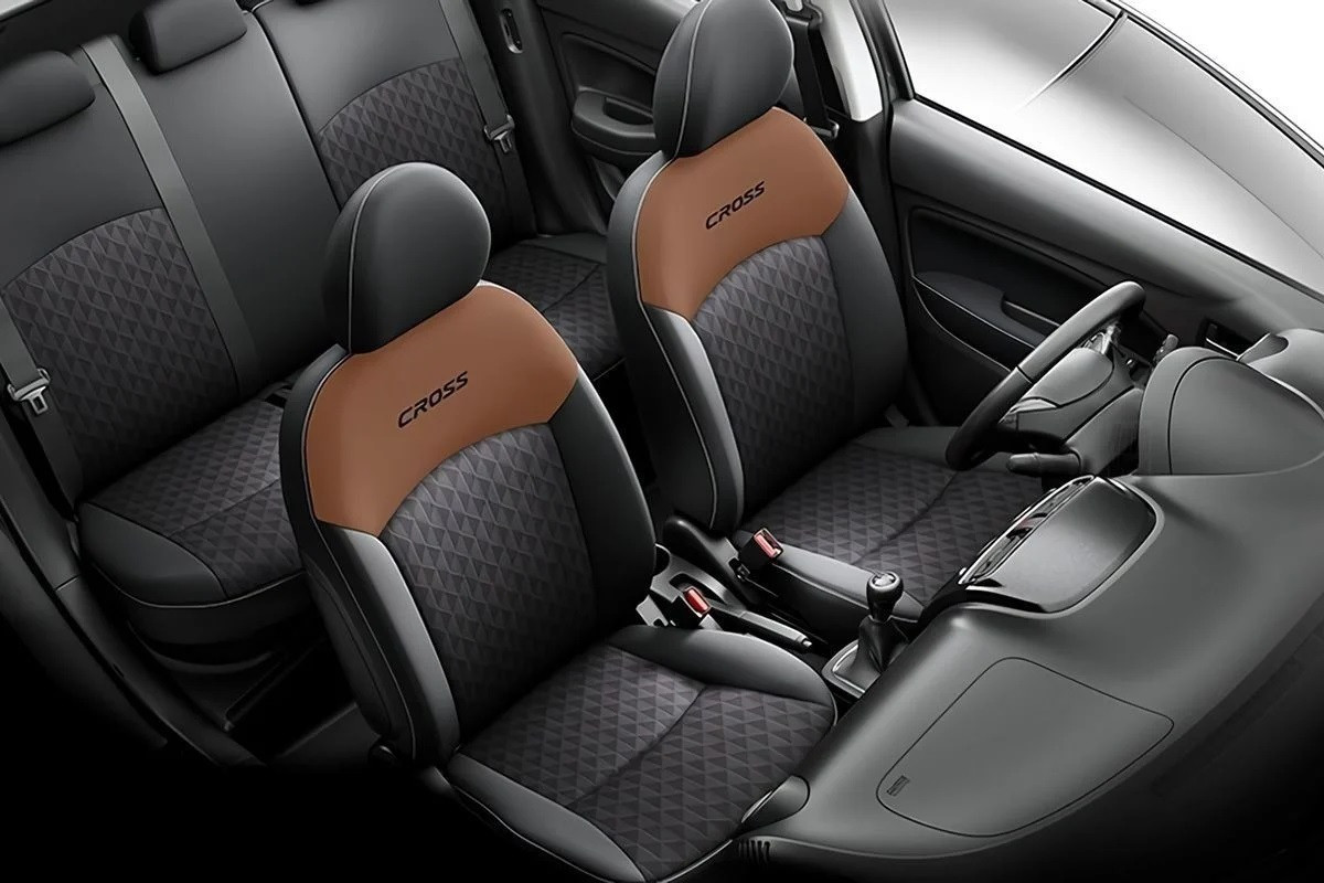 No habitáculo – tão espaçoso que chega a surpreender num carro tão pequeno (lotação para cinco ocupantes –, bancos em dois tons revestidos a pele e tecido, com a inserção “Cross” nos encostos dianteiros, saídas de ventilação com aplicação em preto brilhante.
