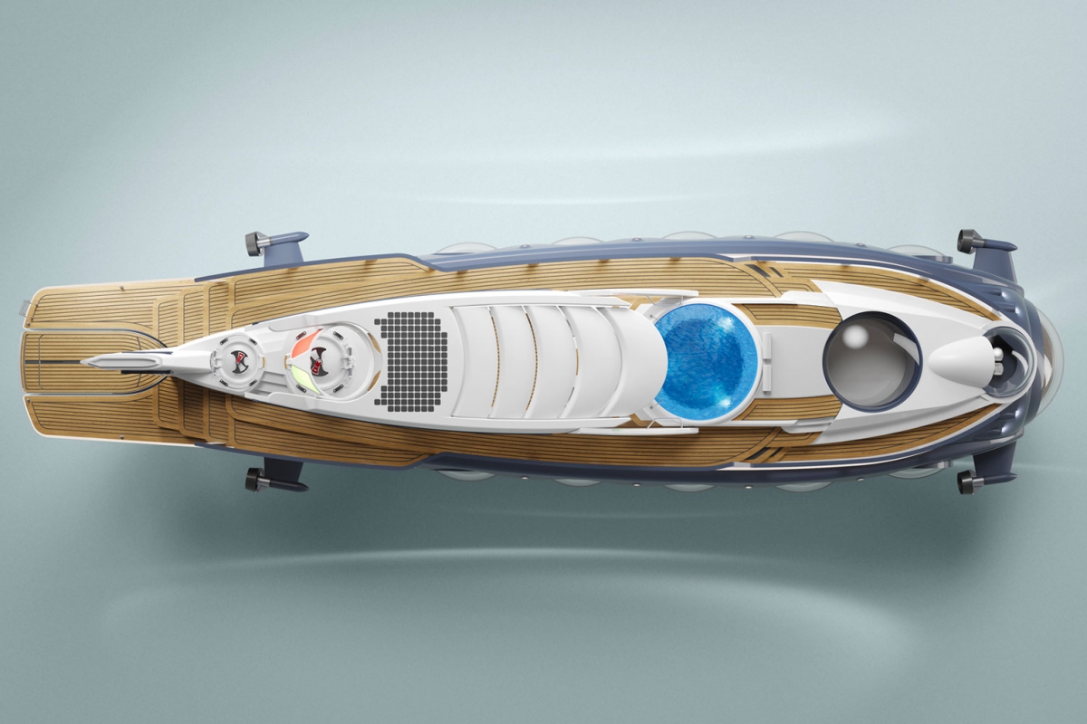 Como superiate, o Nautilus cumpre todos os requisitos, oferecendo piscina, bar, salão e zona de refeições no exterior, instalados em estruturas que são retráteis para que possam ‘esconder-se’ quando se ativa o modo submarino.