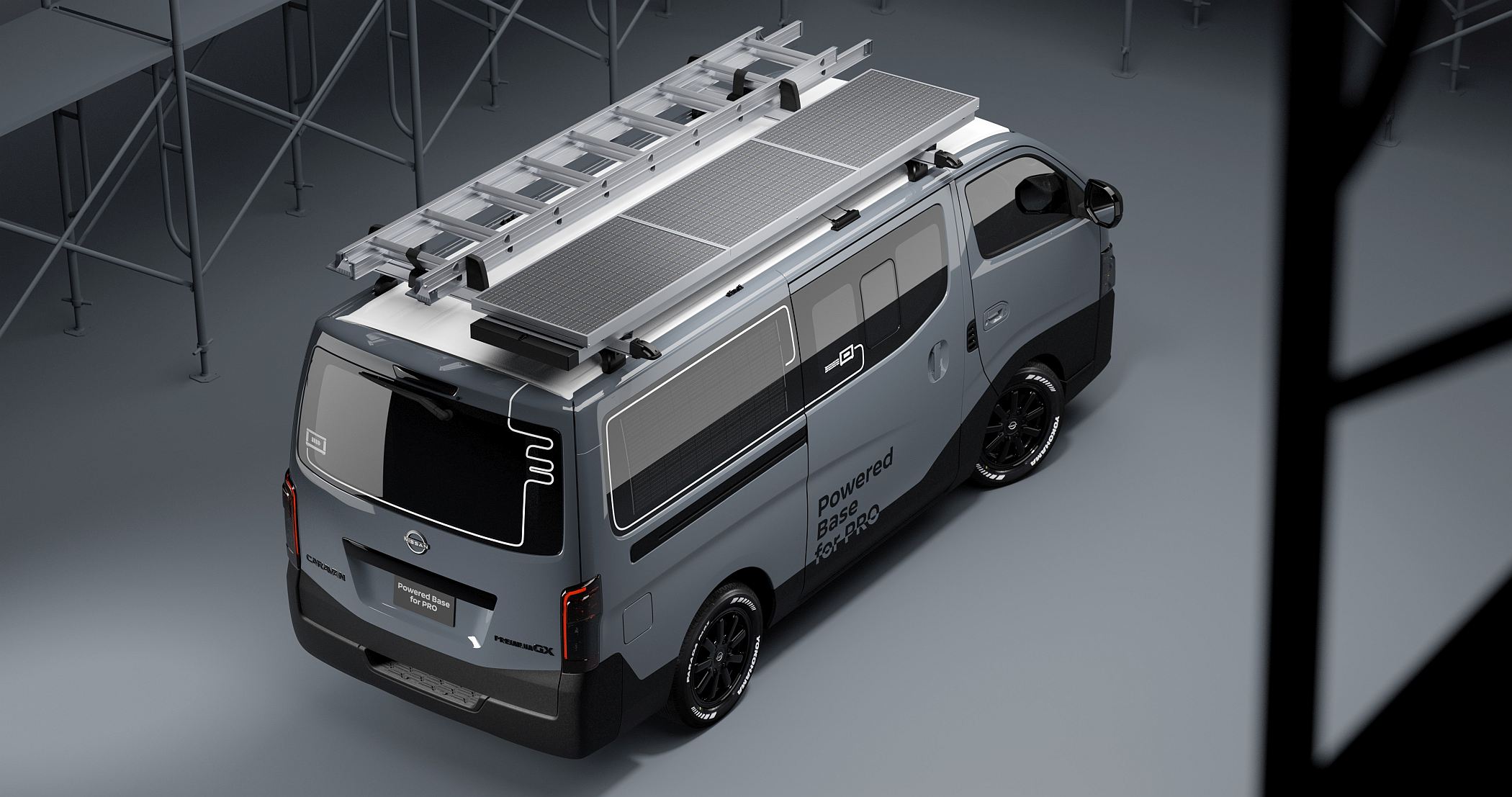 Também em exposição estará o Powered Base for Pro (Caravan), uma caravana personalizada e equipada para apoiar profissionais em diferentes áreas de trabalho, dispondo de quatro unidades de carregamento (‘power packs’) portáteis que consistem em baterias recarregáveis provenientes do Nissan Leaf. Tem também painéis solares e barras no tejadilho.