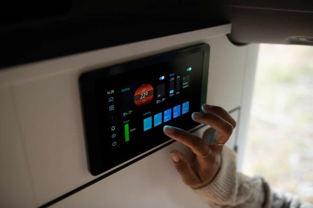 A bordo é possível controlar o aquecimento e as luzes, e verificar os níveis da água, o estado da bateria, num ecrã de 7 polegadas instalado na “zona de estar”, ou no smartphone por meio de uma app utilizando a conexão por bluetooth.