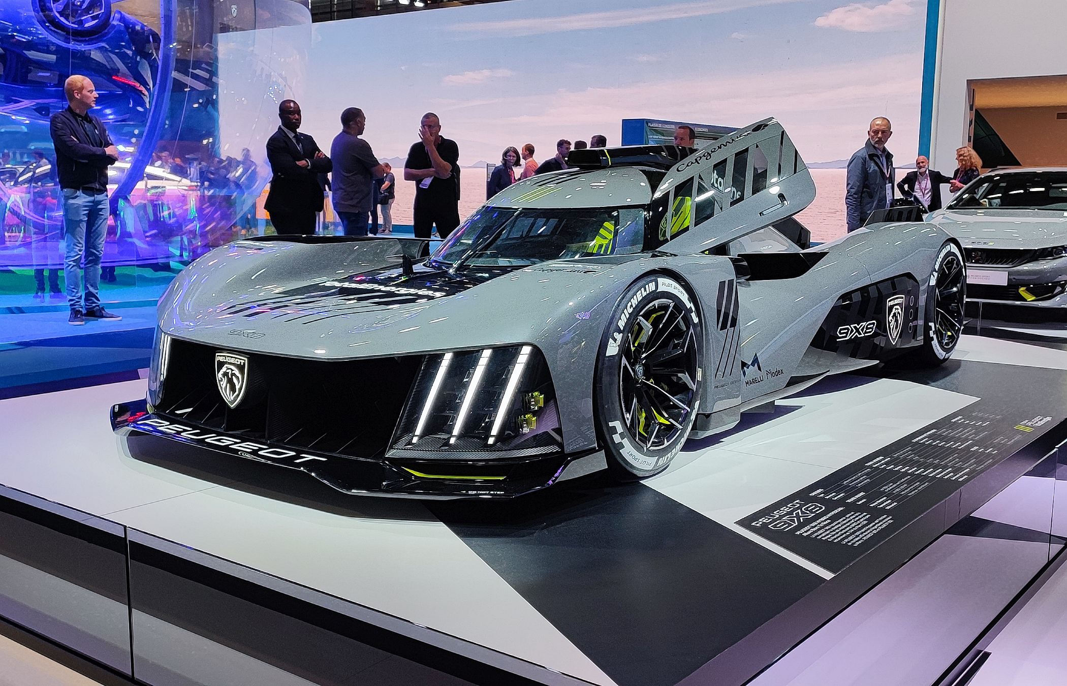 Por fim, o 9X8 Hybrid de competição também adorna o espaço da Peugeot em Paris, servindo como montra da competência tecnológica da marca francesa. Híbrido e com uma componente aerodinâmica particularmente inovadora, ao dispensar a asa traseira comum nos protótipos de Le Mans, este modelo prepara o ataque da marca às 24 Horas de Le Mans de 2023.