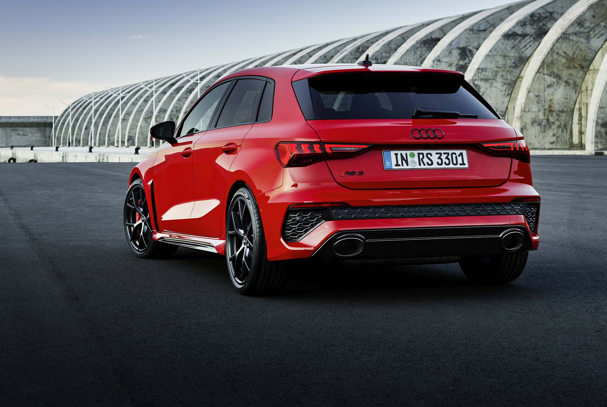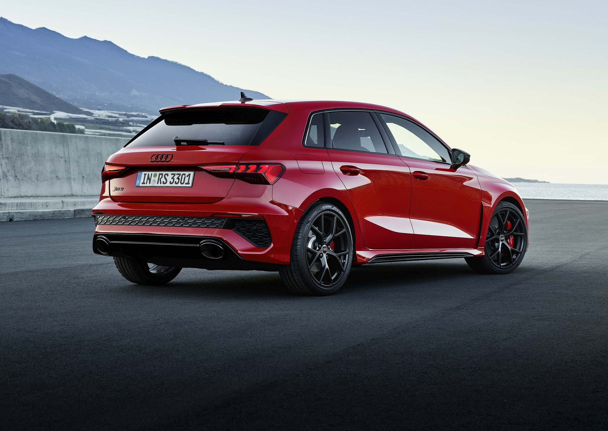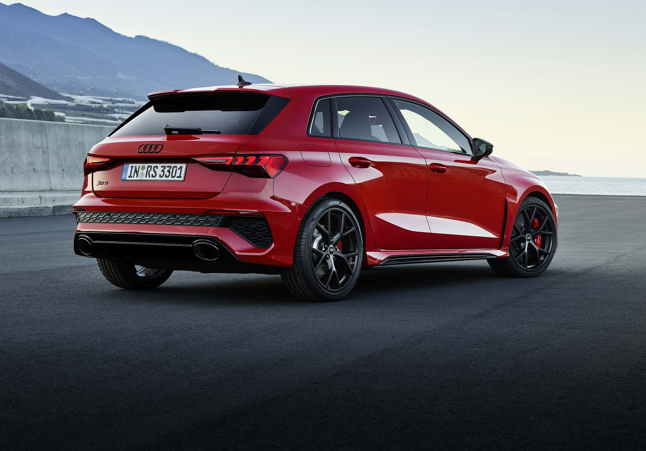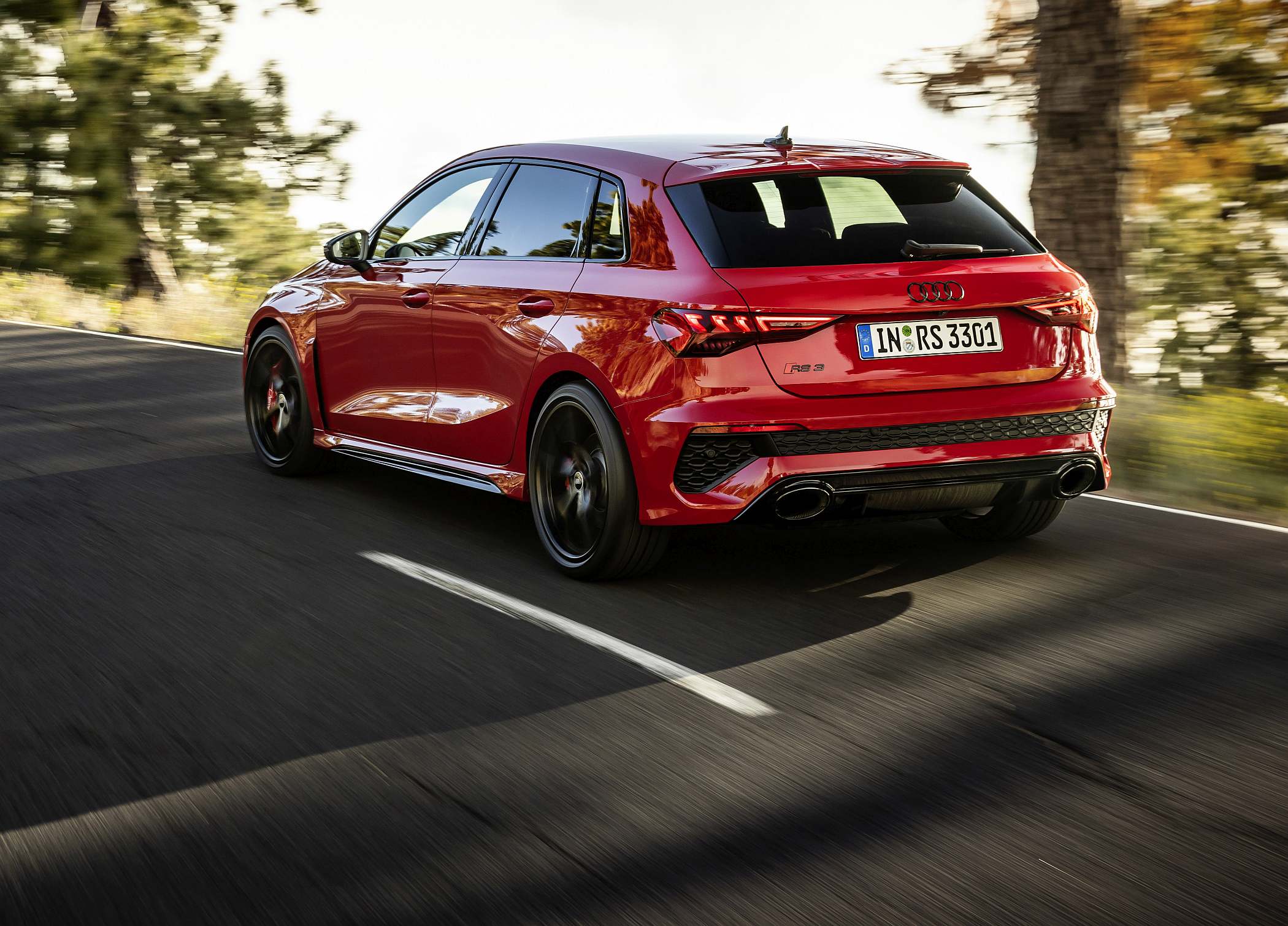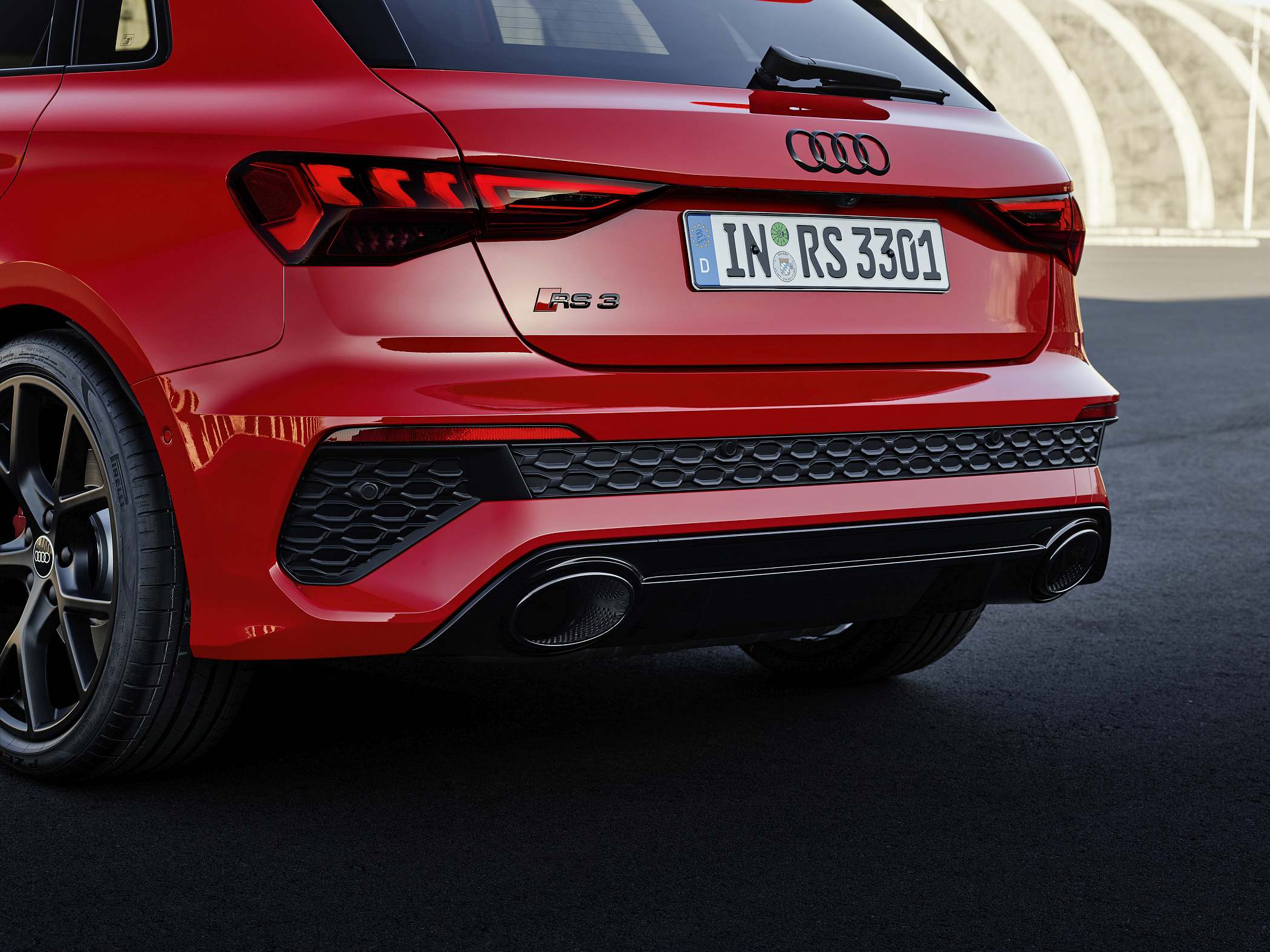As jantes de 19 polegadas são igualmente específicas deste modelo, havendo logo após a cava da roda dianteira uma saída de ar derivada daquelas que são usadas no desporto automóvel. A saia lateral compõe o visual mais ‘racing’. Já na secção traseira, o destaque vai para o grande spoiler superior e para o para-choques específico com difusor integrado e uma grelha também única, em ambos os casos com coloração preto brilhante. As duas saídas de escape revelam o foco dinâmico do novo RS 3, que beneficia ainda de vias mais largas face ao antecessor – 33 mm no eixo dianteiro e 10 mm no traseiro.
