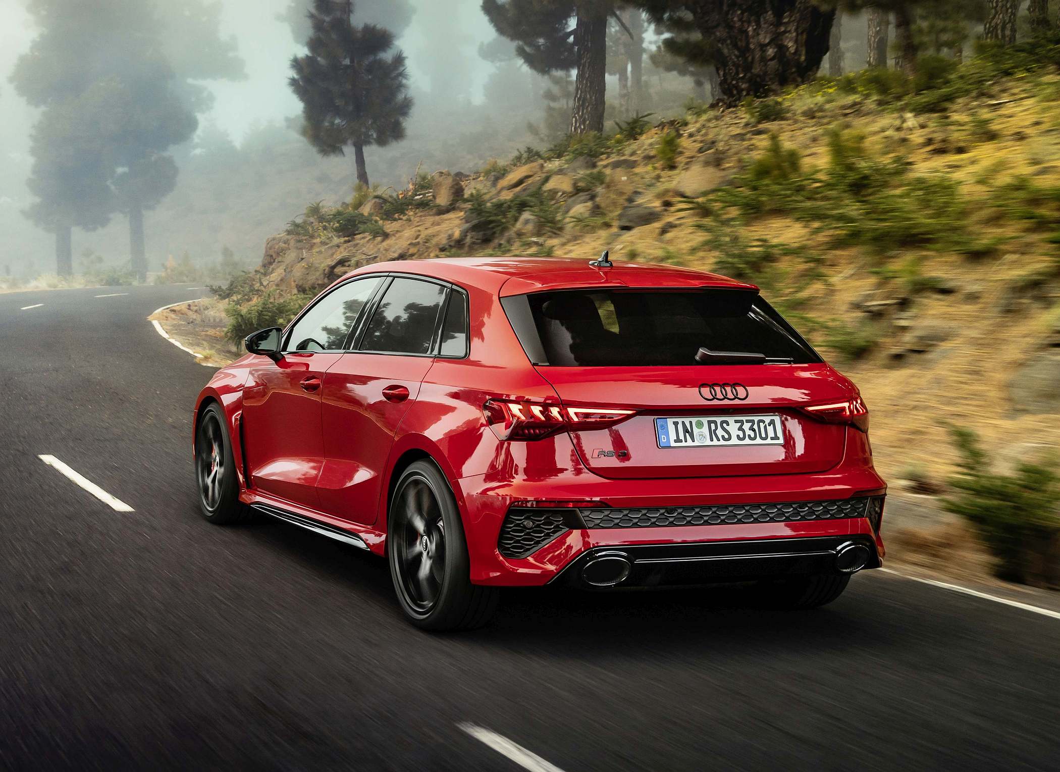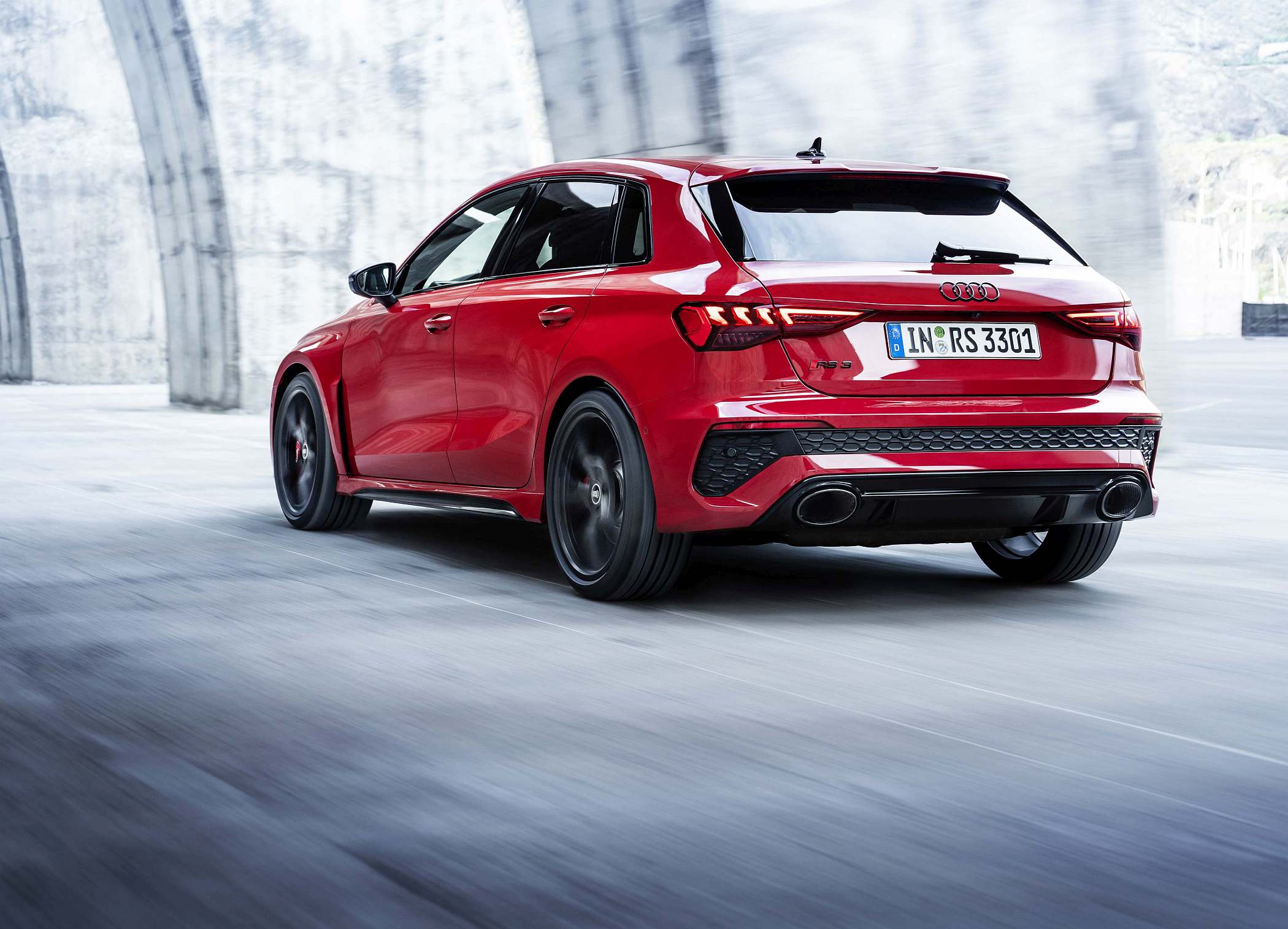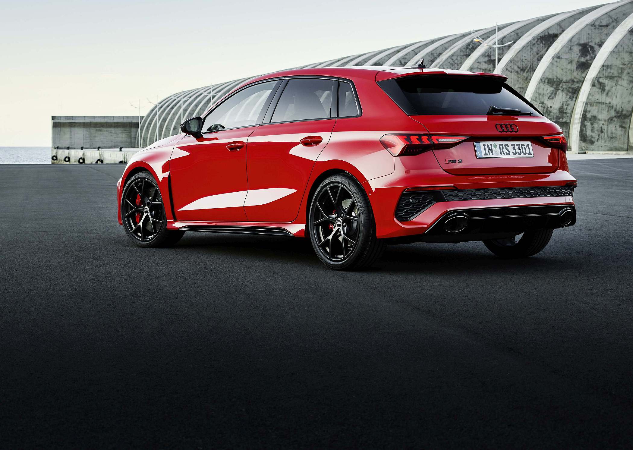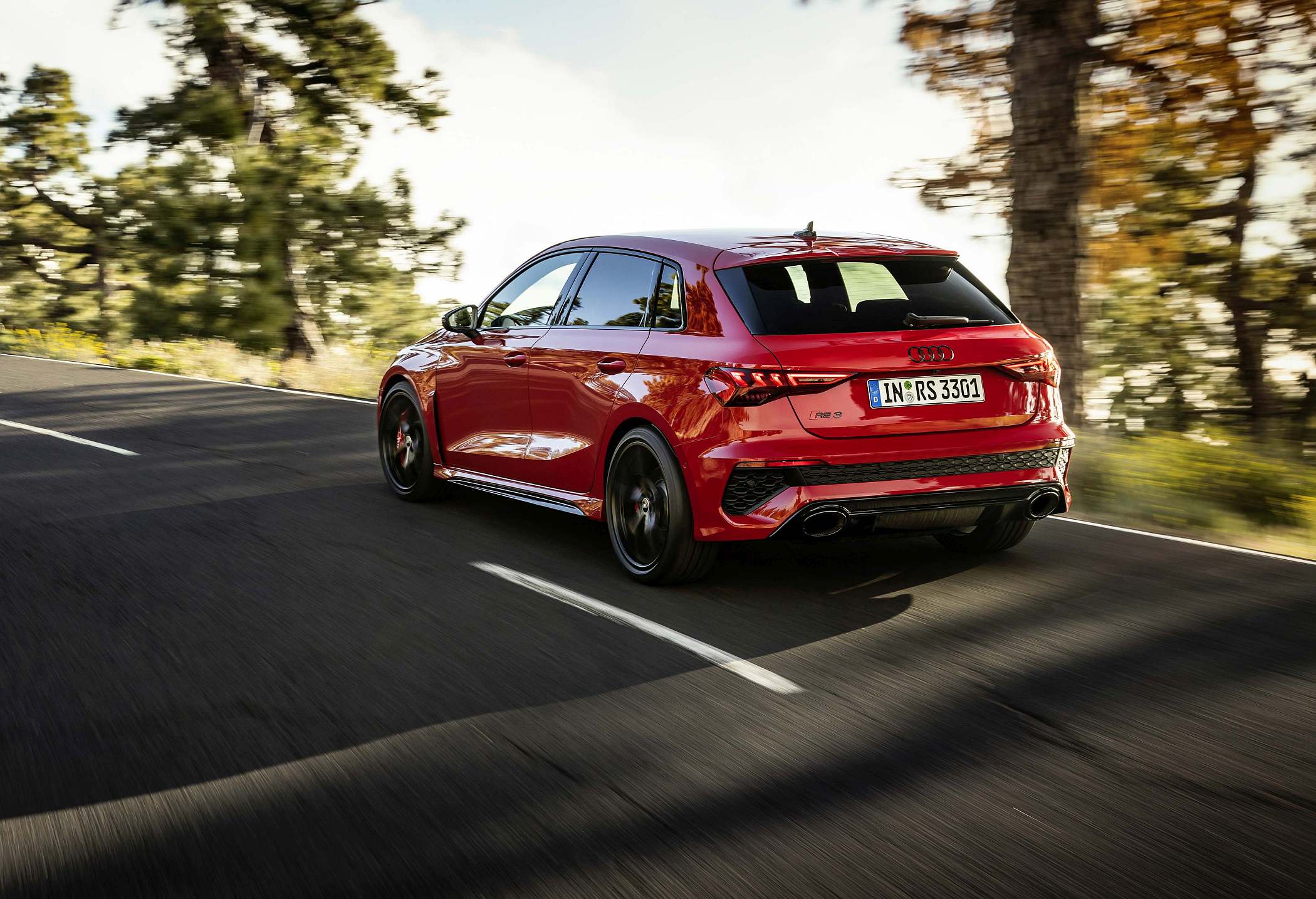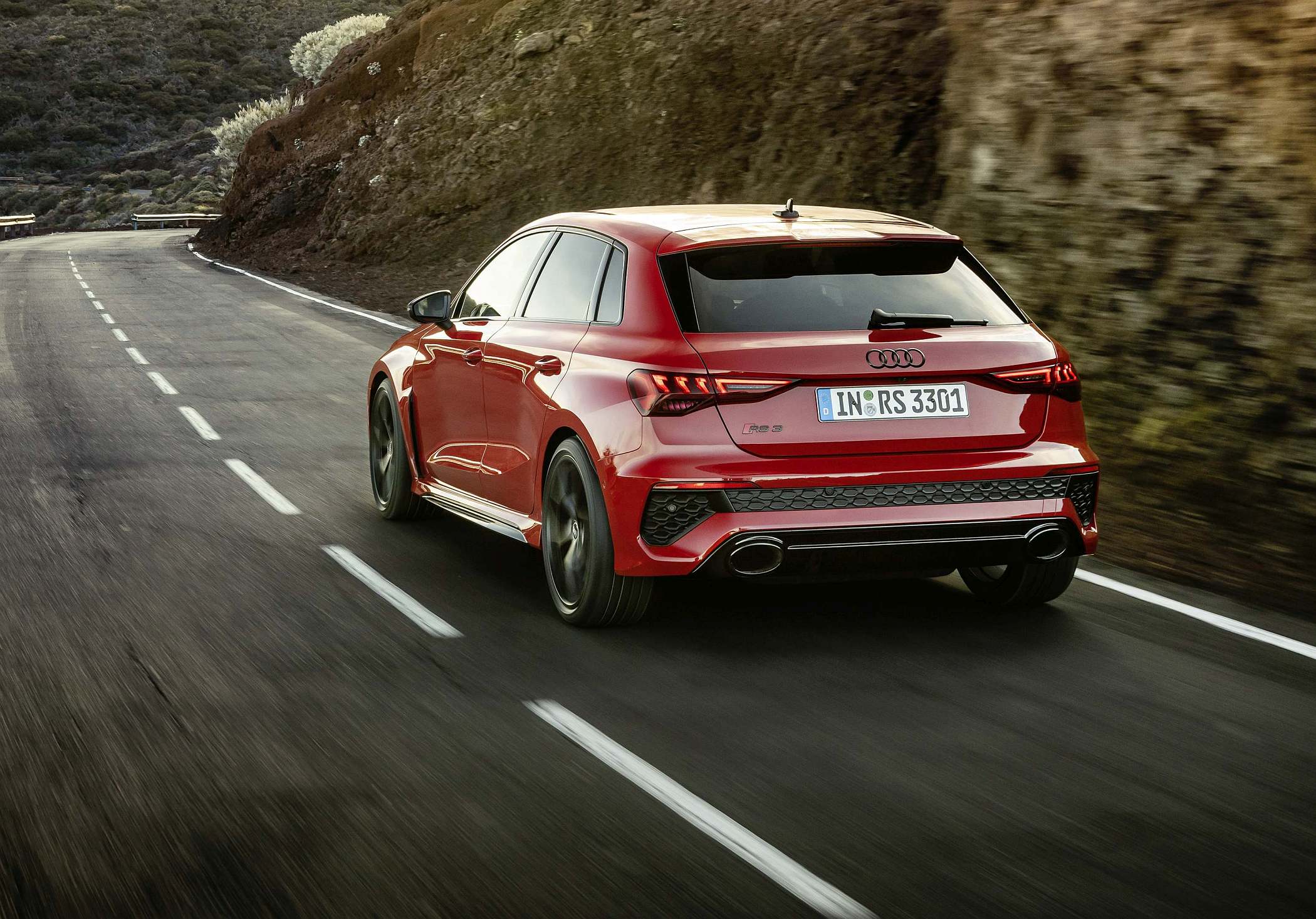 As jantes de 19 polegadas são igualmente específicas deste modelo, havendo logo após a cava da roda dianteira uma saída de ar derivada daquelas que são usadas no desporto automóvel. A saia lateral compõe o visual mais ‘racing’. Já na secção traseira, o destaque vai para o grande spoiler superior e para o para-choques específico com difusor integrado e uma grelha também única, em ambos os casos com coloração preto brilhante. As duas saídas de escape revelam o foco dinâmico do novo RS 3, que beneficia ainda de vias mais largas face ao antecessor – 33 mm no eixo dianteiro e 10 mm no traseiro.