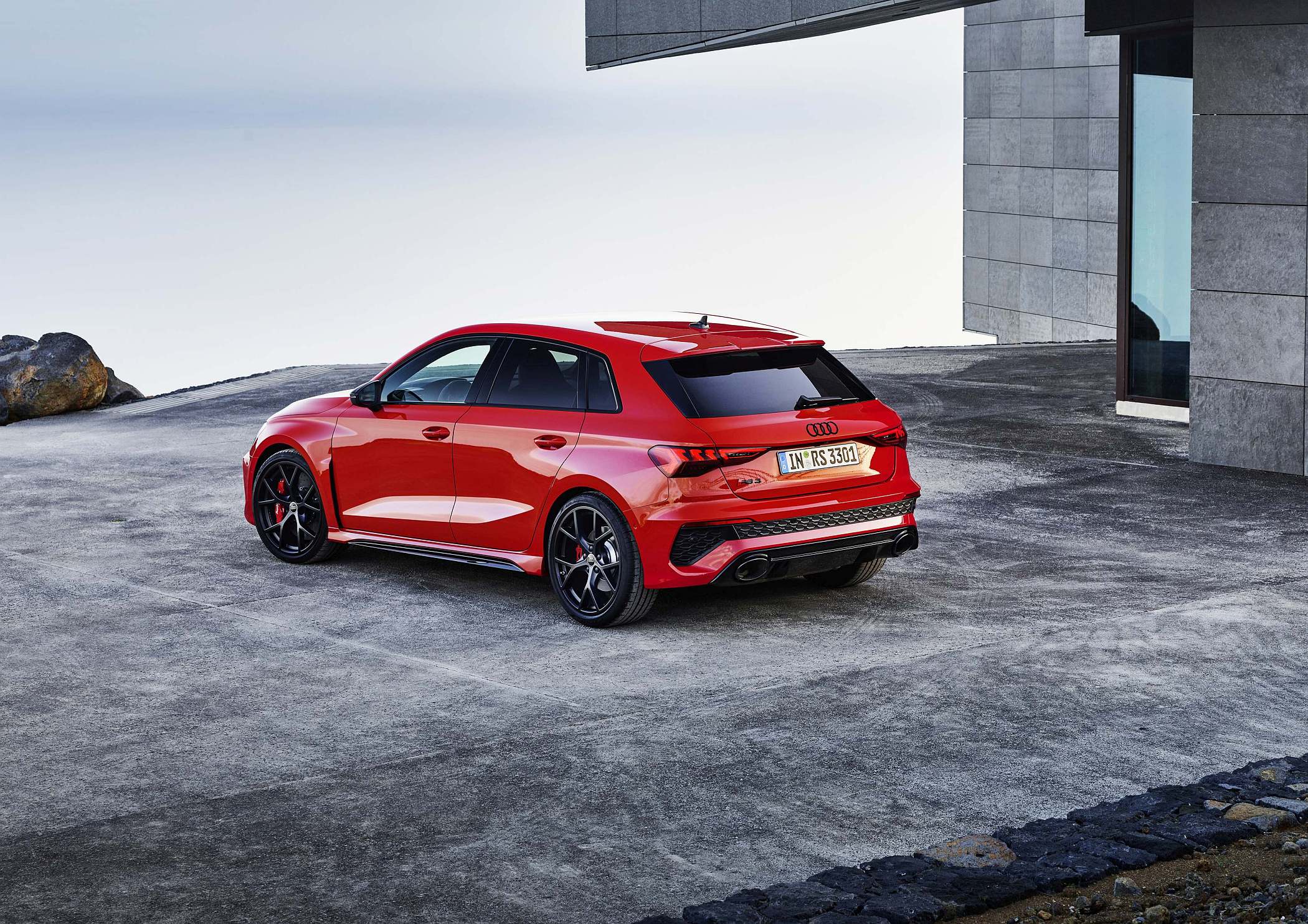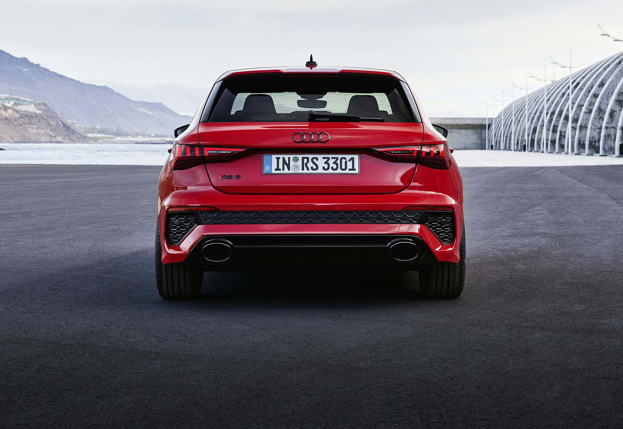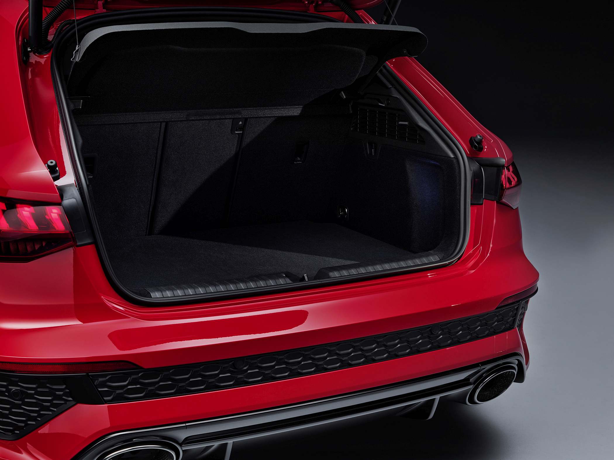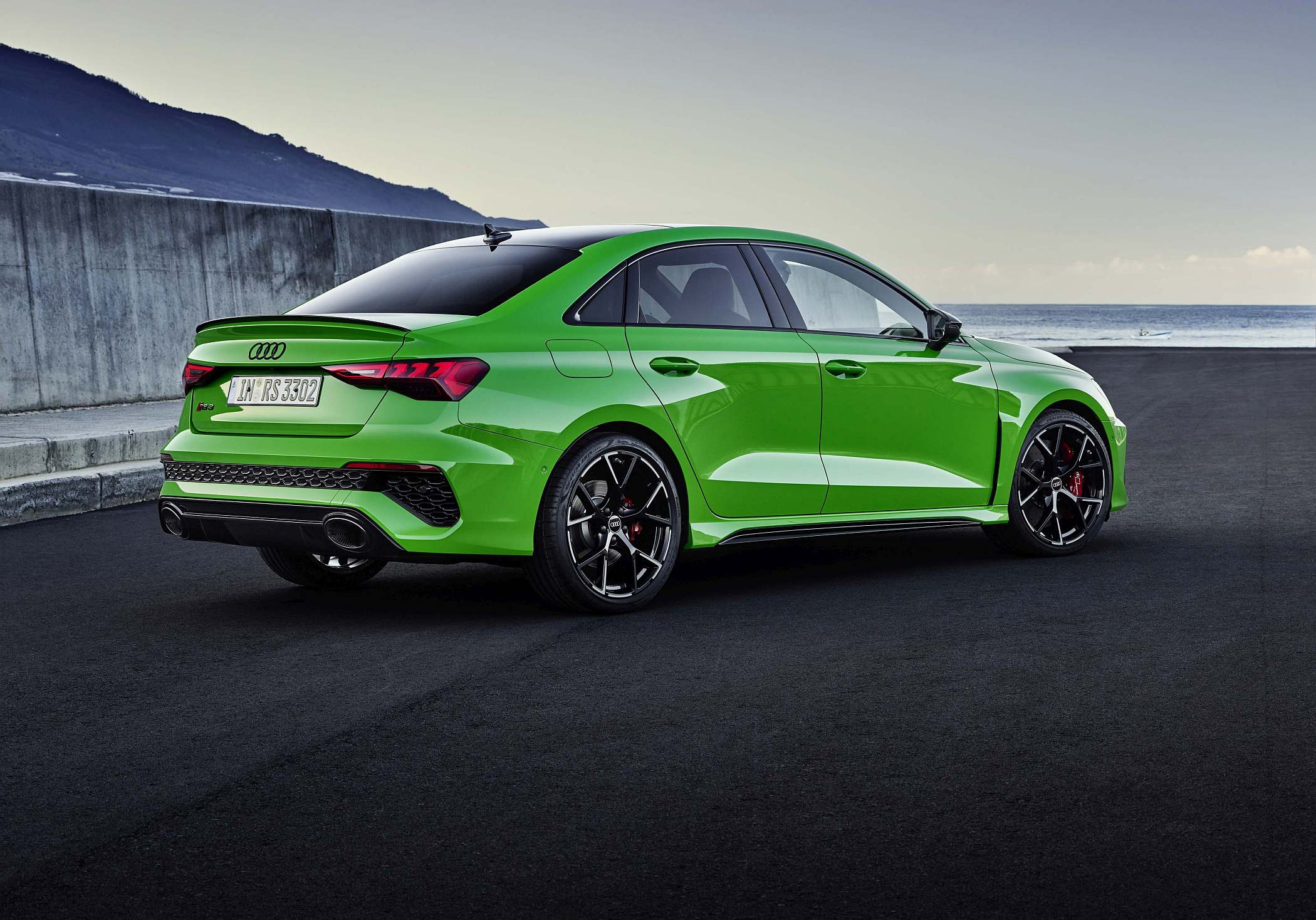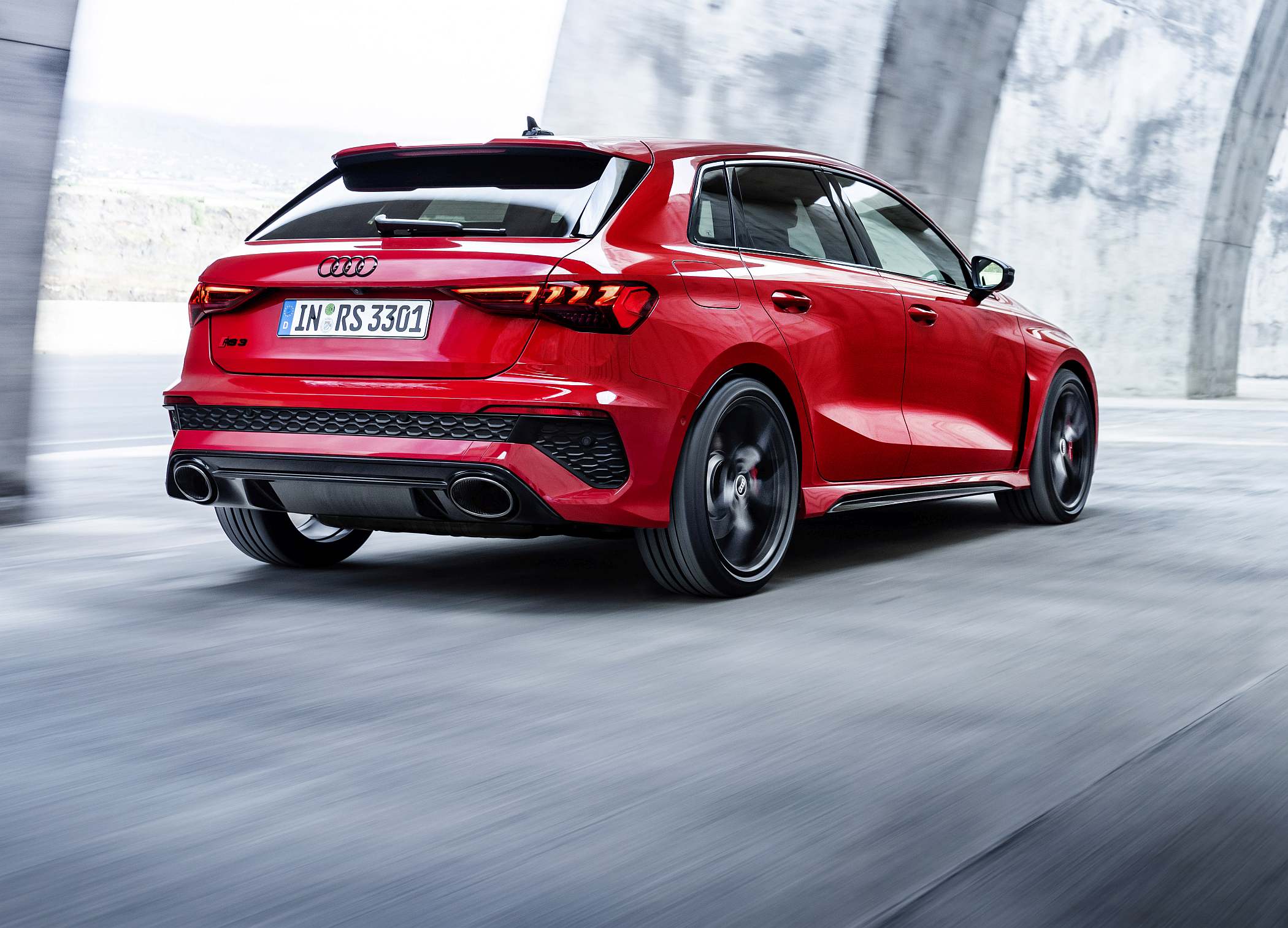 As jantes de 19 polegadas são igualmente específicas deste modelo, havendo logo após a cava da roda dianteira uma saída de ar derivada daquelas que são usadas no desporto automóvel. A saia lateral compõe o visual mais ‘racing’. Já na secção traseira, o destaque vai para o grande spoiler superior e para o para-choques específico com difusor integrado e uma grelha também única, em ambos os casos com coloração preto brilhante. As duas saídas de escape revelam o foco dinâmico do novo RS 3, que beneficia ainda de vias mais largas face ao antecessor – 33 mm no eixo dianteiro e 10 mm no traseiro.