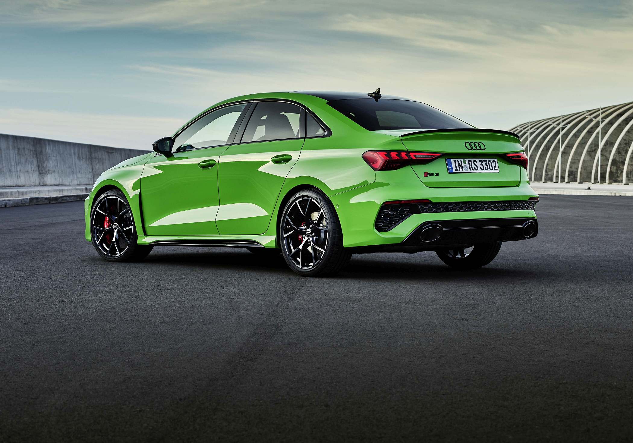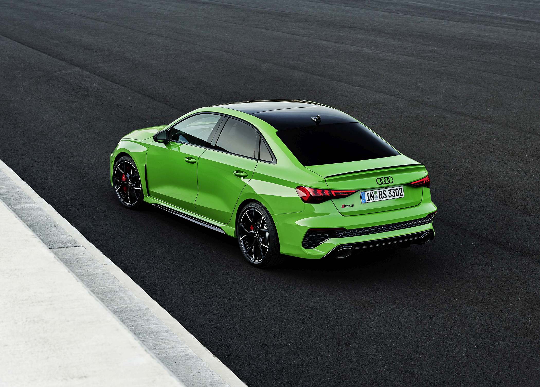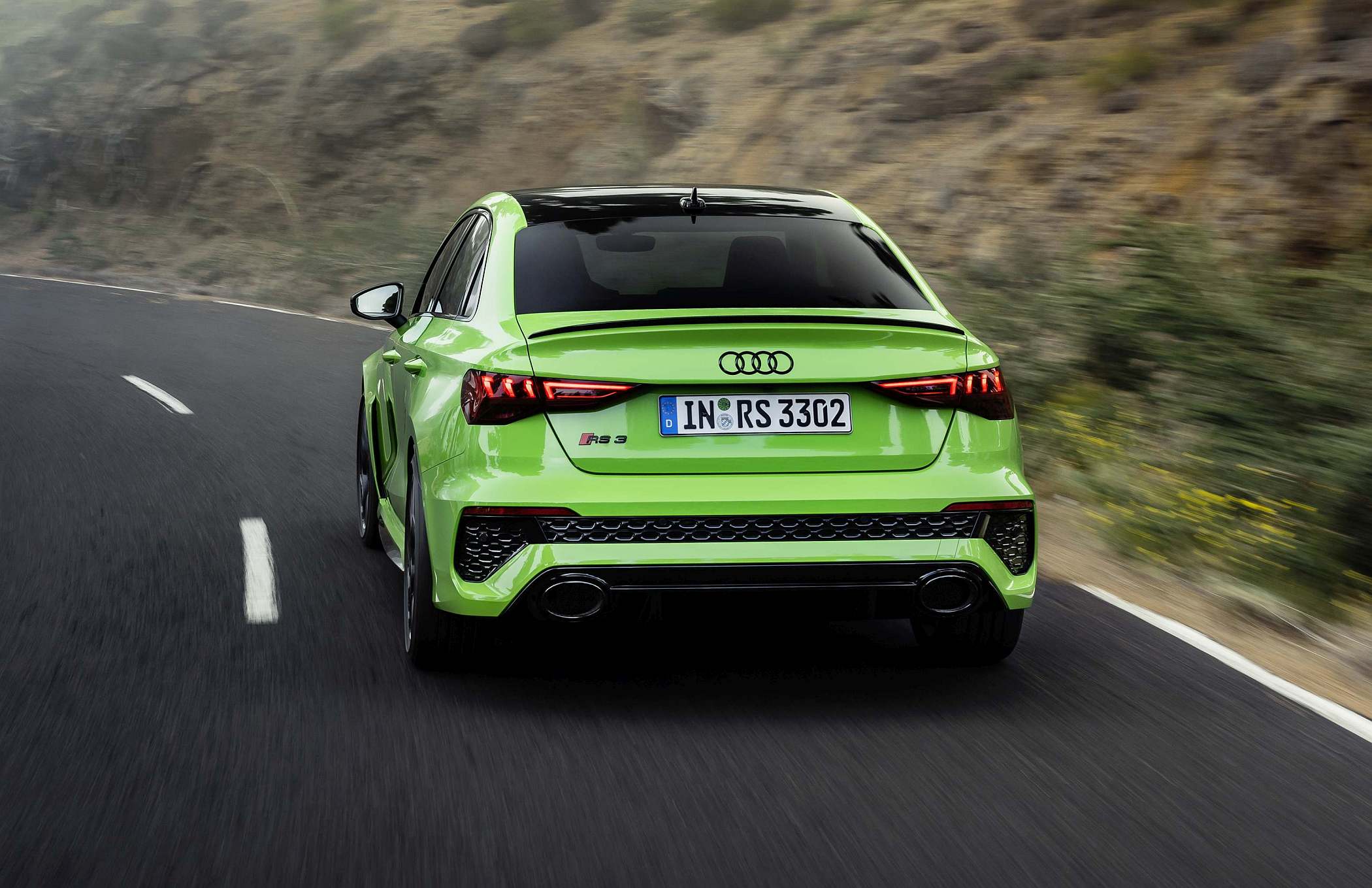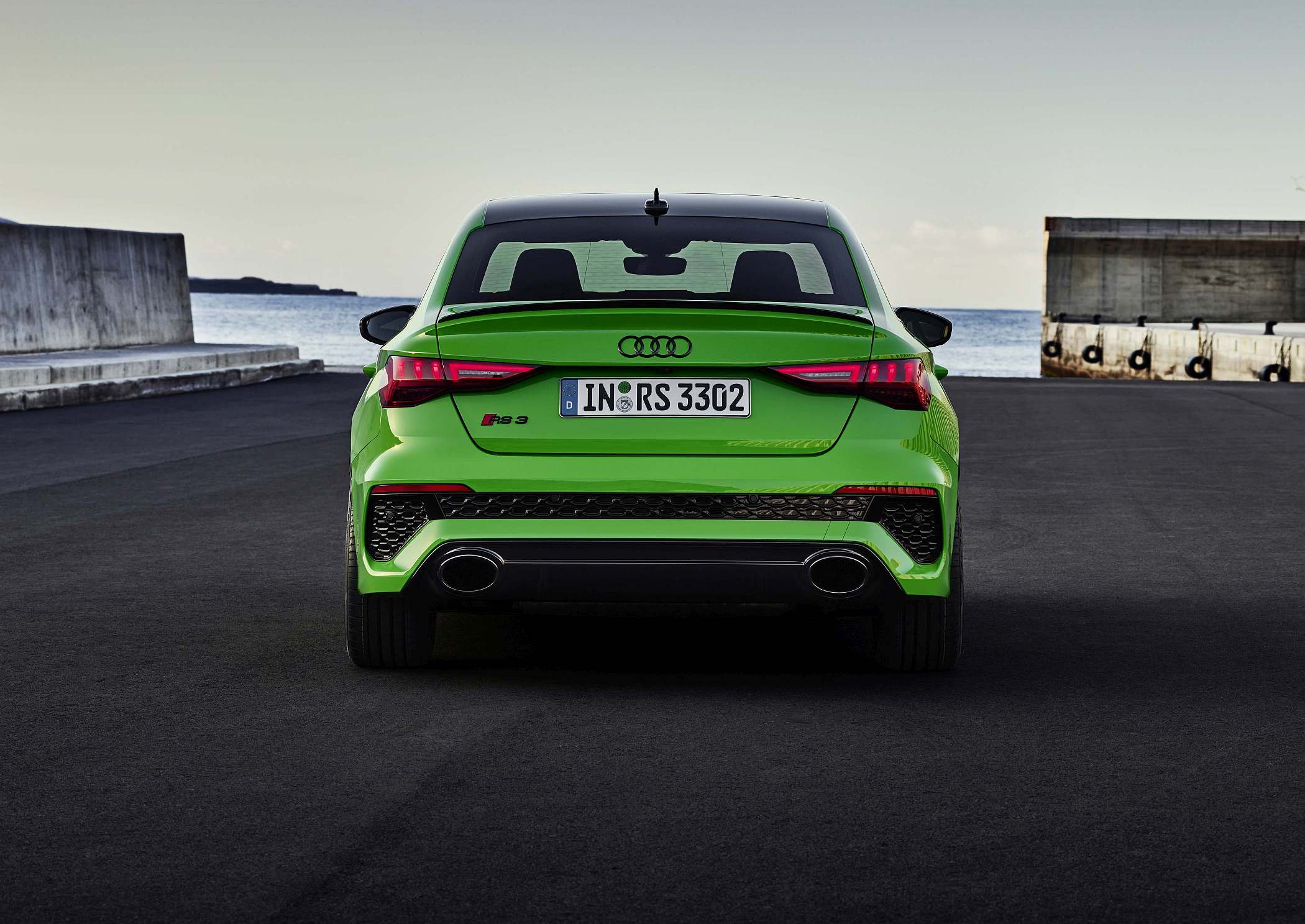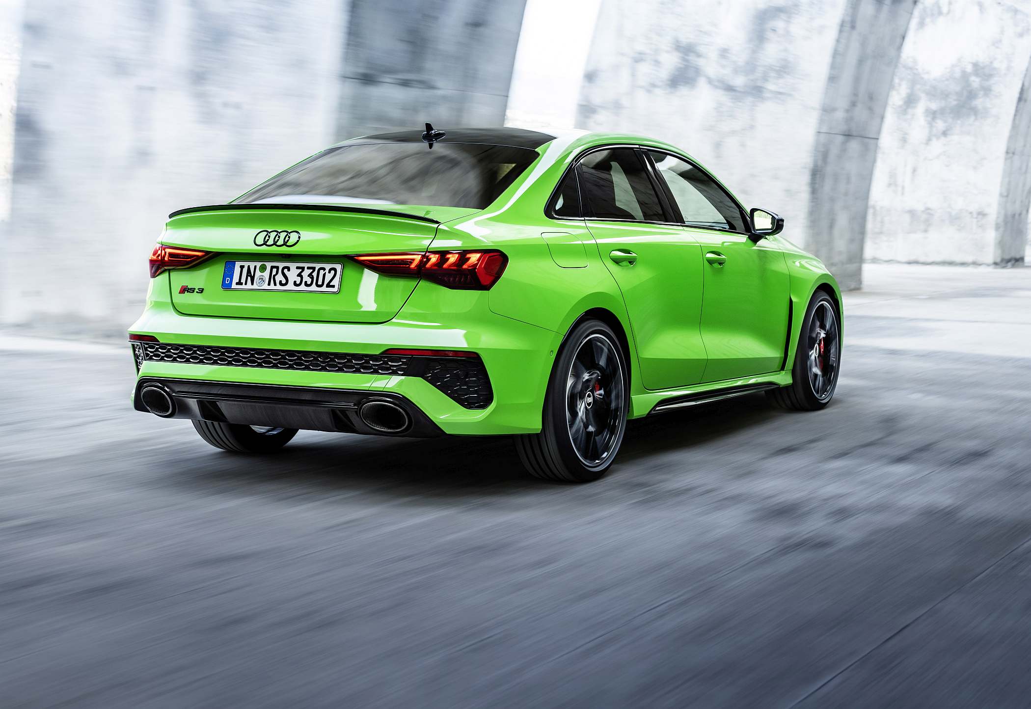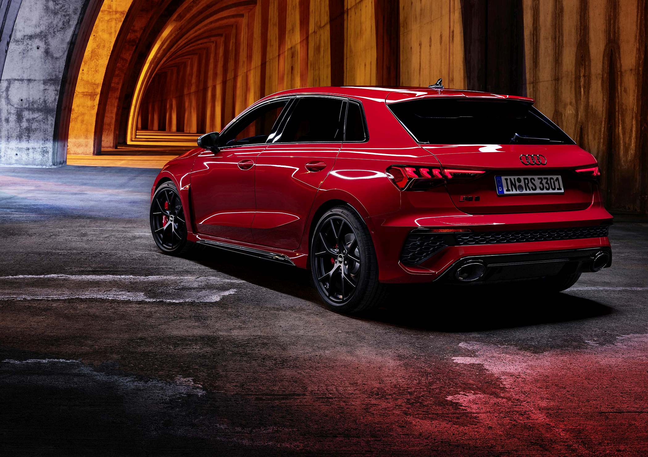 As jantes de 19 polegadas são igualmente específicas deste modelo, havendo logo após a cava da roda dianteira uma saída de ar derivada daquelas que são usadas no desporto automóvel. A saia lateral compõe o visual mais ‘racing’. Já na secção traseira, o destaque vai para o grande spoiler superior e para o para-choques específico com difusor integrado e uma grelha também única, em ambos os casos com coloração preto brilhante. As duas saídas de escape revelam o foco dinâmico do novo RS 3, que beneficia ainda de vias mais largas face ao antecessor – 33 mm no eixo dianteiro e 10 mm no traseiro.