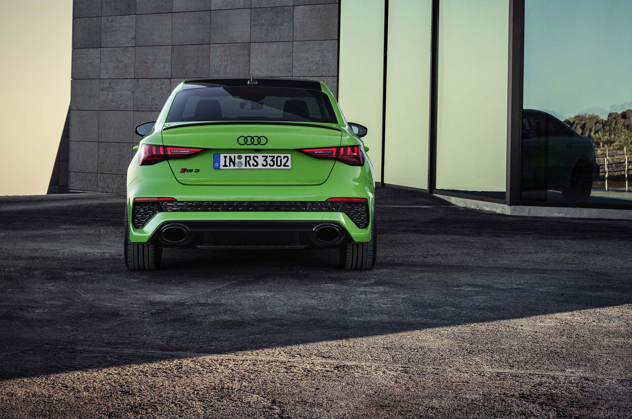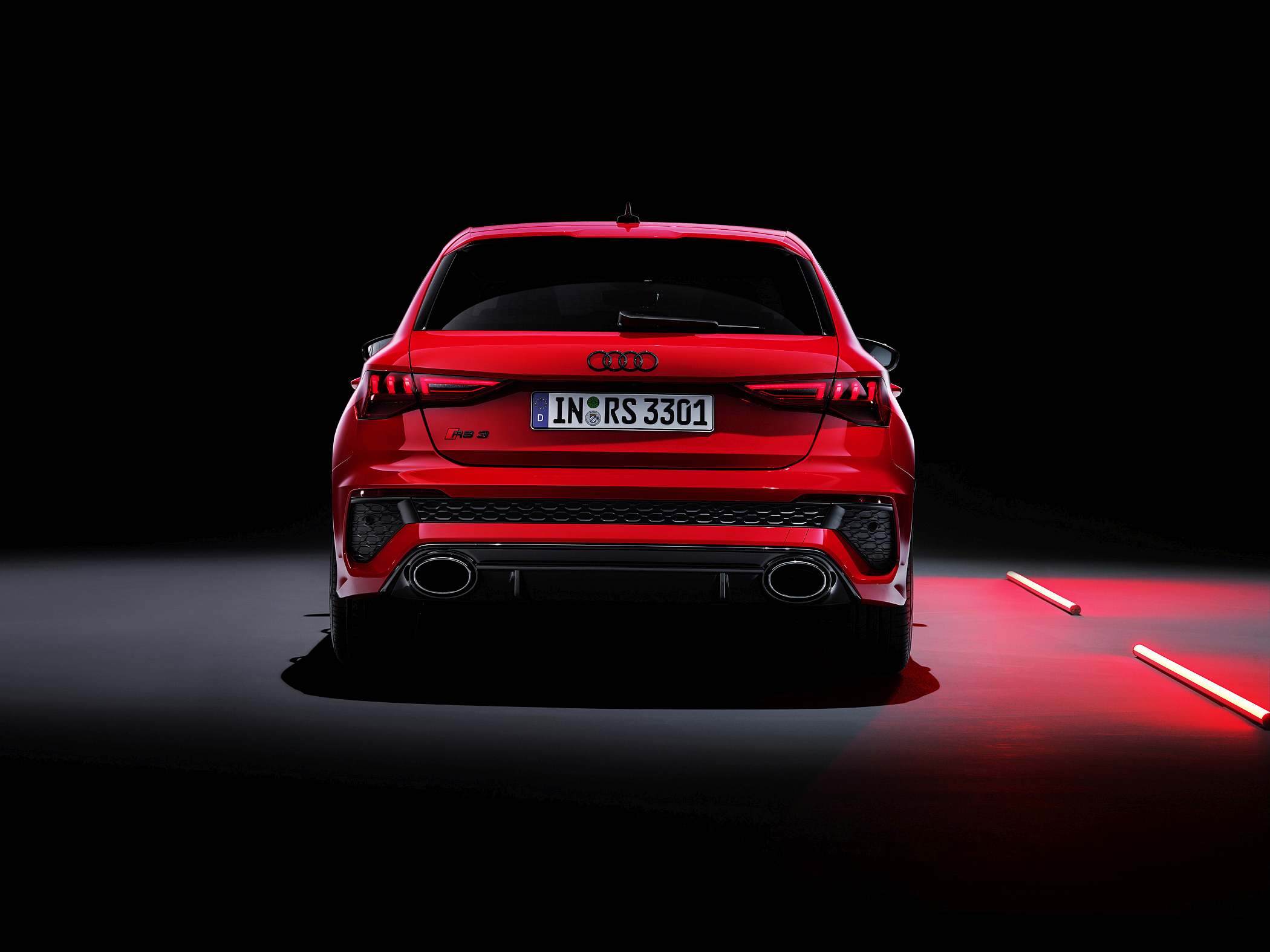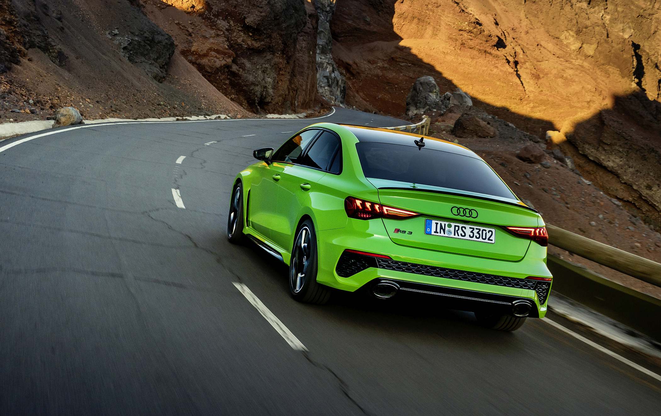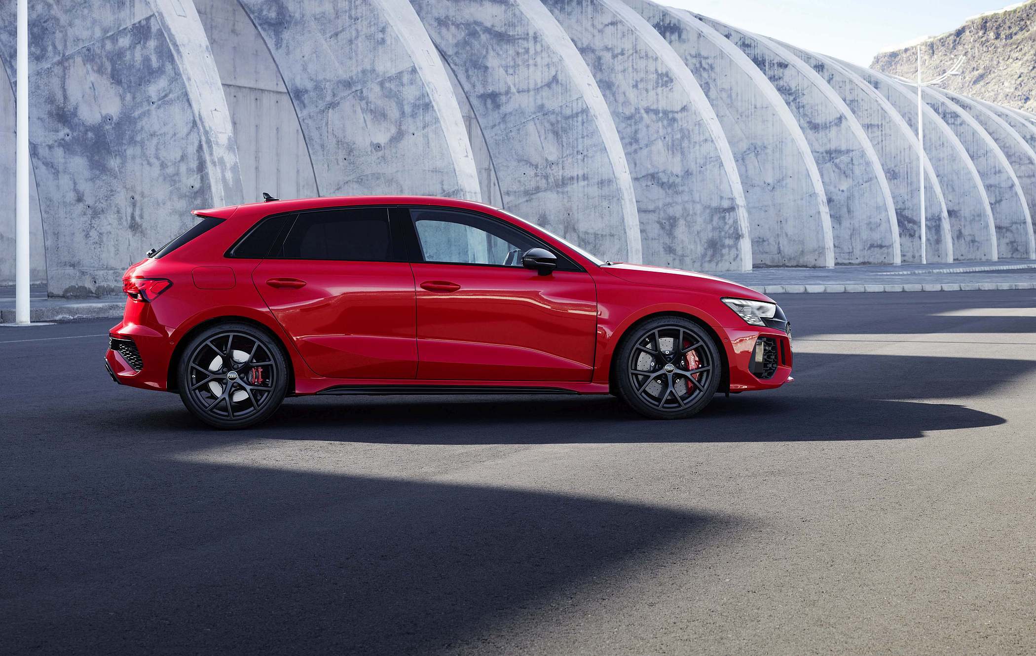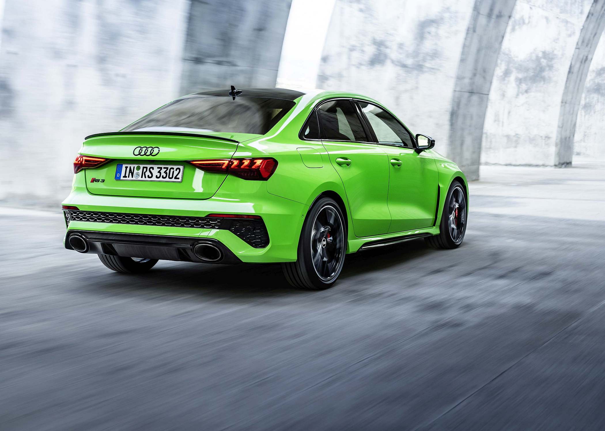 As jantes de 19 polegadas são igualmente específicas deste modelo, havendo logo após a cava da roda dianteira uma saída de ar derivada daquelas que são usadas no desporto automóvel. A saia lateral compõe o visual mais ‘racing’. Já na secção traseira, o destaque vai para o grande spoiler superior e para o para-choques específico com difusor integrado e uma grelha também única, em ambos os casos com coloração preto brilhante. As duas saídas de escape revelam o foco dinâmico do novo RS 3, que beneficia ainda de vias mais largas face ao antecessor – 33 mm no eixo dianteiro e 10 mm no traseiro.